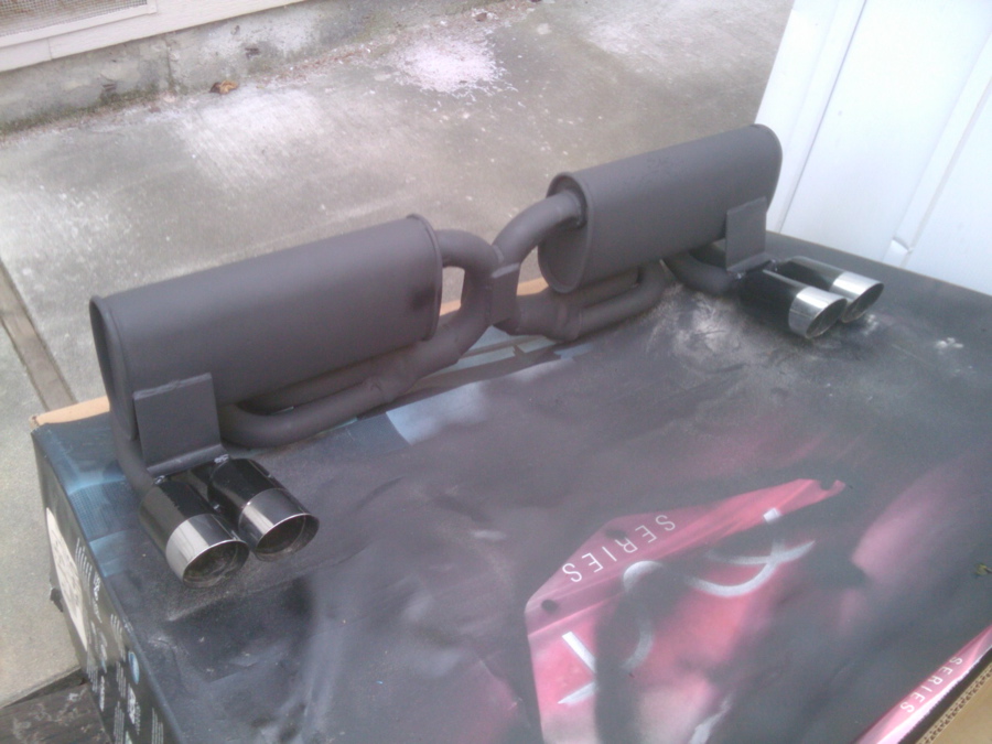car was rolled out so it could be moved to the rack to make sure all the body panels are aligned correctly and all else is straight before the real body work begins... (IMG:style_emoticons/default/piratenanner.gif) here are some shots of the exhaust parts I media blasted and then painted...came out pretty good.. Attached thumbnail(s) |