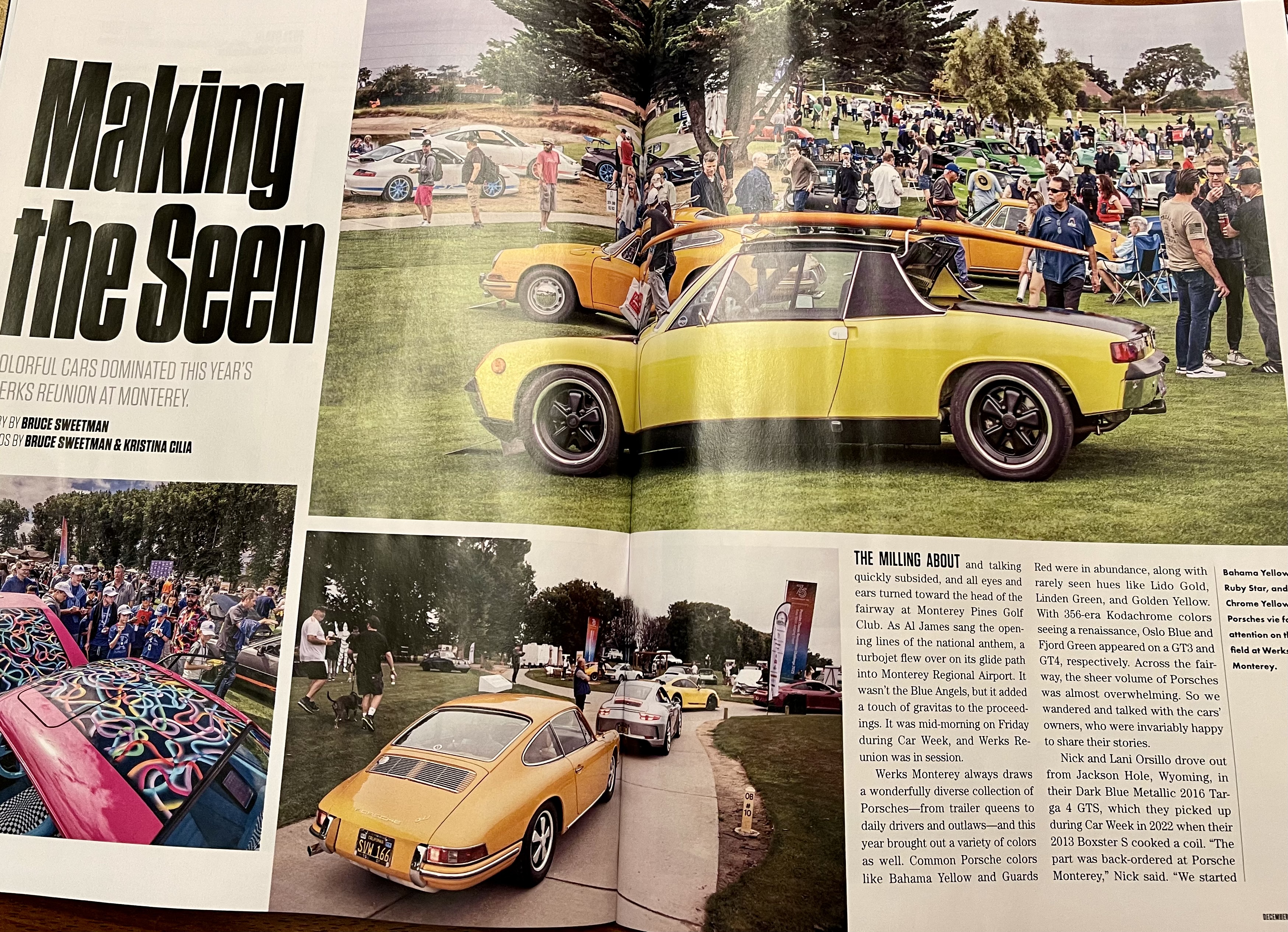 As I get older the 914 becomes more and more of a challenge to get in and out of with out a crane to lift me in and out, although I certainly still love my 914, which at this point will soon become Winston’s (my son) 914. So Winston and I did the Luftgekuhlt Mare Island, and the Werks reunion. Plus a couple of runs through the local mountain roads. So this morning I received my copy of the PCA magazine and much too my surprise my little chrome yellow favorite set of wheels right there dominating a center spread, yes 914s are getting more recognition.