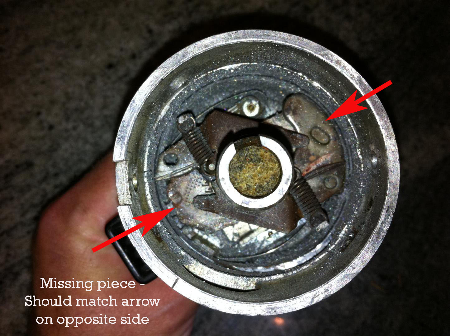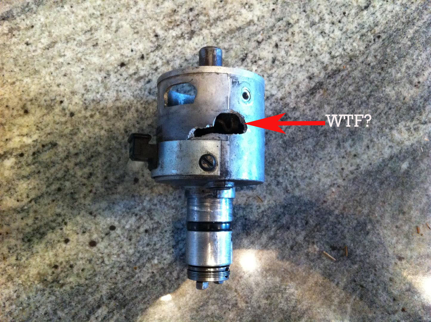 Bosch distributors do that. Blew one in my 1973 Superbeetle. Spring went and the weight slung out through the side. Got a new one for $25 back then. |