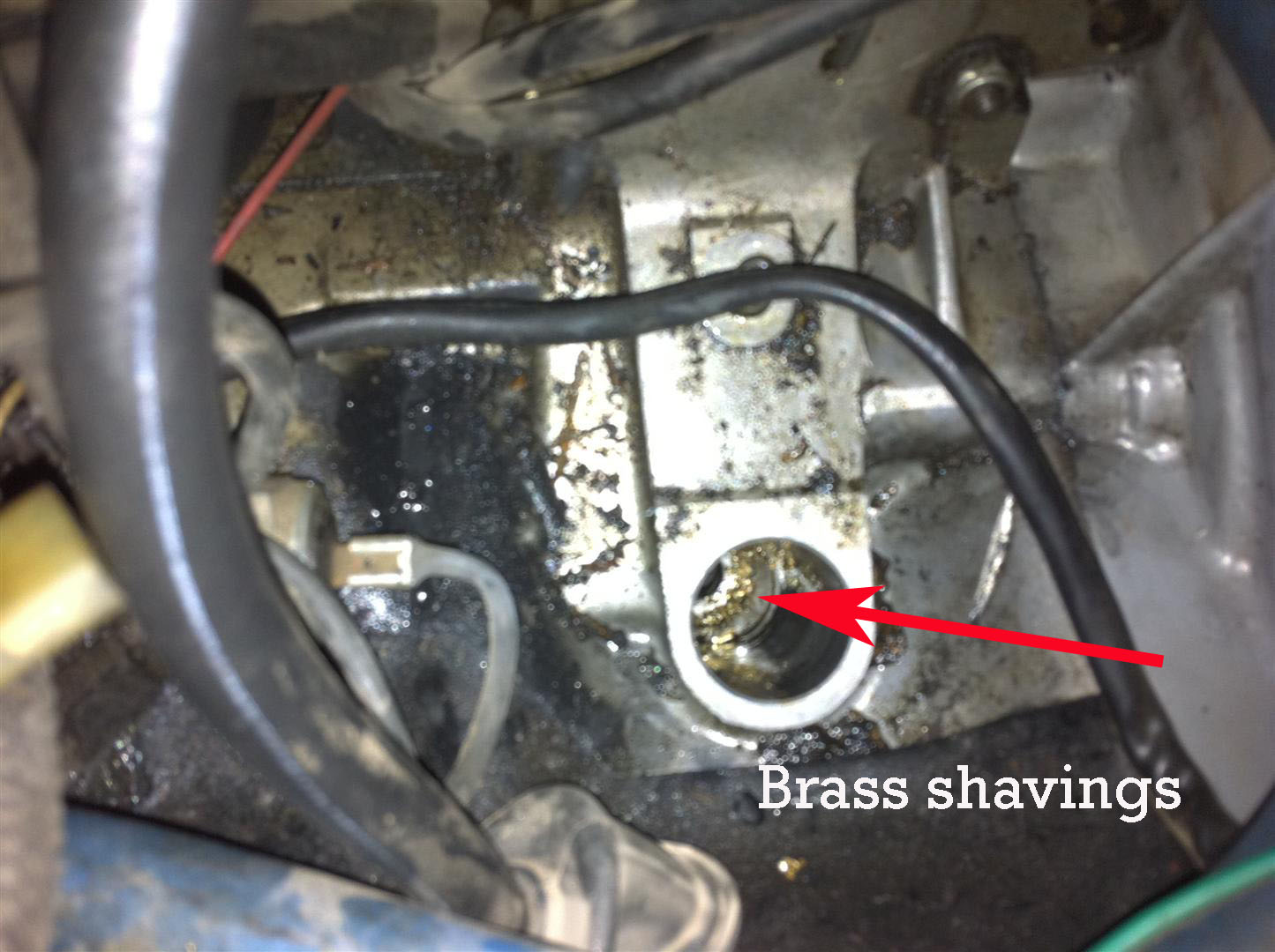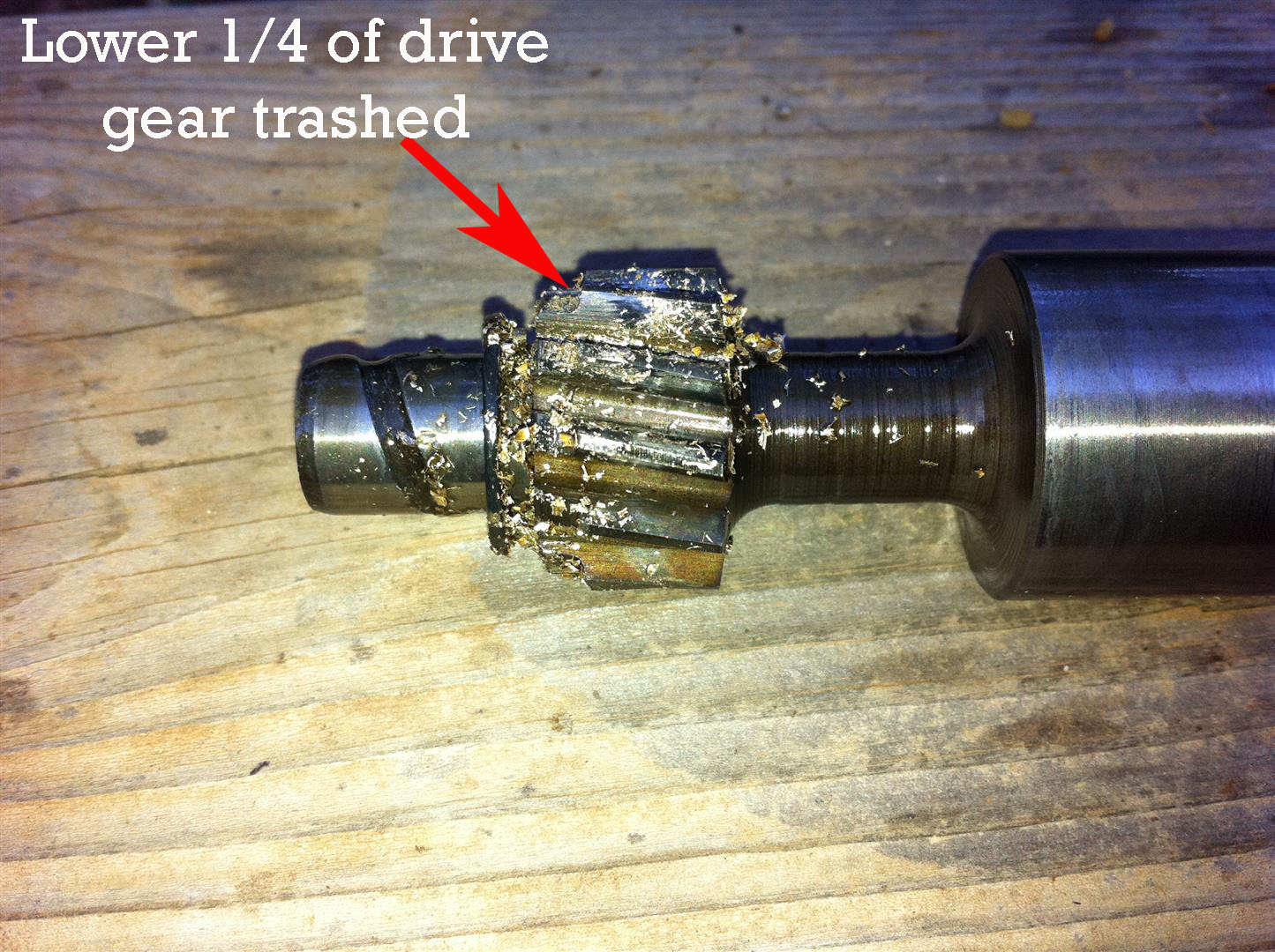 bigkensteele is right about splitting the case. The brass drive gear is tatered now after its run-in with the steel drive shaft. Even if you could flush the chunks & shavings out of the engine, the two gears might not engage in a trustworthy manner. Judging from how my drive gear looked when I removed it, the poor fit between the gears would lead to more brass shavings over a prolonged period, meaning you might have to replace a bunch of parts instead of just one.