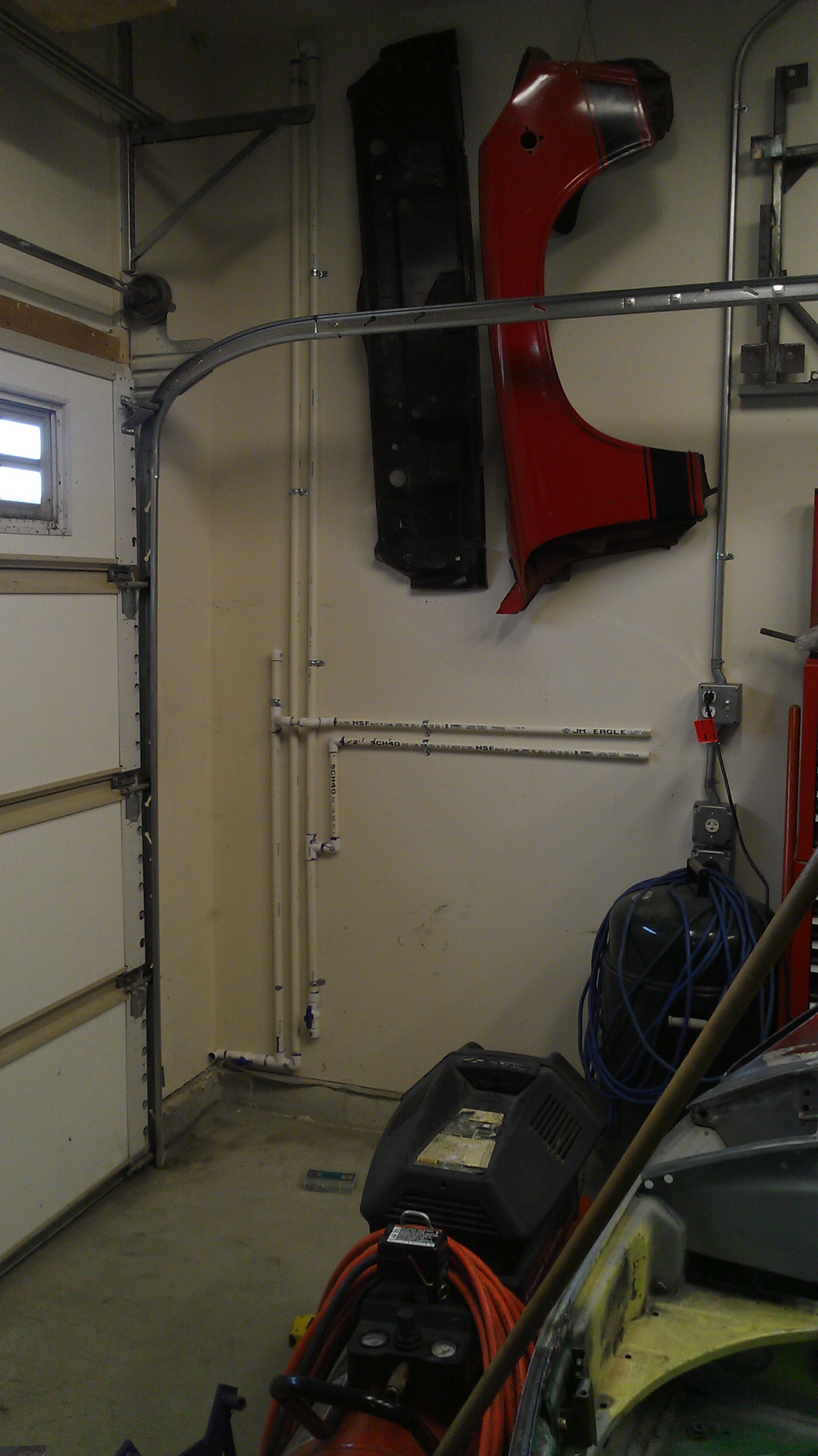 I used all black pipe in my first shop. This one I'm renting now. So I ran the overheads in PVC. But all the down pipes that are at the area that a human could come in contact or be in harms way I converted to steel. Works pretty good. |
