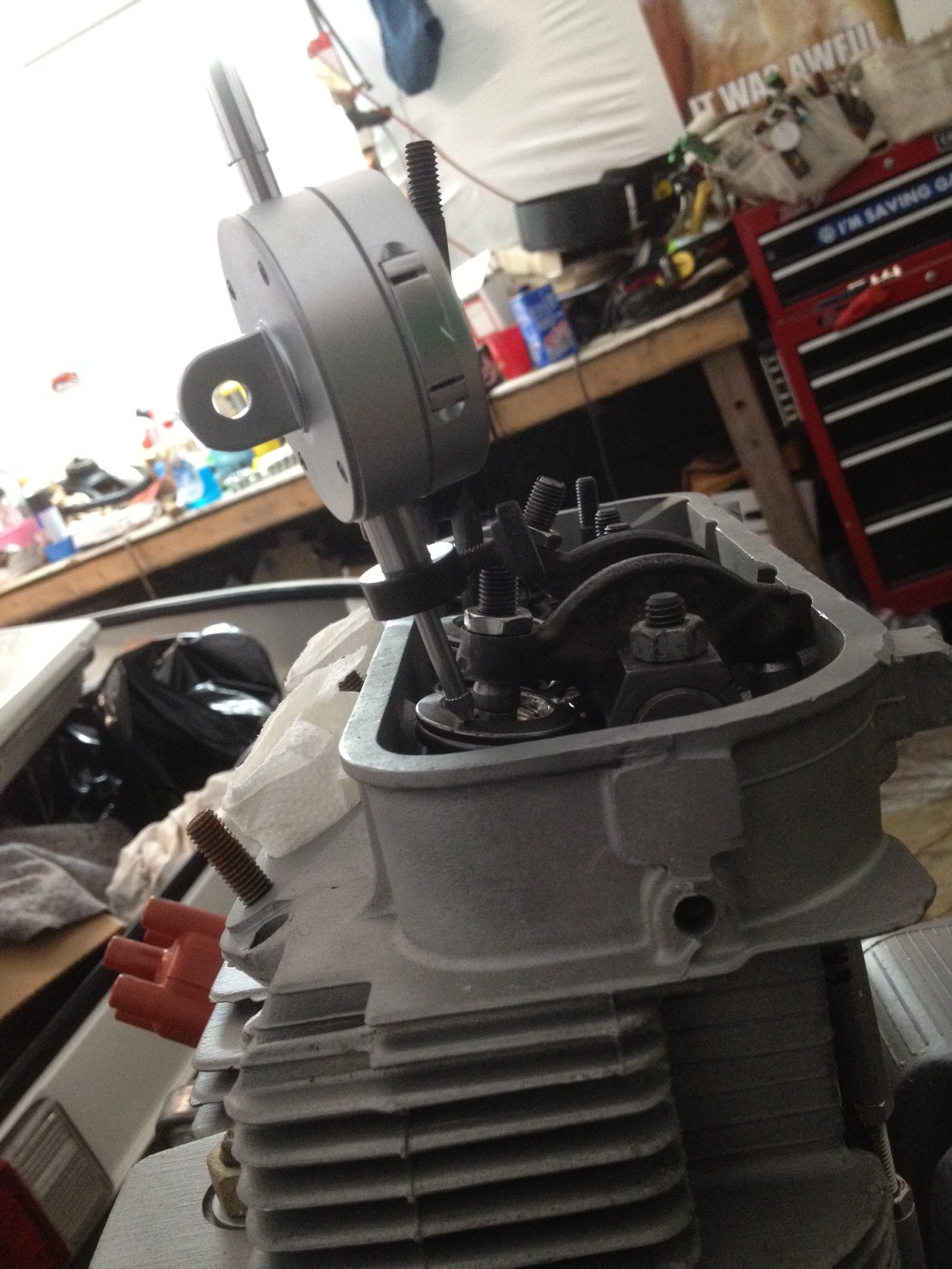 Looking at your last picture, it's pretty evident that you failed to follow one of Jake's first instructions, one that's also mentioned in an early post in this thread. Your dial indicator probe is NOT parallel with the axis of the valve. In fact, it's at a pretty steep angle. You need a longer tip on the dial indicator, and it needs to be positioned over the retainer so the shaft lines up with the center line of the valve stem. Readings at an angle, which is probably not repeatable, aren't gonna be as accurate as they need to be, and the tip is apt to deflect, making it even worse.