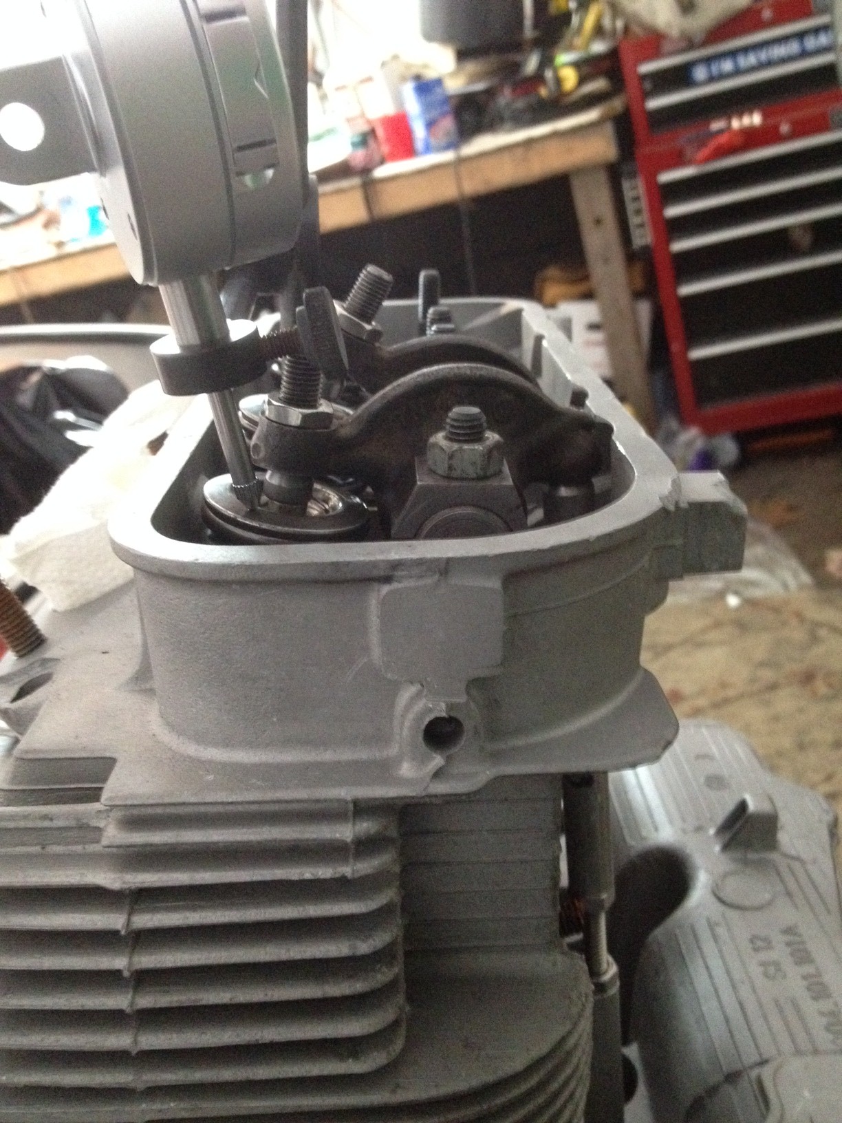 Looking at your last picture, it's pretty evident that you failed to follow one of Jake's first instructions, one that's also mentioned in an early post in this thread. Your dial indicator probe is NOT parallel with the axis of the valve. In fact, it's at a pretty steep angle. You need a longer tip on the dial indicator, and it needs to be positioned over the retainer so the shaft lines up with the center line of the valve stem. Readings at an angle, which is probably not repeatable, aren't gonna be as accurate as they need to be, and the tip is apt to deflect, making it even worse. Now for the Krustiness you've all been waiting for! Making the rocker assembly mounting studs 10mm is NOT an "update". It's just making them bigger, as Porsche (and VW) never introduced this change in later engines ............... The Cap'n Another astute observation CK. I have corrected the angle of the gauge. Thank you for the correction of semantics, however useless that information is, it is still entertaining. (IMG:style_emoticons/default/poke.gif) What do you think about the lack of adjustment? I did machine the rockers for more clearance but it's still tight. I like the idea of plenty of adjustment. You start out too close and it could end up being a nightmare down the road. I agree with the others who have suggested shimming the rocker stands. A few thousandths should be OK, but too much shimming can allow the rockers to hit the valve covers. The Cap'n |