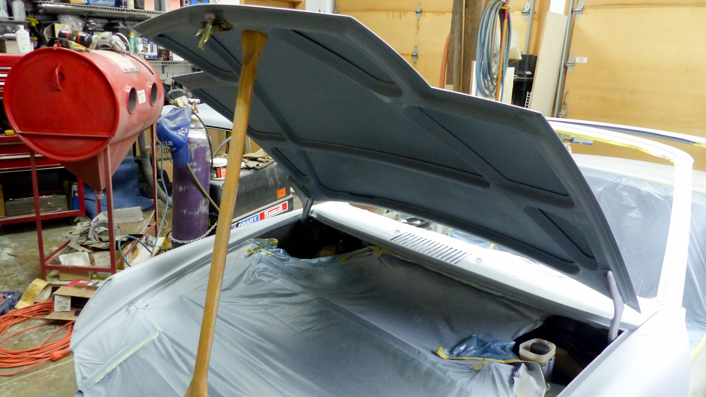 Back to doing fun stuff while I let the high build primer rest. I decided to mount the front trunk lid so it would be in its final shape when I do the final blocking. All of the 914s I've owned had a bit of spring flex to the lid when shut. I assume that is by design. Anyway, I blasted the hinges and installed them and the latch.