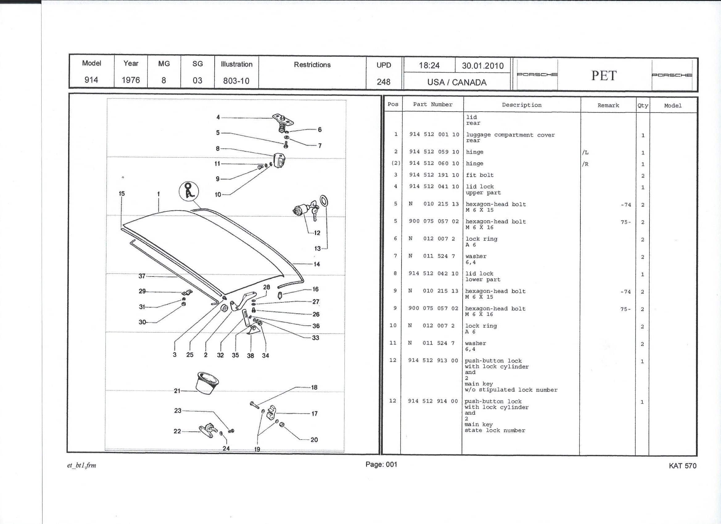 On my 76 the white plastic clips (one of which has been broken for years) are fastened in the rear trunk with what appear to be large rivets. It seems these will have to be drilled out. Is anyone familiar with these? Are nuts and bolts a reasonable substitute? The 914 PET shows these clips to be fastened with M6 x 12 hex head bolts, perhaps on early models. Are there captive nuts in place for these? See 22, 23, and 24 on the PET sheets. Attached thumbnail(s) |