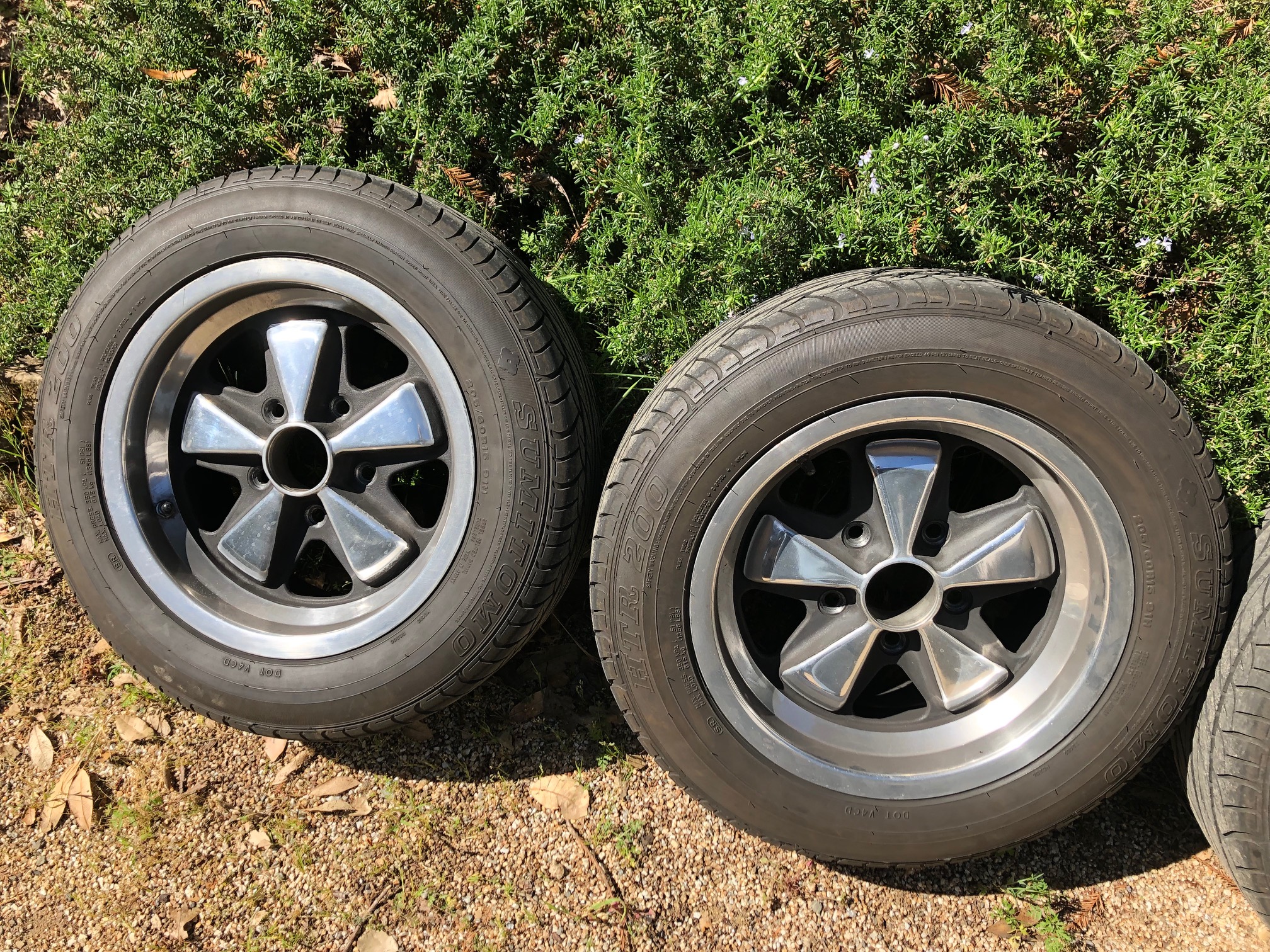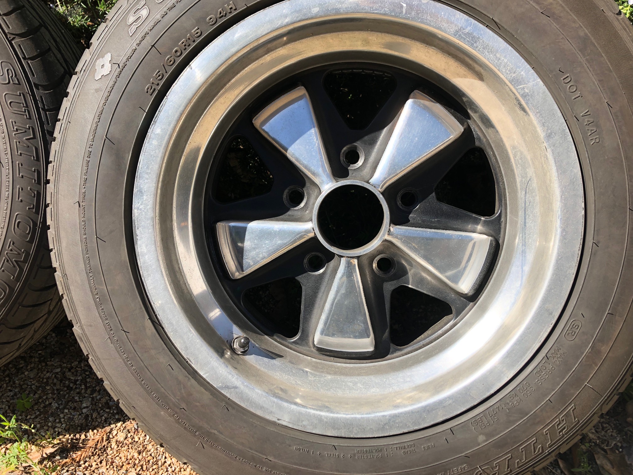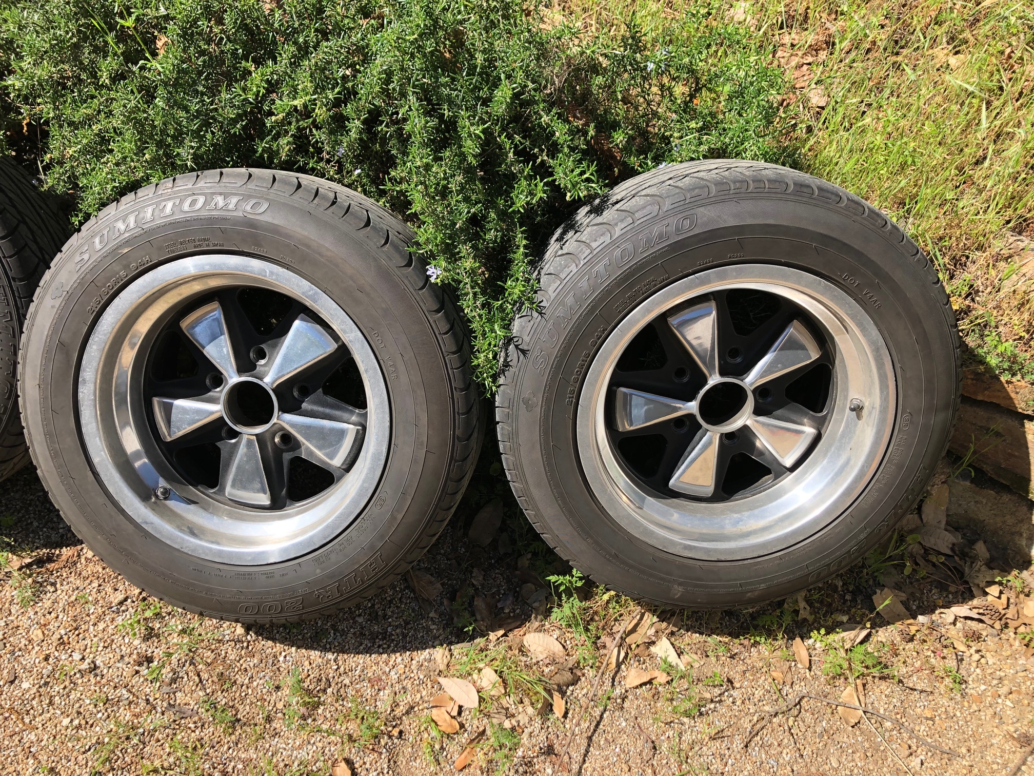 Two 7Jx15 and two 8Jx15 replica Fuchs. I used these on my GT replica, no issues with them; I just switched to different rims. The rims are in good condition but there are some minor scratches and road rash. The tires are 205/60/15 and 215/60/15 Sumitomo's which still have a bunch of tread left. No center caps.