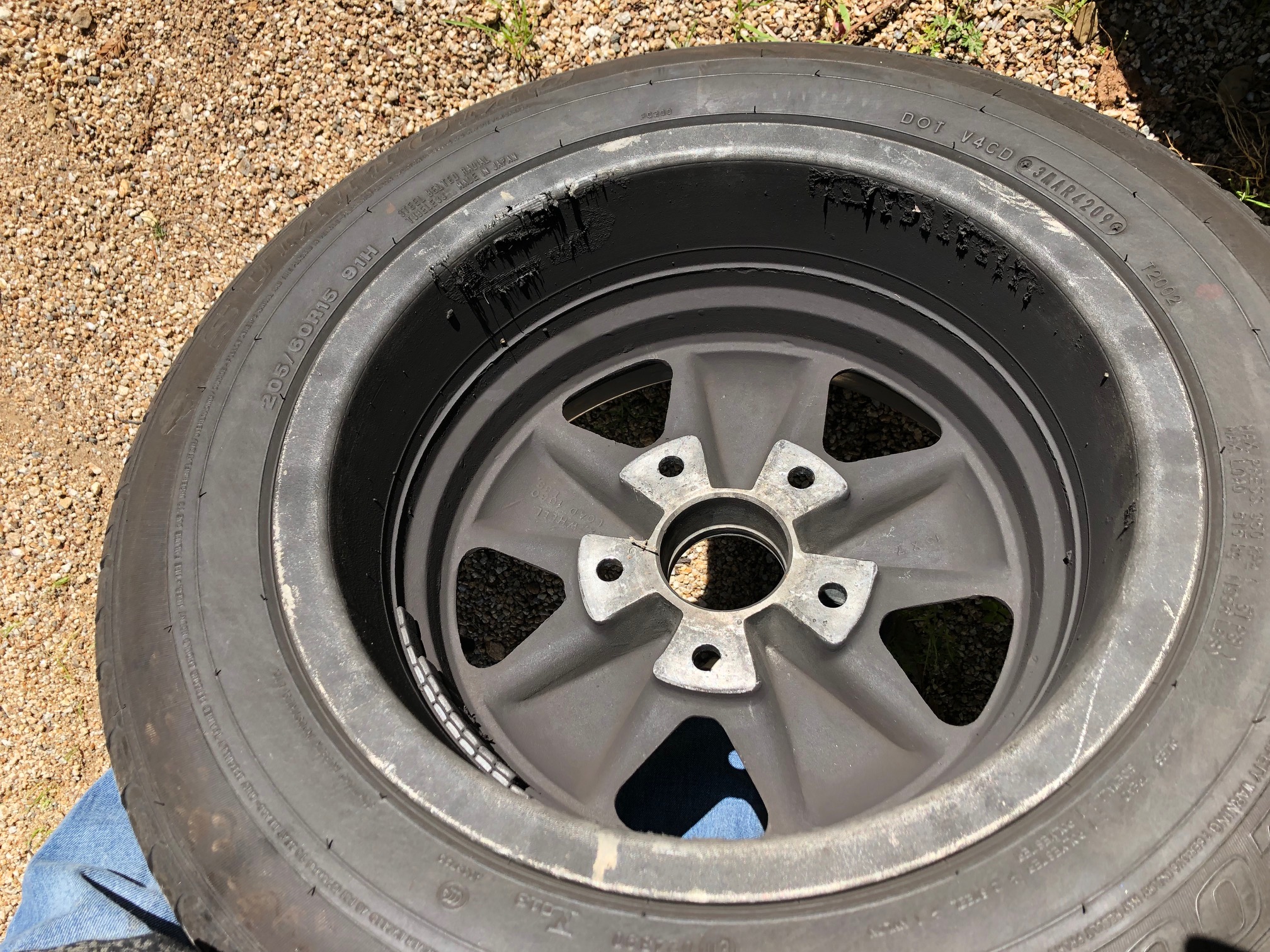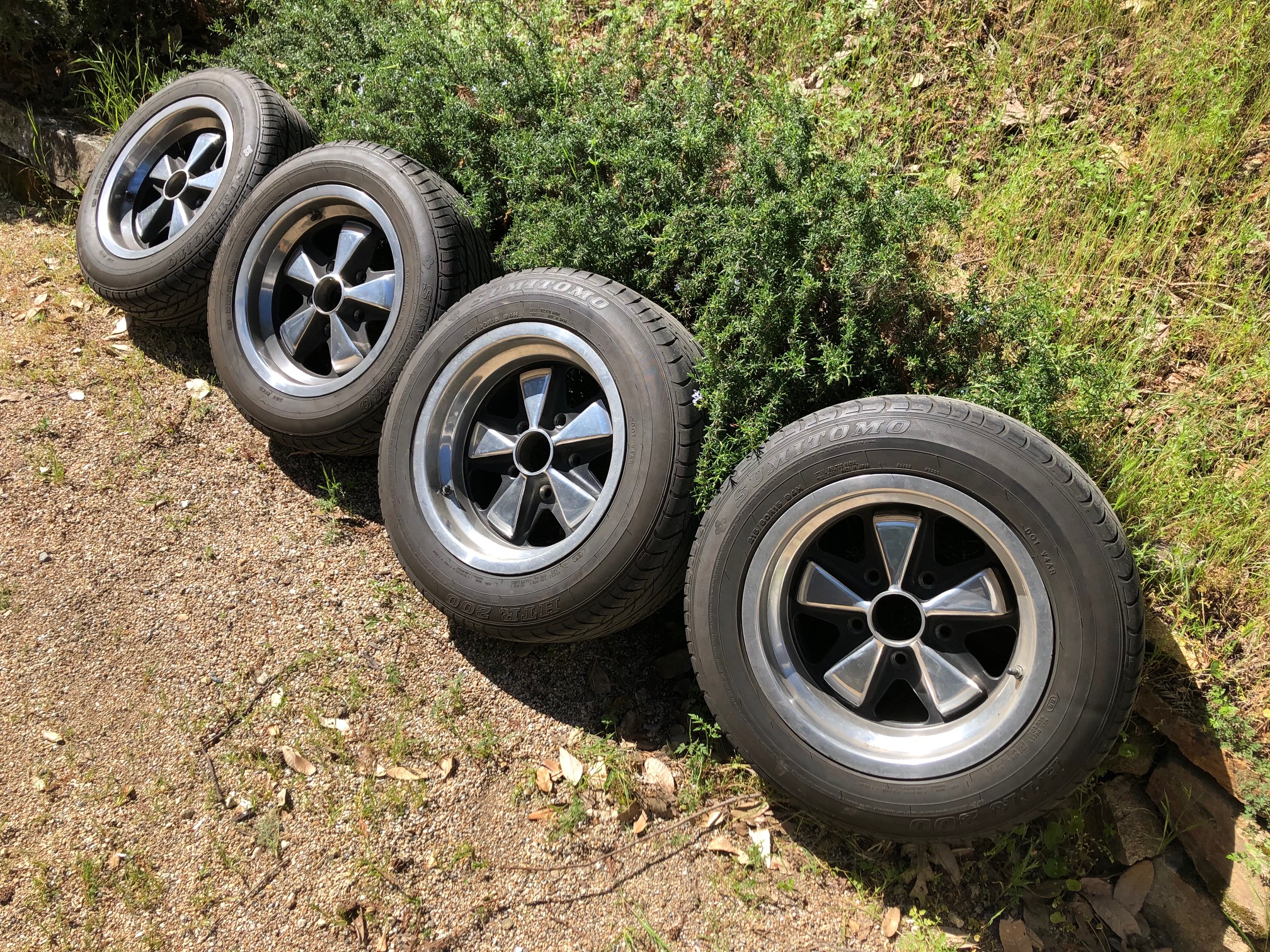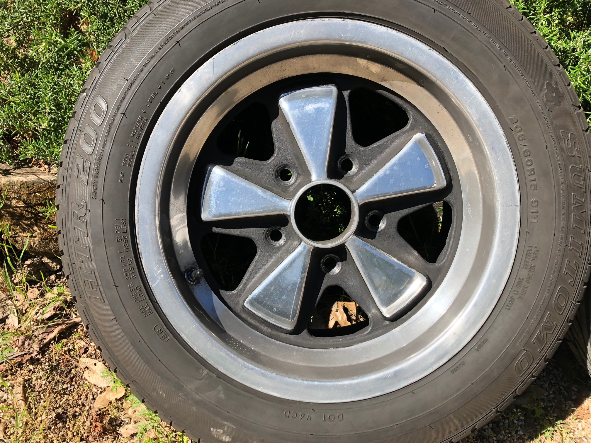 Two 7Jx15 and two 8Jx15 replica Fuchs. I used these on my GT replica, no issues with them; I just switched to different rims. The rims are in good condition but there are some minor scratches and road rash. The tires are 205/60/15 and 215/60/15 Sumitomo's which still have a bunch of tread left. No center caps.