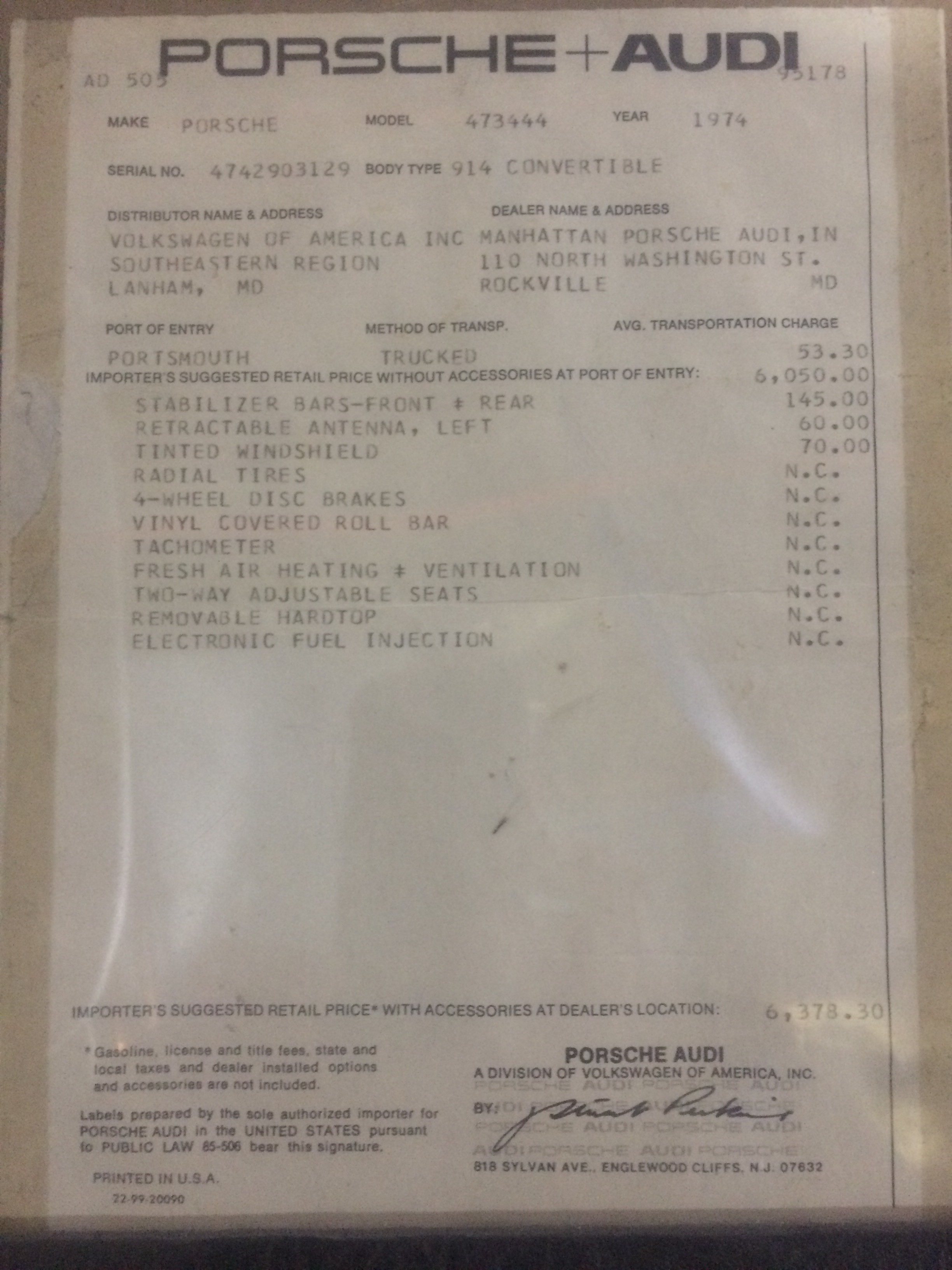 1974 Porsche 914 2.0 liter fuel injected Matching numbers (Porsche COA included) Original window sticker Light ivory B8 Black interior I bought this car from a 25 year slumber, (stored inside) and proceeded to bring back to the streets. Rust repaired, engine rebuilt, calipers rebuilt etc. all the things you have to do to drive a car again. This is a driver quality car, not the restored “garage queen” but a car you can drive on public roads and be proud of. I’ll add some more pictures after the weekend when it stops raining. There is still some final sorting to do, most of the heavy lifting has been done. Also included spare disassembled GA case 2 liter and core side shift transmission. Asking price $14950 PM or e-mail me here as I visit every day. Offered to 914 world first as I have received a lot of help from members here. Thank you to all of them! |