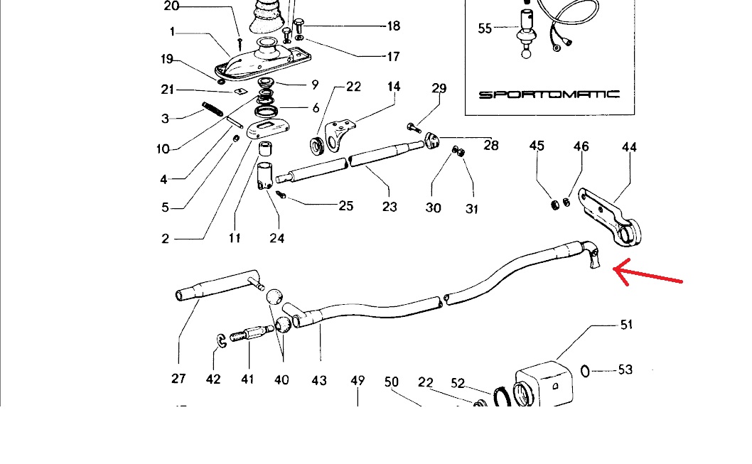 I changed 11, 40 (2 pcs), 22 (3 pcs). The end of the bar #43 that you put a red arrow on is all steel. Was there supposed to be a metal or plastic ball at the end? The little vertical end does feel loose in the part on the transmission where it attaches (is that what you called the cleat?). If those parts are worn out, what needs to be replaced or repaired? Should a new ball be welded on the end of the shifter bar? Or the cleat replaced, by taking some part of the transmission apart? Thanks for all the help. |