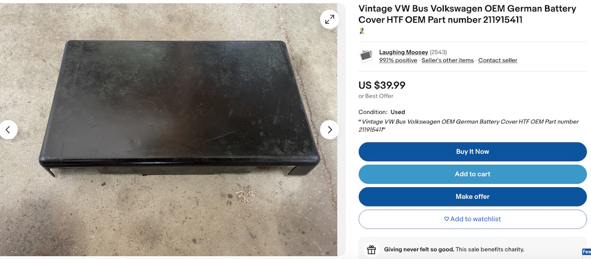 The battery cover shown above is the earlier style from the first recall 9J in October 1970. The later HO recall in 1977 featured the later smooth top style battery cover which just snapped on and did not have the rubber band. Of course either is correct for a 914 but if your car was around for the 1977 HO recall that’s the most current version, especially if you have the HO sticker in the front trunk. @JeffBowlsby @wonkipop 1 211 915 411 c This cover came with my 74 1.8. I don't know if it is original or from something else ![]() ![]() @Artfrombama @JeffBowlsby would know. here is also one from a very original 1.8 sold recently on BAT. lying around in trunk of car in the photos. same as yours and has the recall sticker on it as well. my reading of the part number you quote is 211 in it means its a type 2 part i believe. originally was meant for a bus (kombi). the 411 numbers at end are used right through 70s and 80s for various battery covers in various model VWs. im guessing the original battery cover part listed in PET (the smaller one) was superceded with the bus one and the bus one probably got developed a little later than during 914 production run. its a real deal thats for sure. |