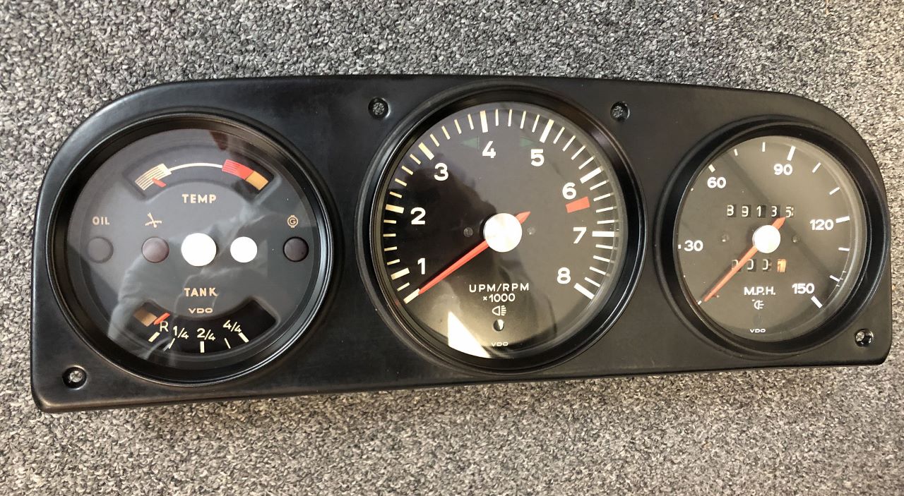 Part #'s Combo Gauge: 914.641.101.10 Tachometer: 914.641.301.10 Speedometer: 914.641.505.020 The dash panel that holds the gauges has been blasted and powder coated in satin black and is like new condition. Price is $995 for the set and includes shipping in the USA. |