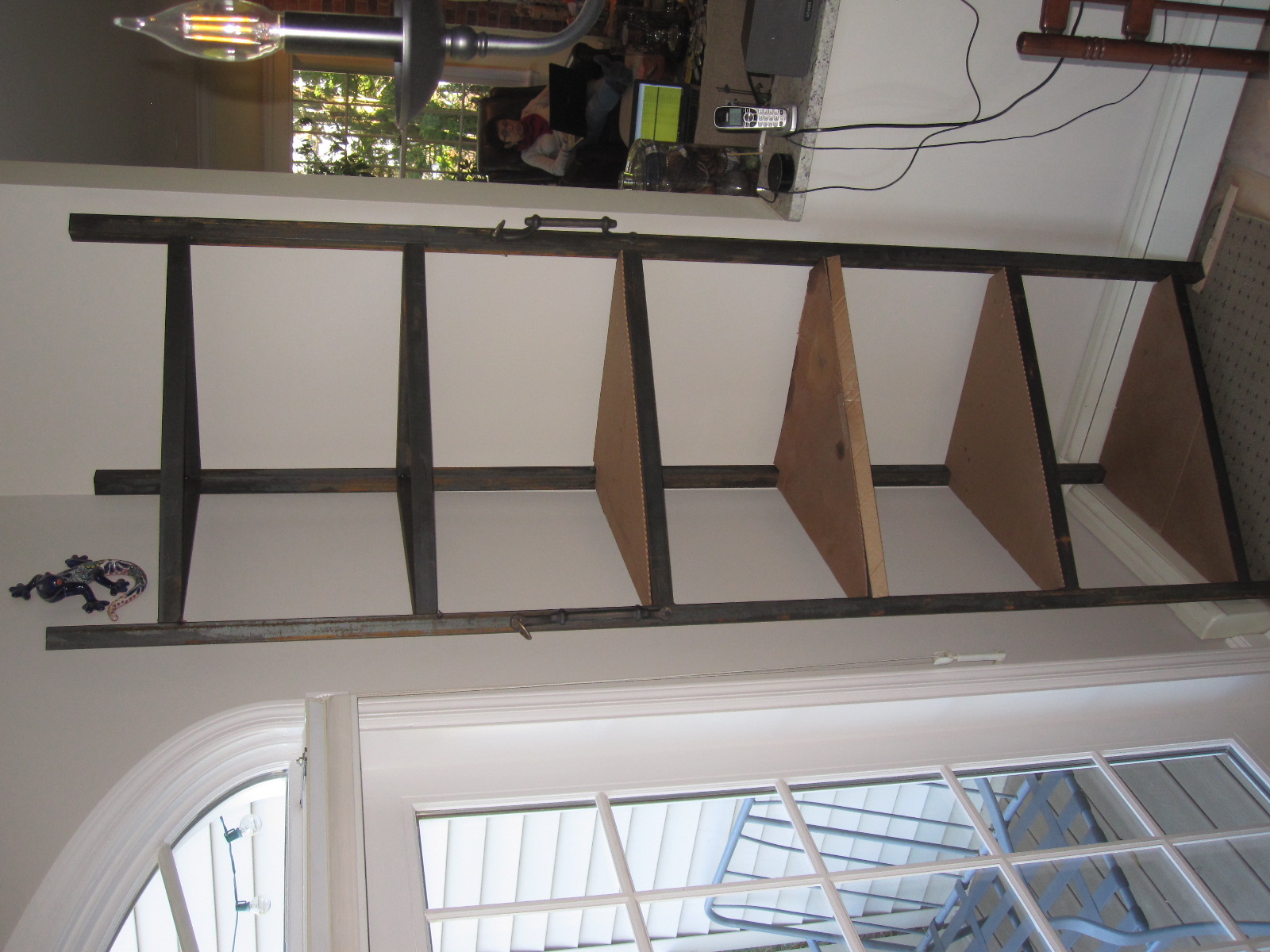 Plenty of time on our hands..... What to do ? Needed to fit in a corner. Off to the garage. 1 1/2" x 1 1/2" angle iron 96 " tall Results in place. Shelf material and small details to be determined. Attached thumbnail(s) |