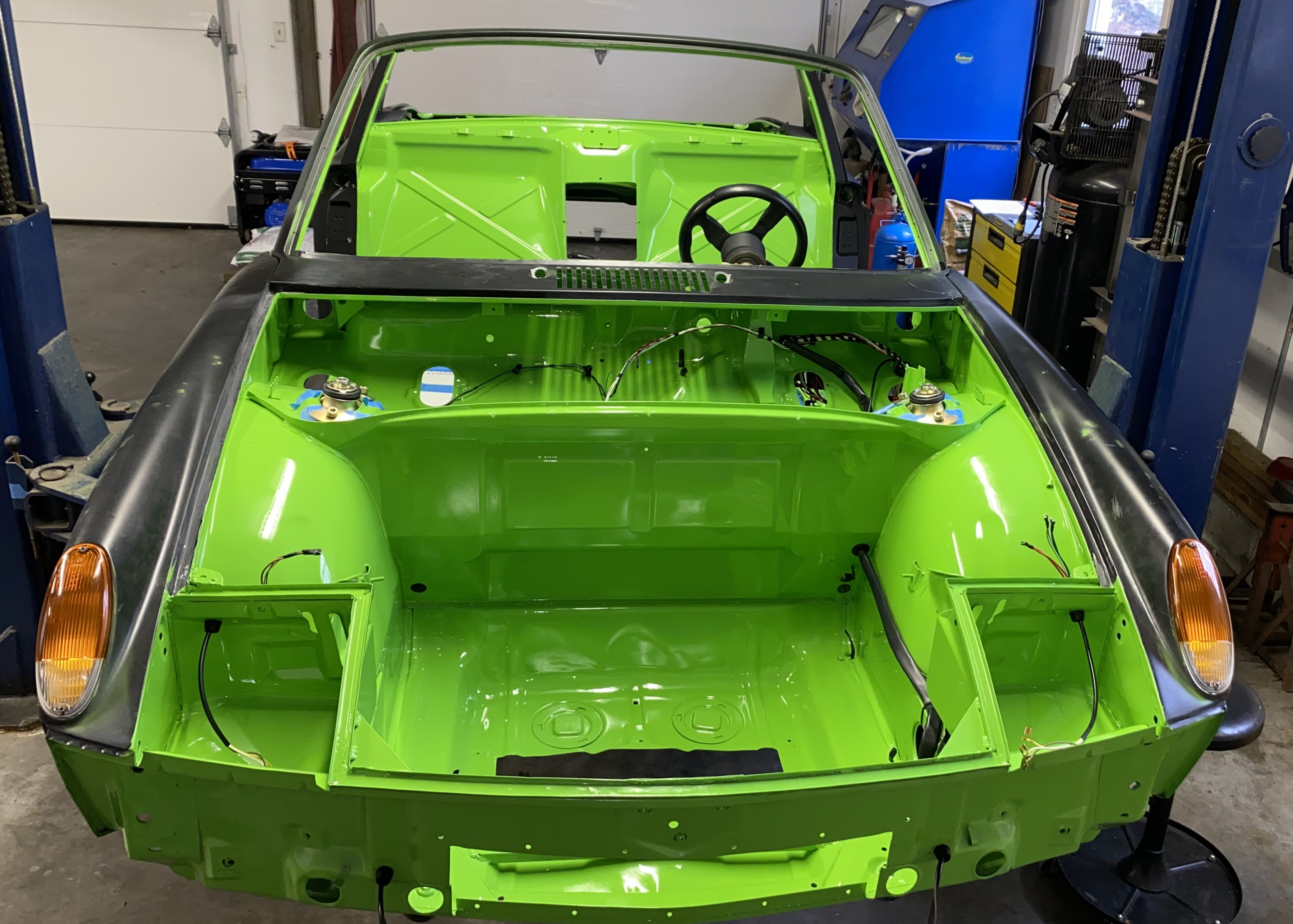 Finally finished up the electrical wiring today. As always, one of the more challenging tasks to get everything to function properly. The job was pretty straight forward with the new 914-6 harness and wiring diagram from Restoration Design. The most challenging part was creating a custom harness to mate the NOS 1969 911 T/S switch to the chassis harness. It took several days of head scratching and studying the wiring diagrams to get it right. I had a nice, bare 12 pin connector and 6 pin plug in my stash that allowed me to create a mating harness without having to modify the 911 T/S switch. It looks ugly but it works. The 911 wiper switch was straight forward plug and play into the Restoration Design 914-6 wiper harness.