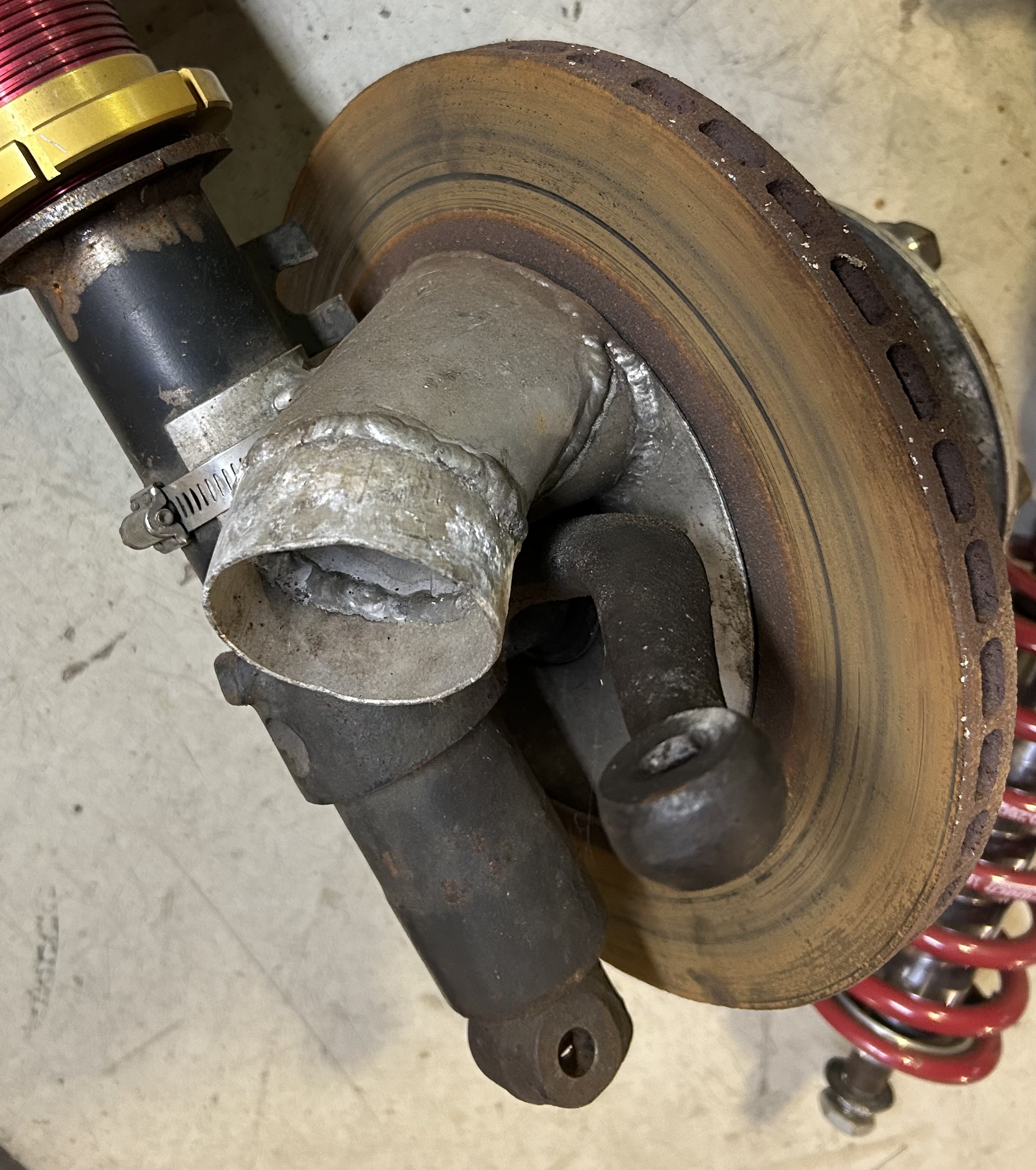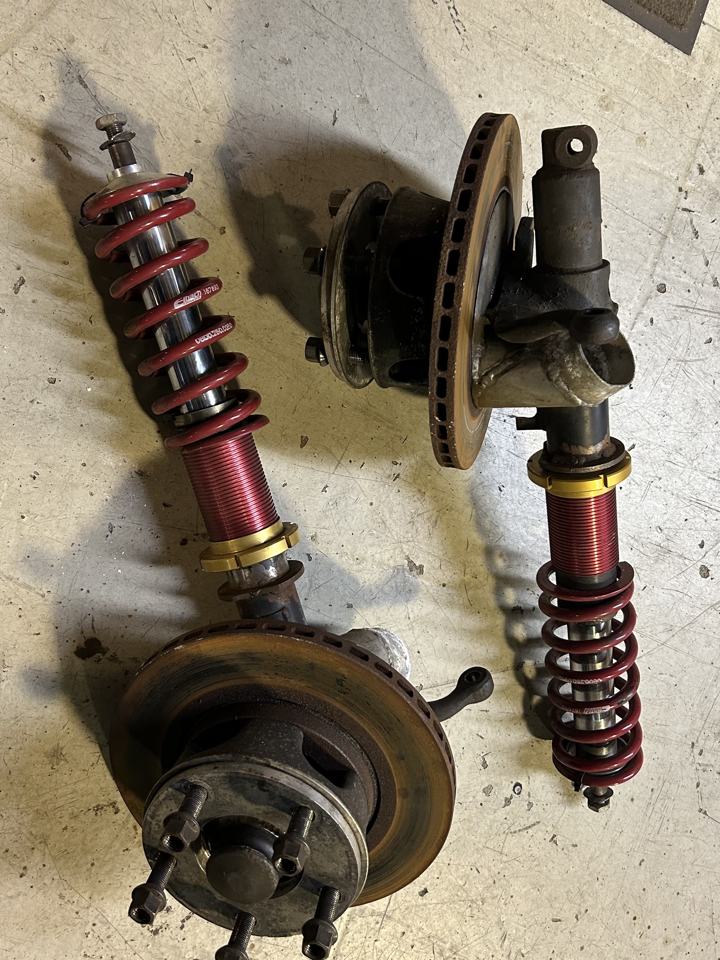 Pair of 911 struts (3" brake bolt spacing, wedge bolt) with 22mm raised spindles and 300lb coilover springs/threaded perches. Bilstein inserts are custom valved for race track use. Includes custom hand made brake ducting for increased cooling, with or without rotors. $900 plus shipping.