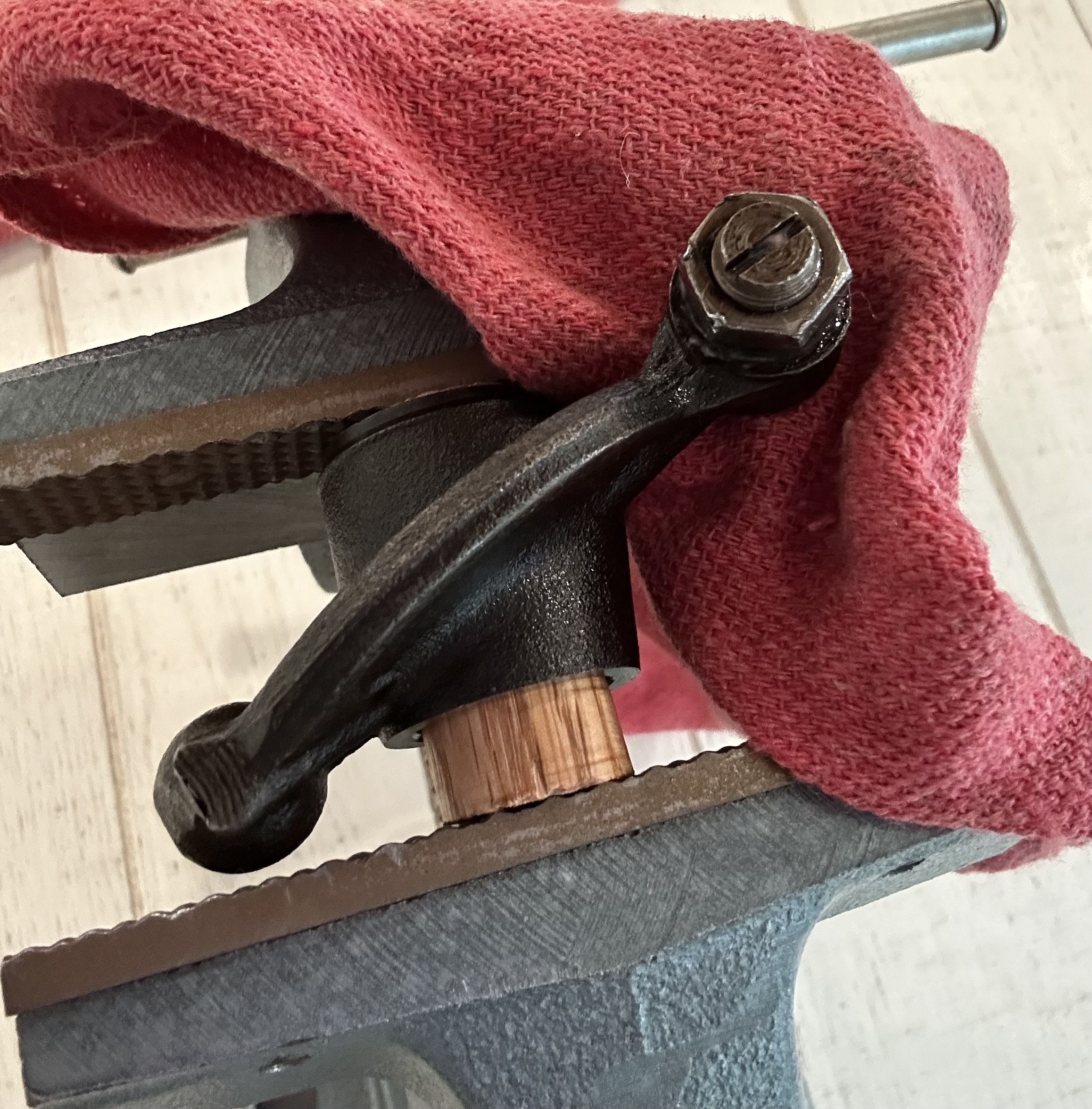 I'm backwards, put the nut in the vice and use the rocker as the lever. I love the idea, but I think ] textured vice jaws would damage this tiny nut (even if it could get a good enough grip on it) and soft jaws wouldn't be able to hold it in place. But it's a good idea for future issues where the nut or bold head is bigger! |