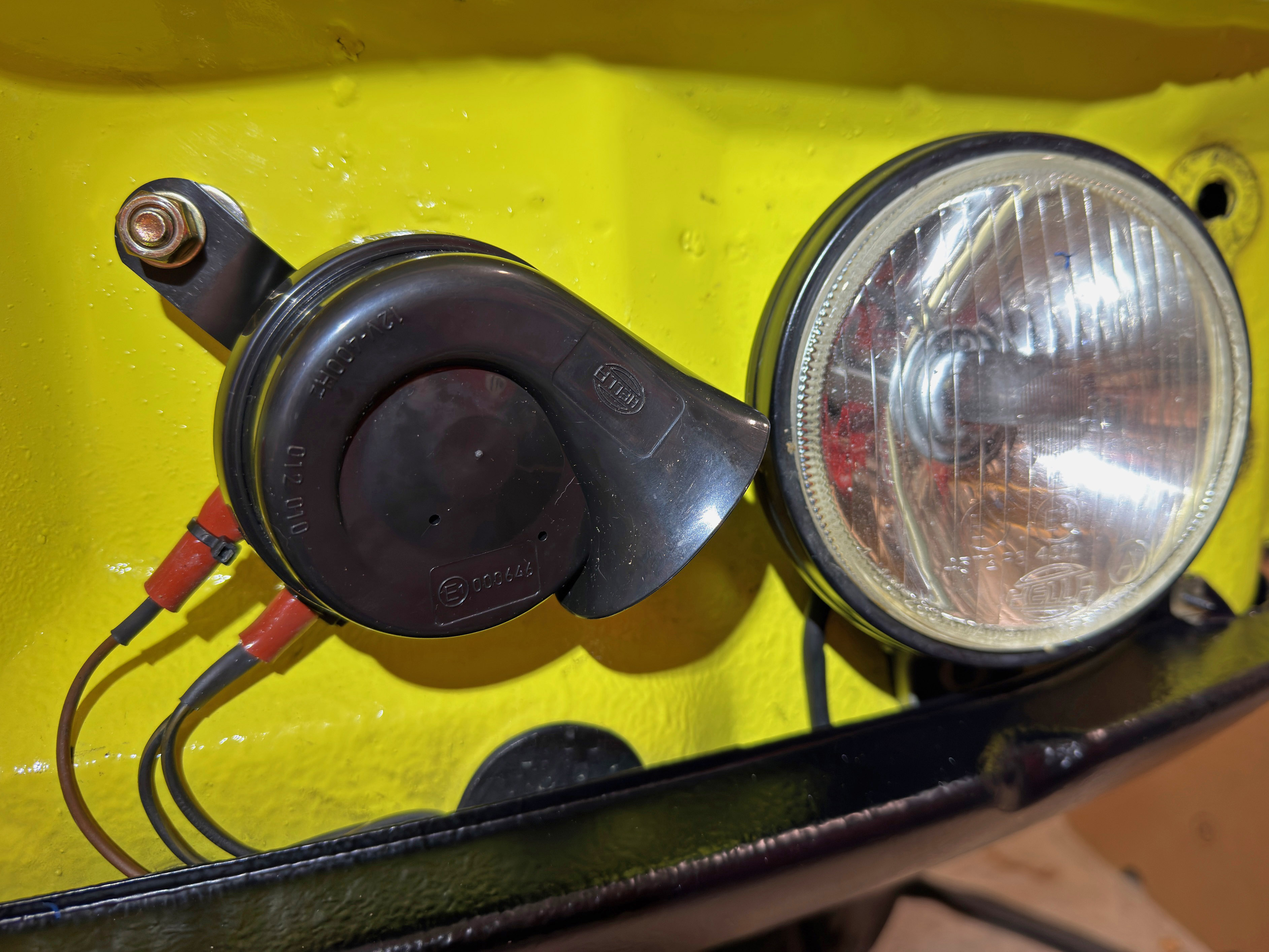 Mostly I was interested in knowing if these things will actually fit in the same place as the OEM pancake horns - they being considerably thicker and the space behind the bumper being pretty limited. I installed 96-97 VW Golf/Jetta high and low tone horns in my 914 in the stock two horn configuration locations. I used the factory female plugs from the golf/jetta and put spade connectors on the ends of the pigtail ends to connect to the factory locations in the 914 harness and the factory golf/jetta metal brackets. They sound amazing too. @L-Jet914 what are the part #s? Went to look in my tool box for the other two horns I acquired from the local Pick and Pull to have as backups as I purchased them used at the same time. Found them. The part numbers are 1HM951219D 400Hz (low tone. mounts to passenger side) 12V(volt) and 1HM951219K 500Hz (high tone. mounts to driver side (same mounting locations for the high/low tone horns as the stock dual horn optioned 914s) 12V(volt). I do not know the part numbers for the female weatherpack type connectors (pig tail) that connect to the horn assemblies. I removed both horns and cut the wiring out of the harnesses from two different VW Golfs/Jettas. |