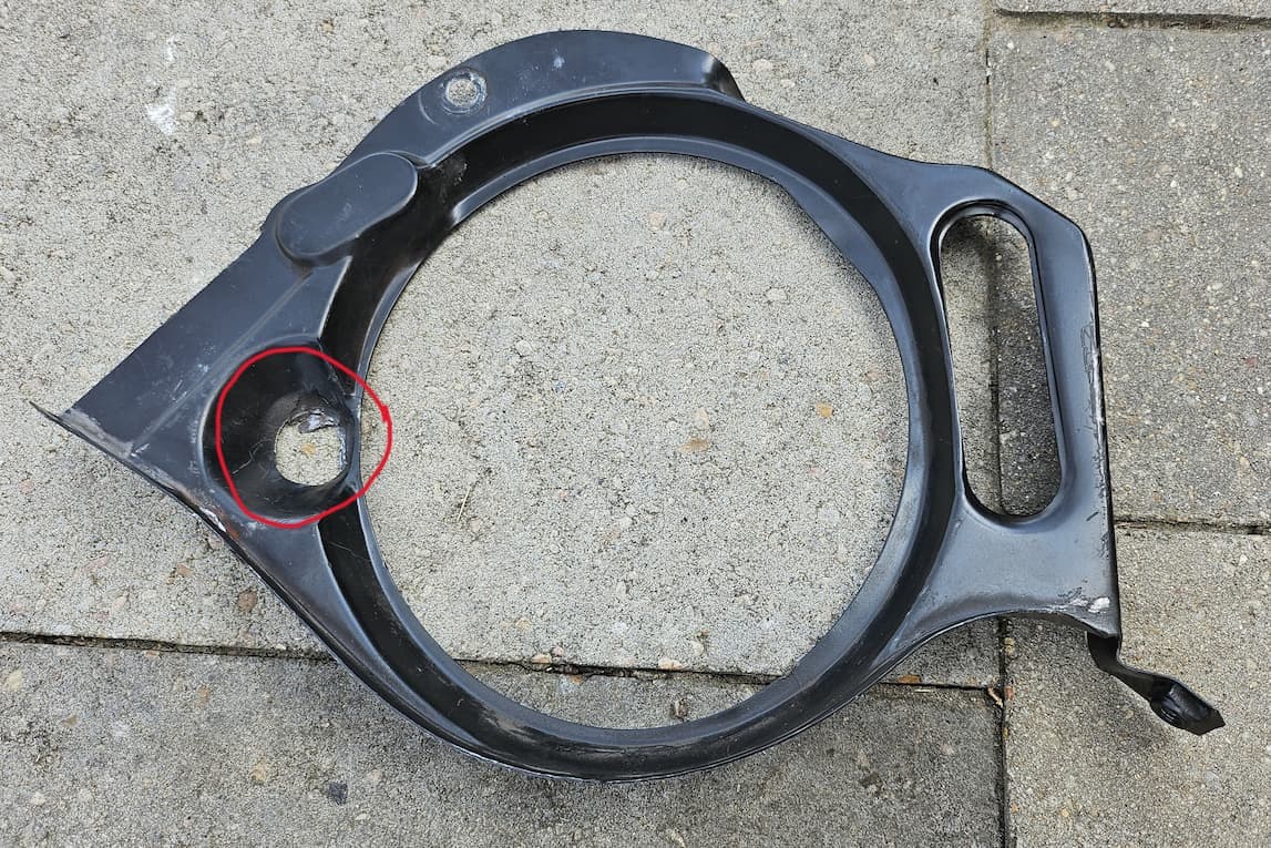 Stripped carriage bolt hole and missing plastic gasket/adapter to face of the alternator other the stamped bracket. There is also a paper gasket for the back cooling cover bolted to the back of the alternator.