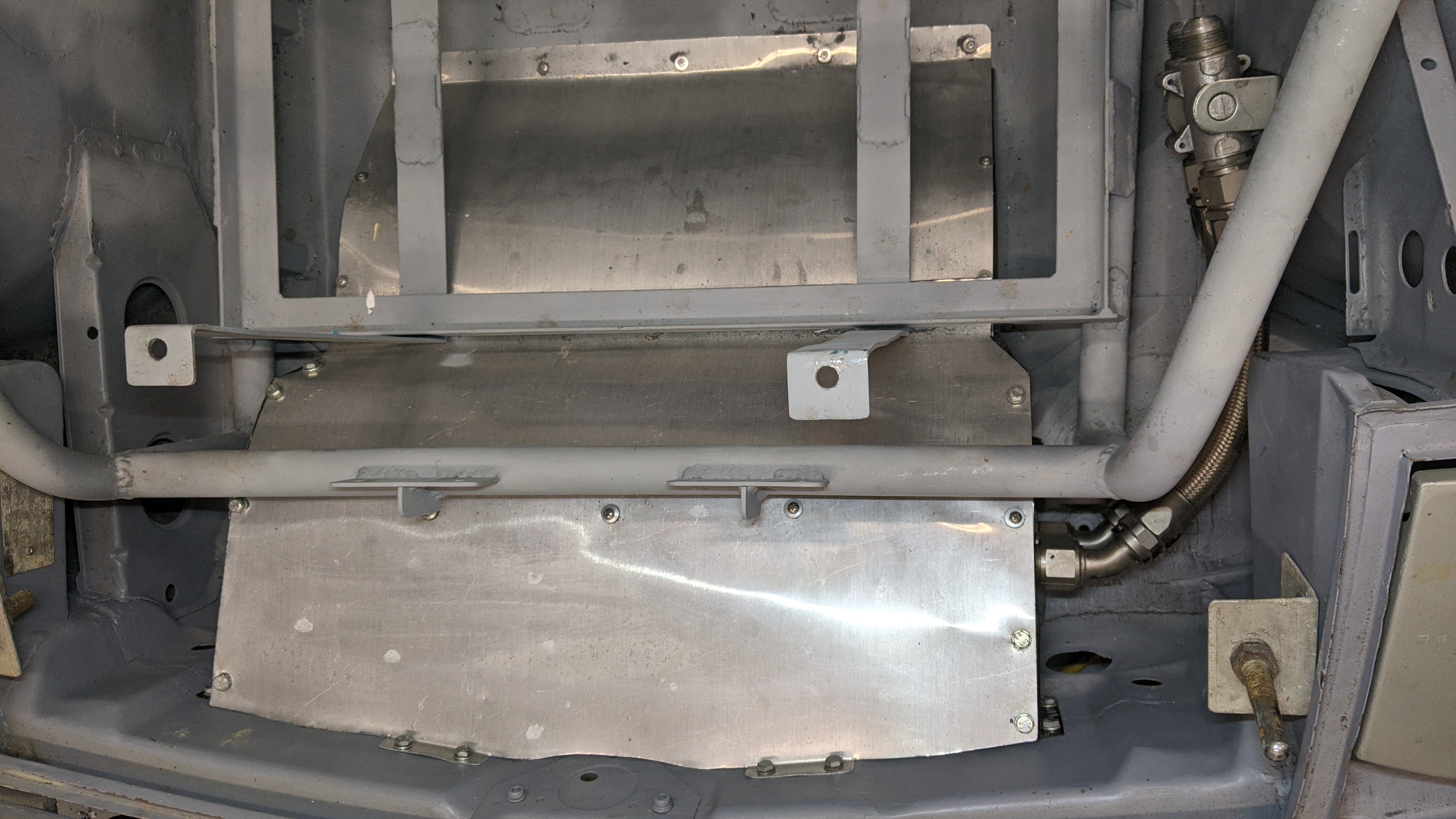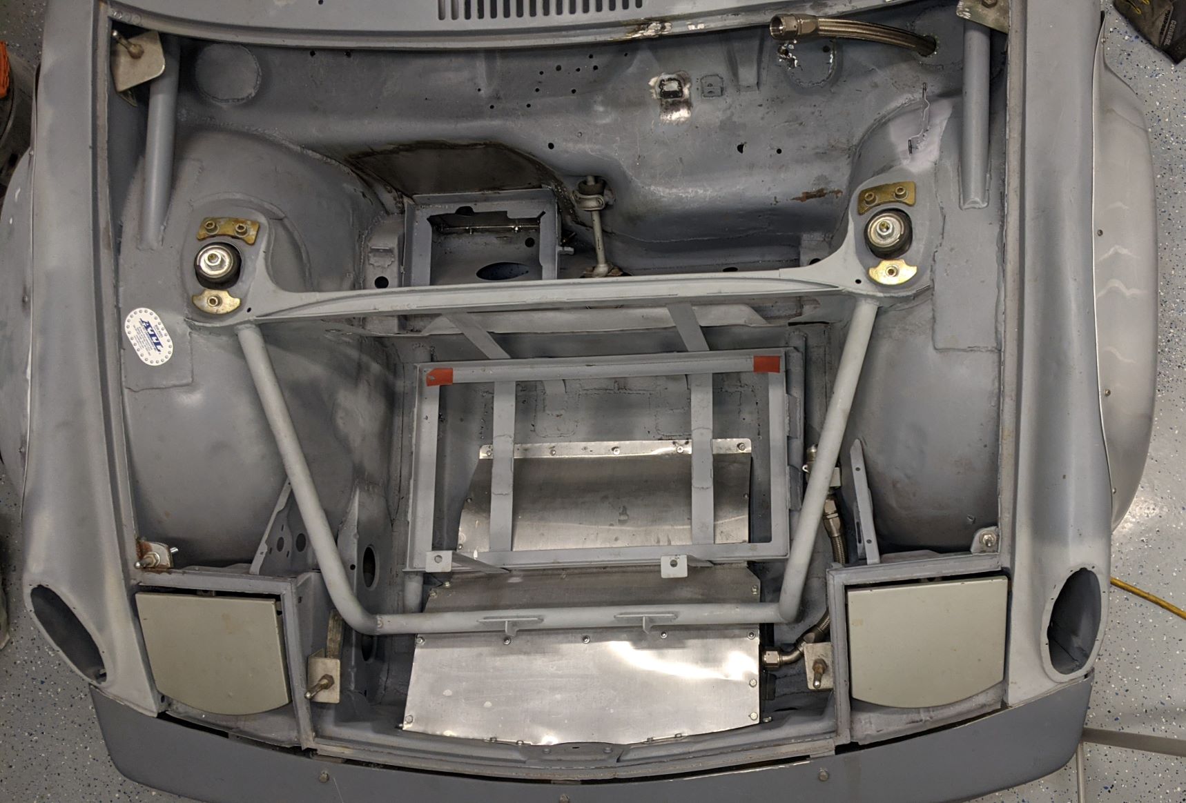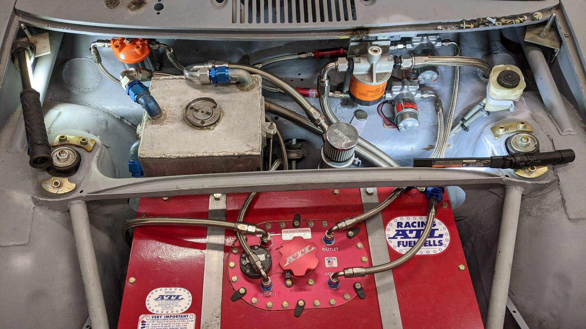 hour to remove everything with the help of a battery powered impact tool. Welded all the unneeded holes in the top of the firewall. You can see the oil cooler shroud I made from sheet aluminum. I started with the fiberglass shroud available from various sellers. It ended up being too tall and going too far back to accomodate the larger fuel cell I had ordered. So I made my own with sheet metal sides with welded on nuts and sheet aluminum top pieces. The front piece is designed to be removable with the fuel cell in the car to replace the oil cooler if needed. John |