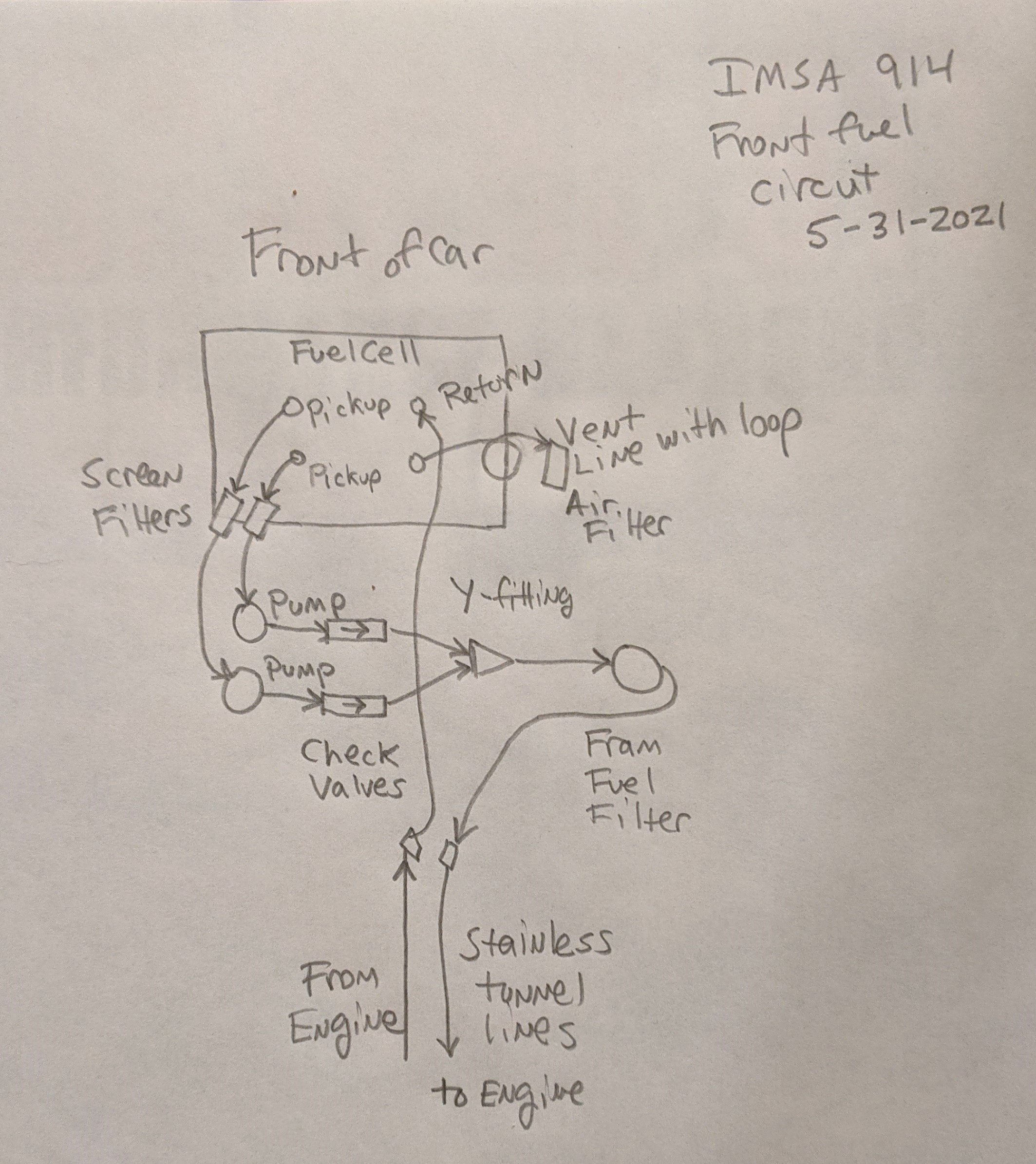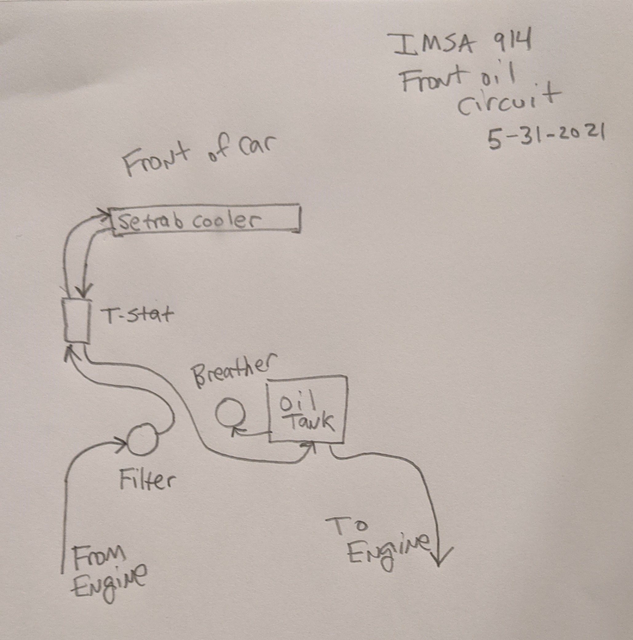 made up and attached for the first time! (IMG:style_emoticons/default/beerchug.gif) Of course, it will all come apart again for painting later... I did not like the way the fuel system routing was working out. The lines were too long and I did not like having any fuel system components in front of the fuel cell. So I took it all apart and did some measuring and mock ups. I realized I could make it all fit under the cowl, much like how the original builders had it set up. Here is how it turned out: Using the old fuel lines I was able to make up all the new lines without having to use any new AN line, except for the lines connecting to the Tangerine Racing fuel lines with AN fittings from Chris Foley. I needed several feet of new line for each of those. I can make the -6 lines with fittings at both ends in about 10 minutes or less (total guess). I never really timed it but it does not take that long per line. I will add Adel clamps or bolts to hold each component place. I will attach the fuel lines in strategic places so nothing can rub on the steering or sway bar, etc. Here is a diagram of the layout fuel system. I realize if I put the front of the car at the bottom of the diagram it would match the photos better. You get the idea. The check valves are there so that if one fuel pump is dead or turned off, the other one can still pump fuel without it just going back into the fuel cell. I also changed the routing of the oil lines so that the oil goes through the oil filter before going to the thermostat and radiator. Someone made that suggestion, can't recall who, but thanks for the tip. Here is a diagram of the oil line layout. Really stoked to have this part done. John |