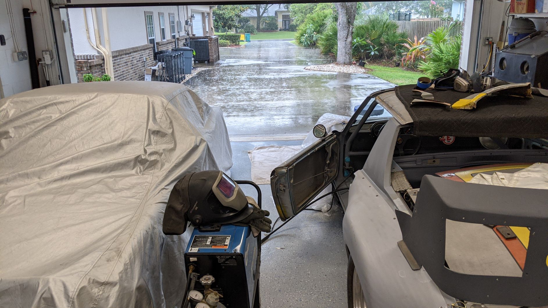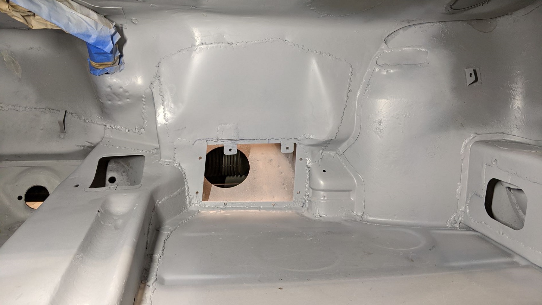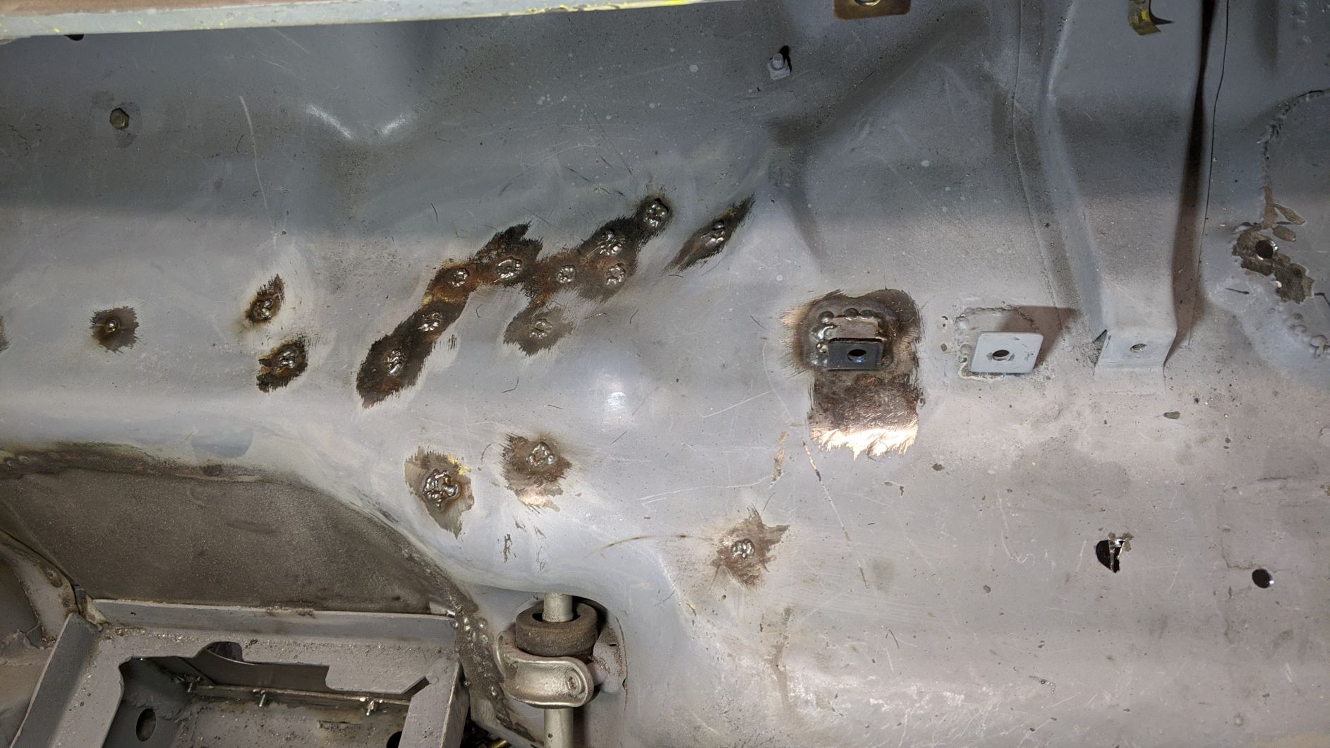 Working my way from front to back, trying to seal up the driver's compartment from the front trunk and engine bay. Welded up more holes and primed the footwell area.