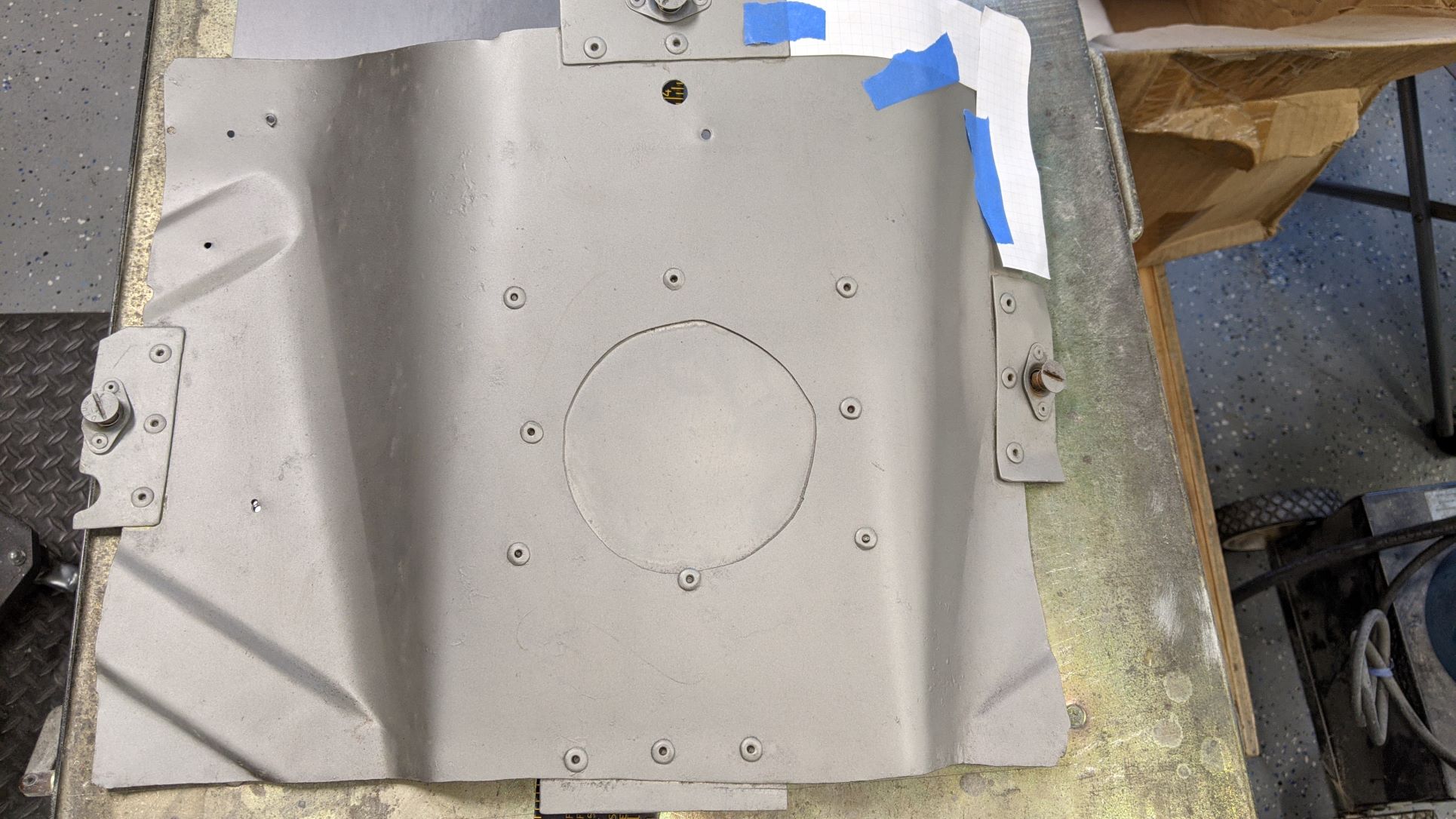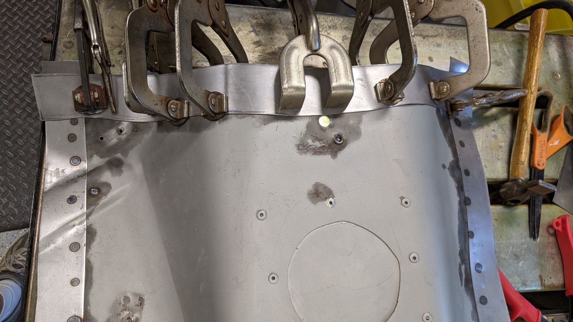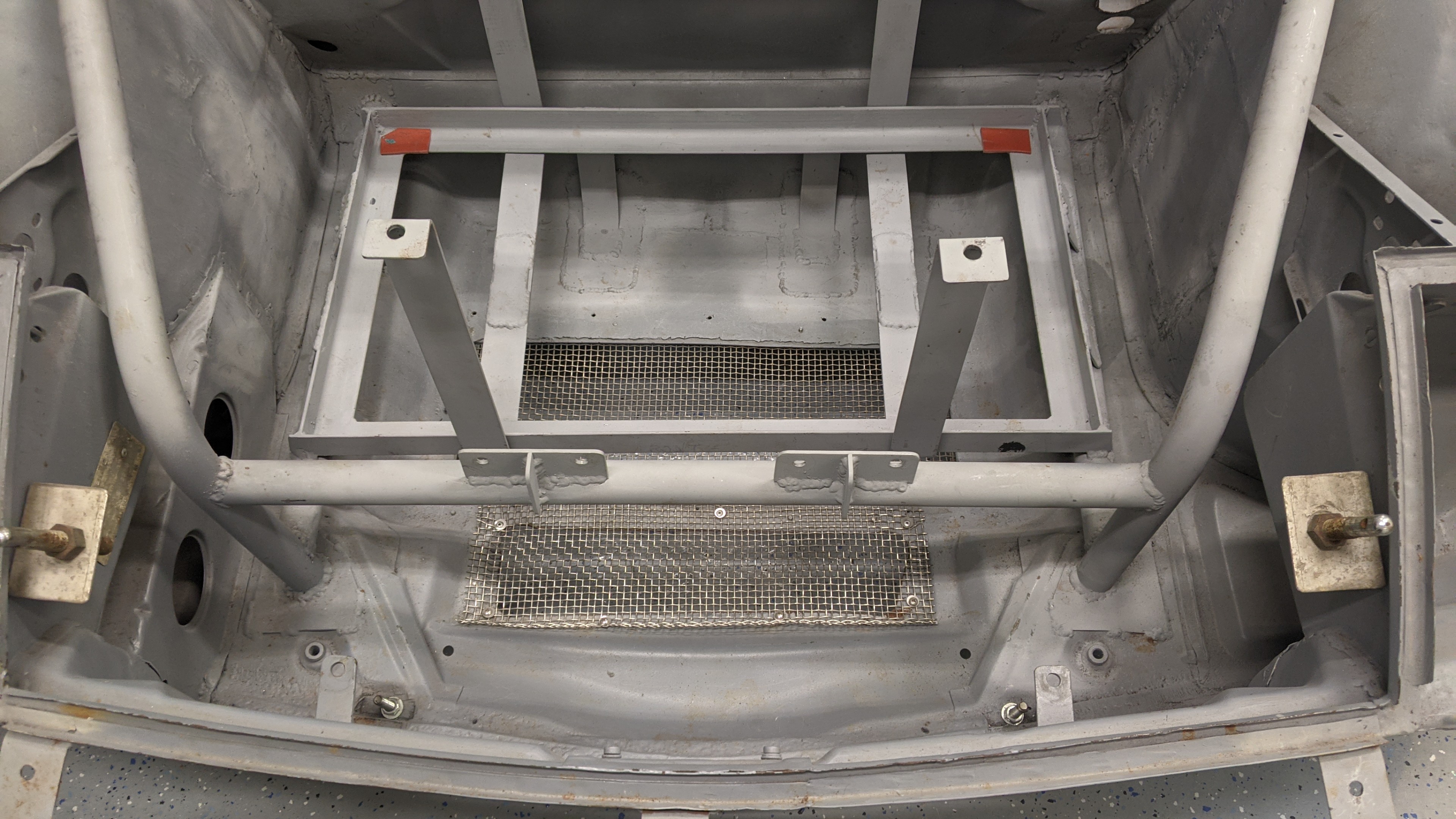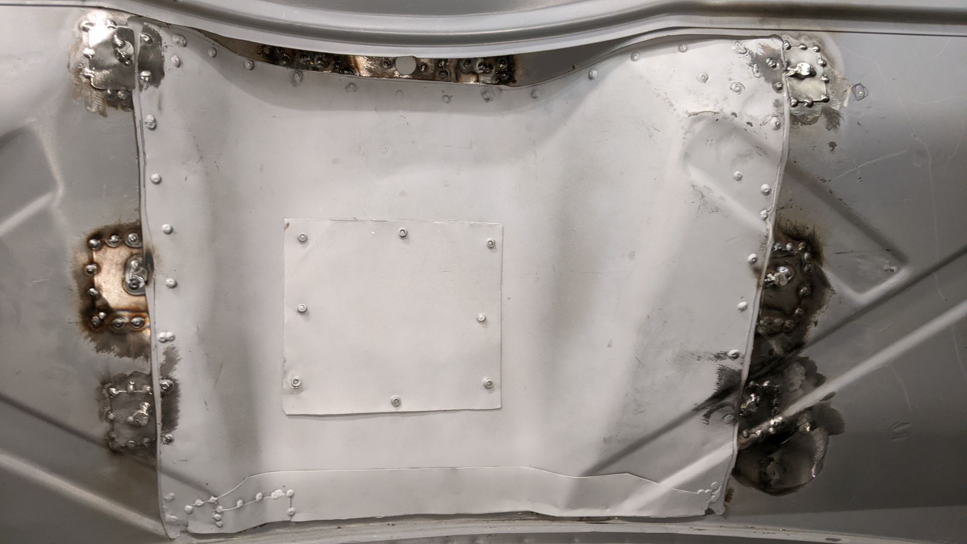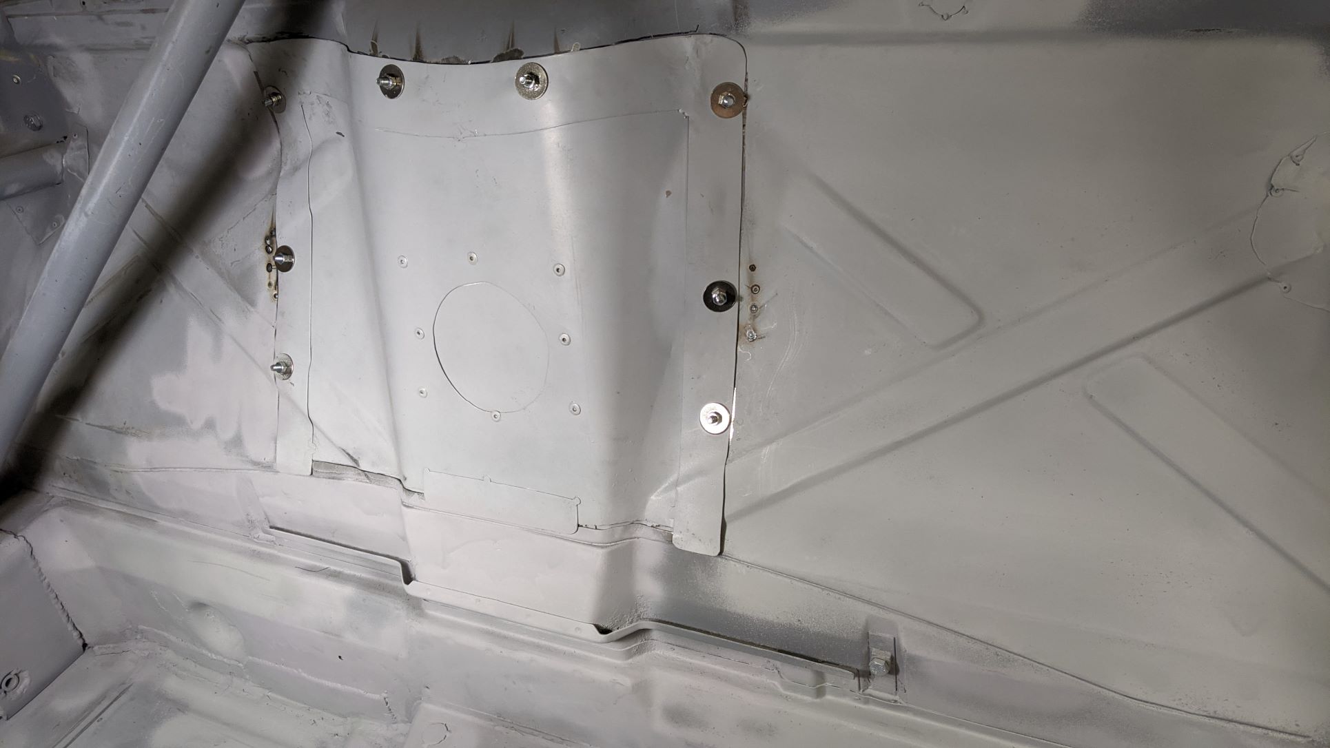 Been working steadily on the passenger compartment of the car. Welding up many holes to the engine compartment, etc. One large issue was the hole that was cut to access the front of the engine. A cover was made by the original builders with dzus fasteners from the cut off piece: