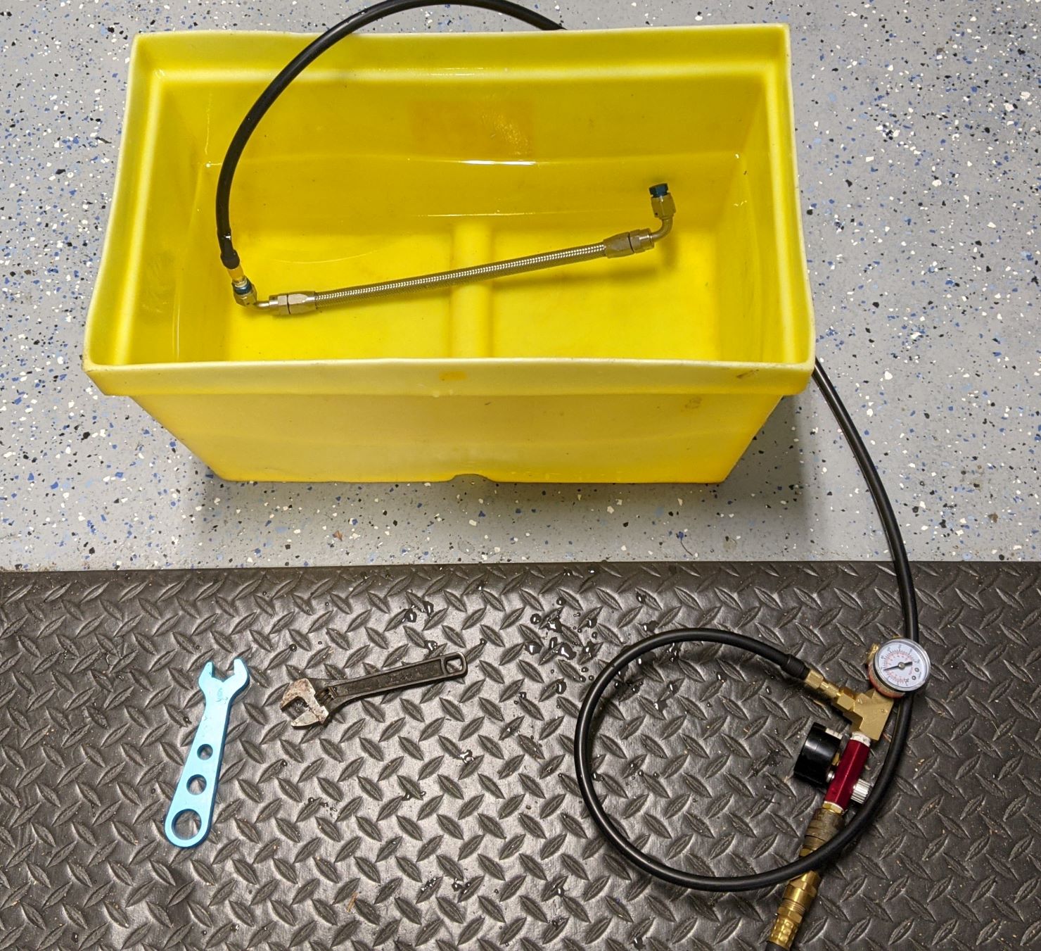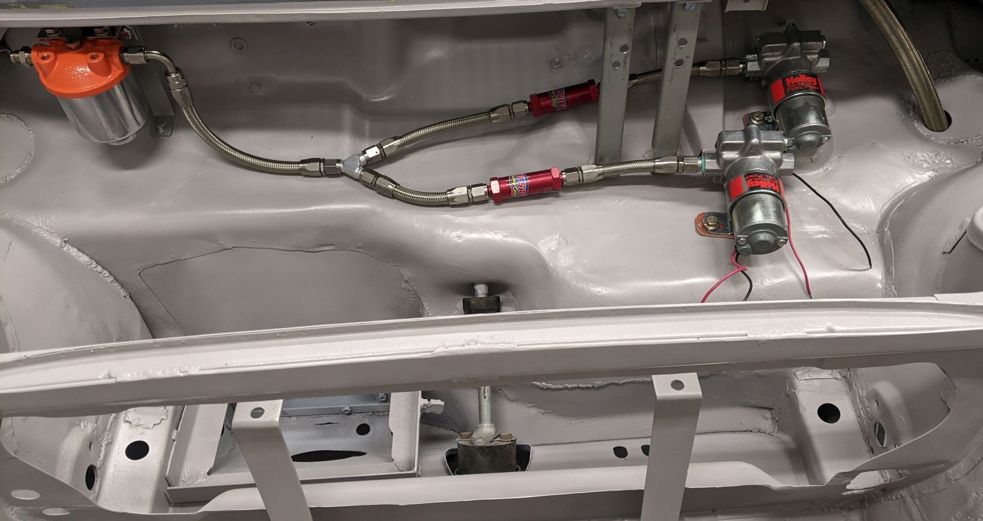 and I like the routing and lengths much better. The hose fittings are reusable and will be needed for the engine bay routing. Starting to pressure test all the fuel lines. After this photo was taken I went up to 90 psi without any bubbles forming. I will test all of the components before putting them back in the car and pouring in actual gasoline. John |