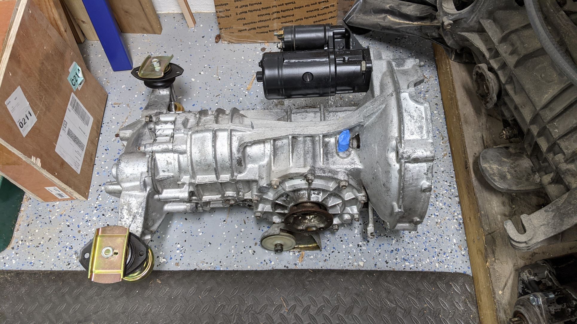 Been starting on the transmission for this car. I pressure cleaned what is supposed to be the better of the two spares I have. Someone painted this transmission silver in the past and some of the paint came off. I like the patina look it has. I got a rebuilt starter and some re-plated mounting hardware from Bruce Stone.