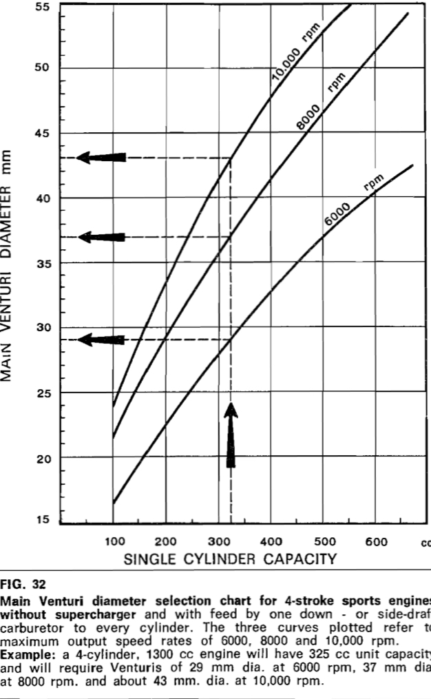 Here is the Weber tuning guide chart for single cylinder per barrel Venturi selection chart - basically the same as the Excel chart posted at the top, the main difference is the chart from the Weber manual has 6000 rpm as the lowest curve while the 5500 curve in the Excel chart is more appropriate to our 914’s.