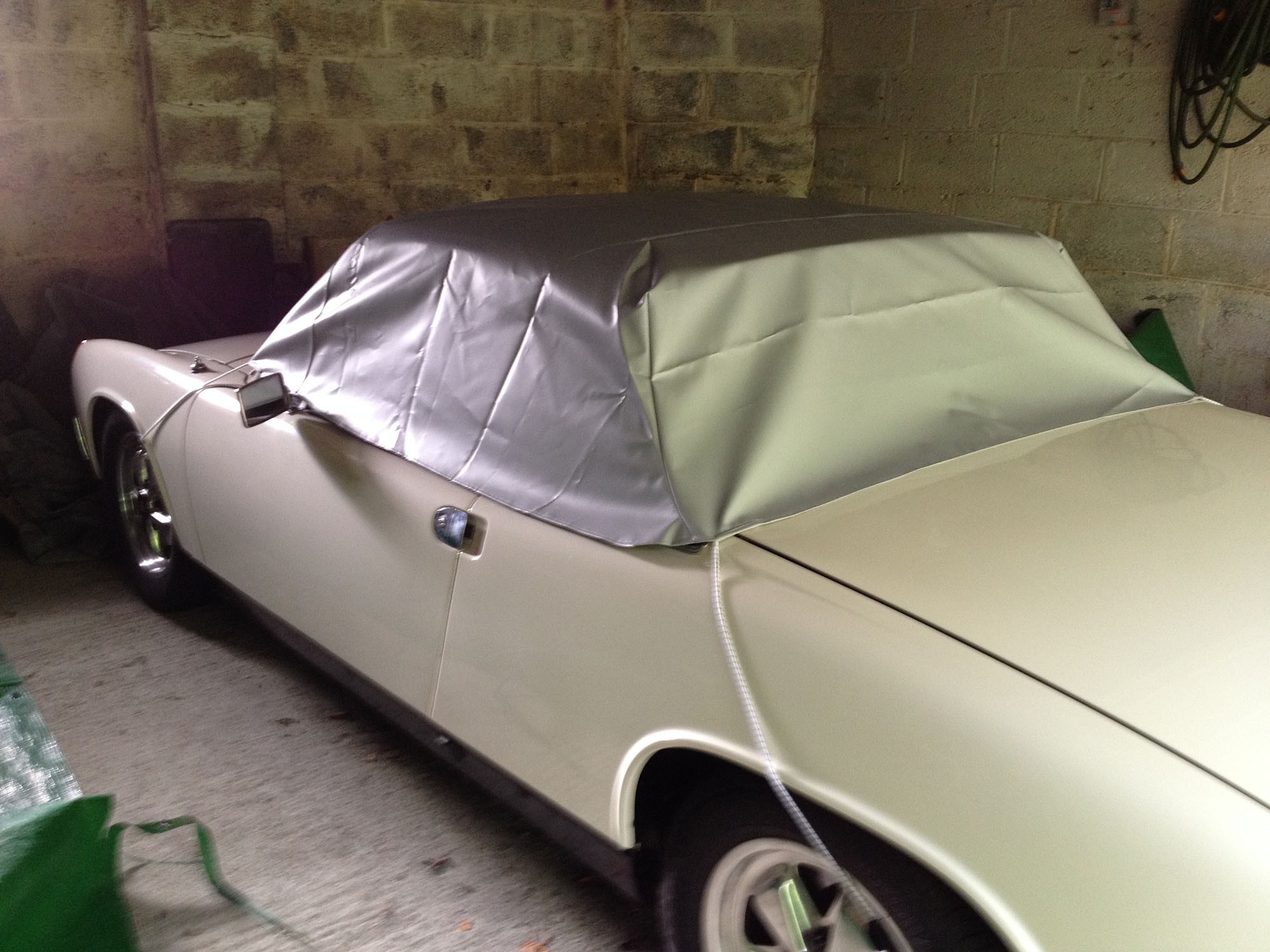 Sorry for the messy garage but here's the cover in place without the targa top. You can see that it sags a bit in the middle but it's not bad at all. You can hook the bungee cords to whatever slot in your wheels that you like, so there should be no problem getting a tight fit.