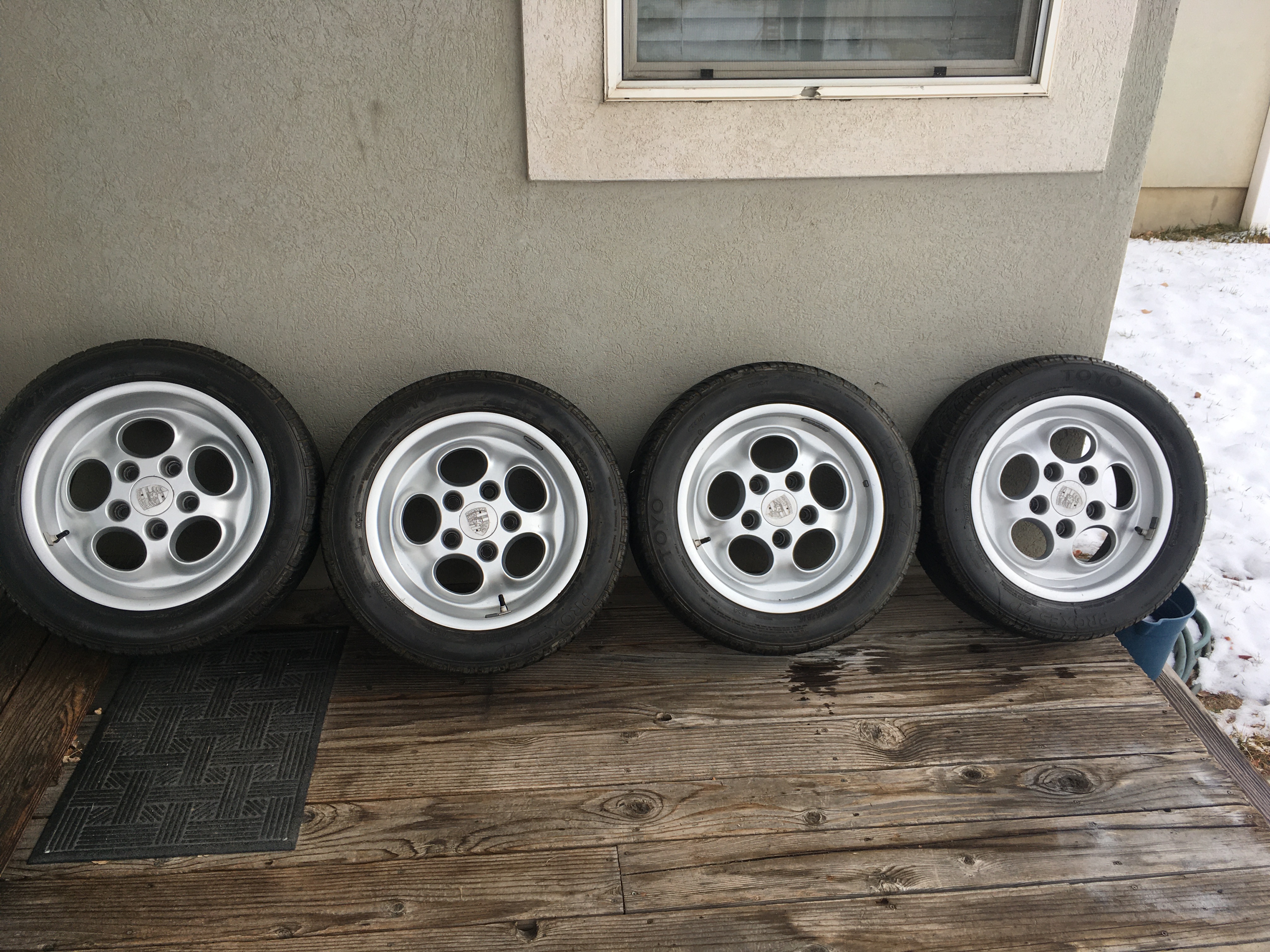 Sweet set of 16x7x8 Phone dials off a 944 Turbo. Wheel are in great shape with tires that have a lot of life left in them. Tires are 205/55/16 on the fronts and 225/50/16 on the rears. Thanks for looking. Tires and wheels located in Highland, Utah. Shipping and paypal fees apply. |