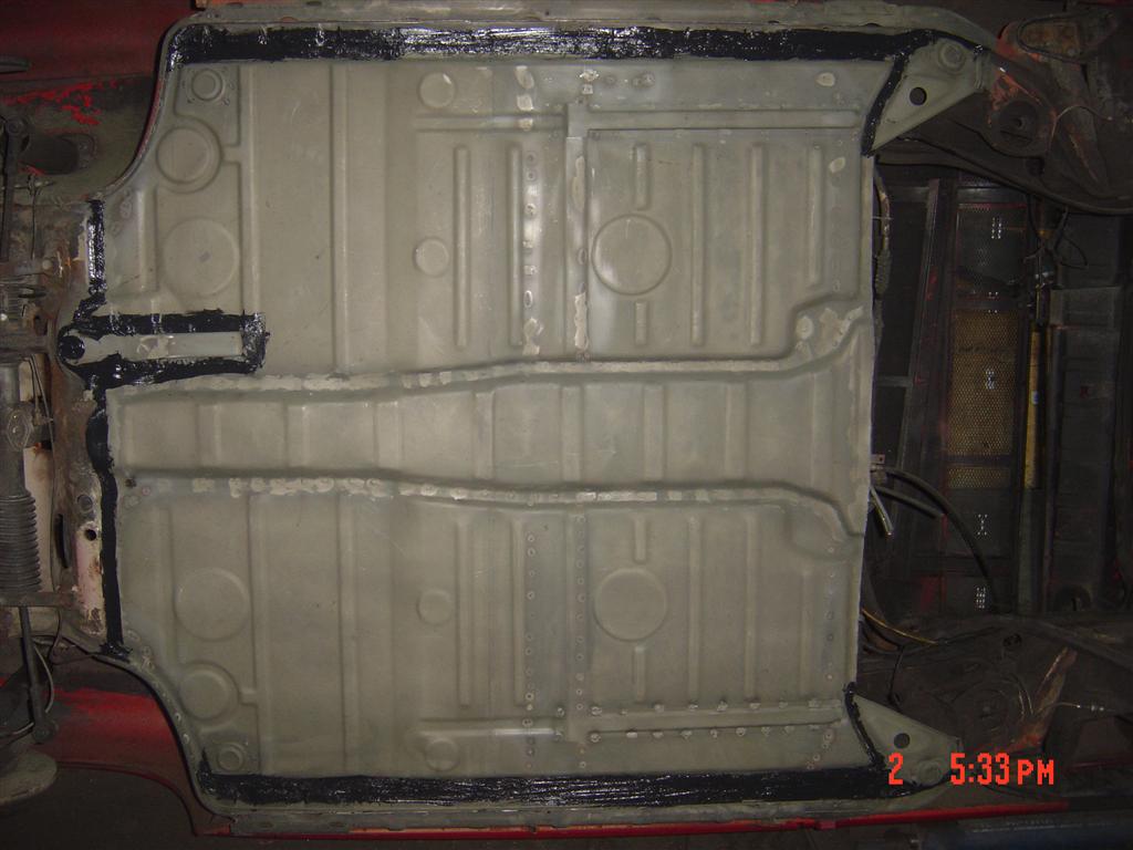 Personally I did ironclad, factory tar pads and then body color ...Specialist said do not use tar but I wanted sound proof. Figured with new seals the idea is to keep water out ! On cross member ...Auto Atlanta does carry that part as reproduction.... Good luck Thanks guys |