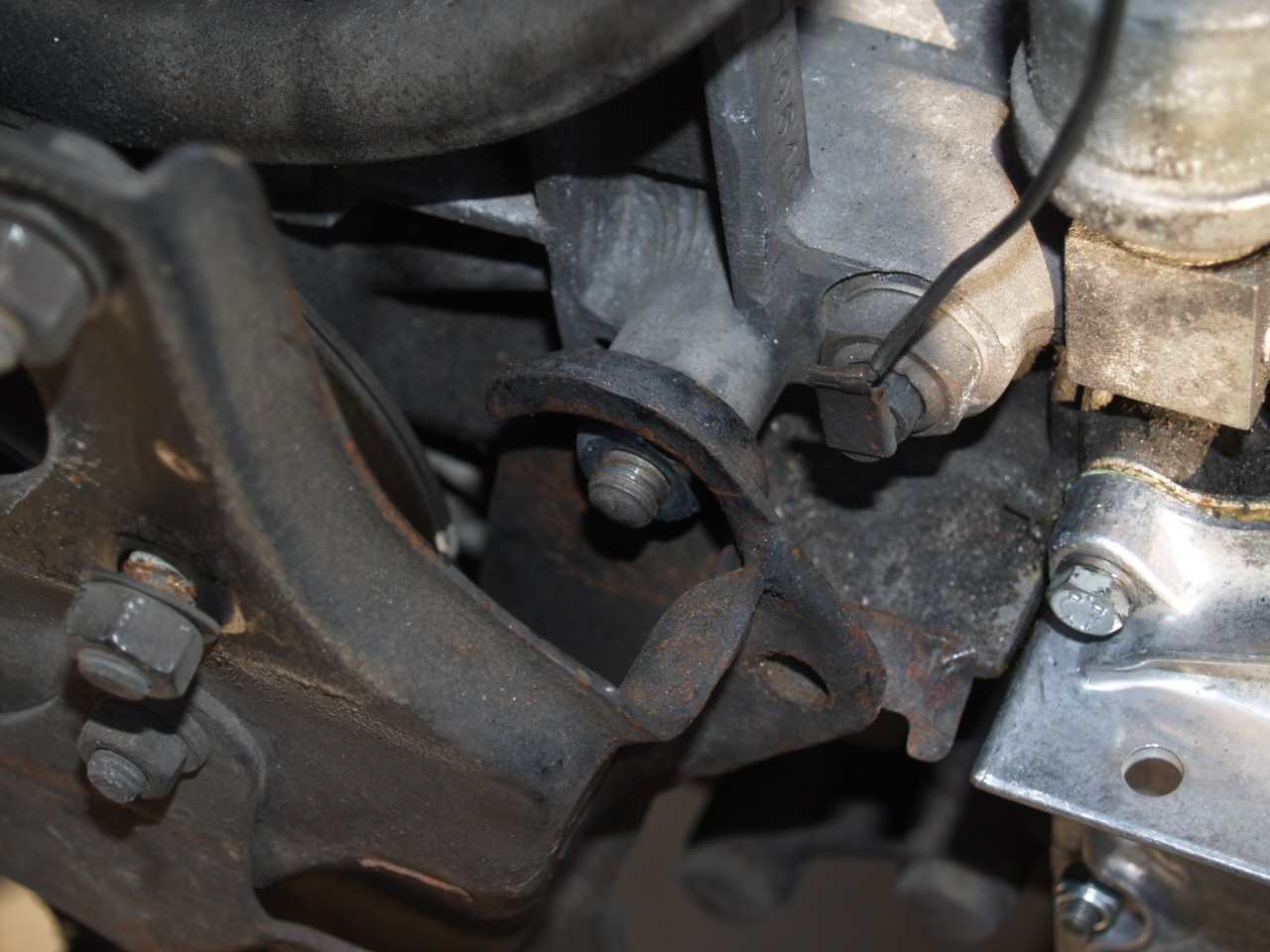 So here is a picture of one nut that I can remove. I am trying to remove the engine mount from a 2.7. This is the nut at the top right if you are facing the motormount. Seems pretty straight forward but my socket and wrench do not fit in the space and the box wrench just does not have quite enough depth or angle. Do you need a shallow socket or am I missing somthing??