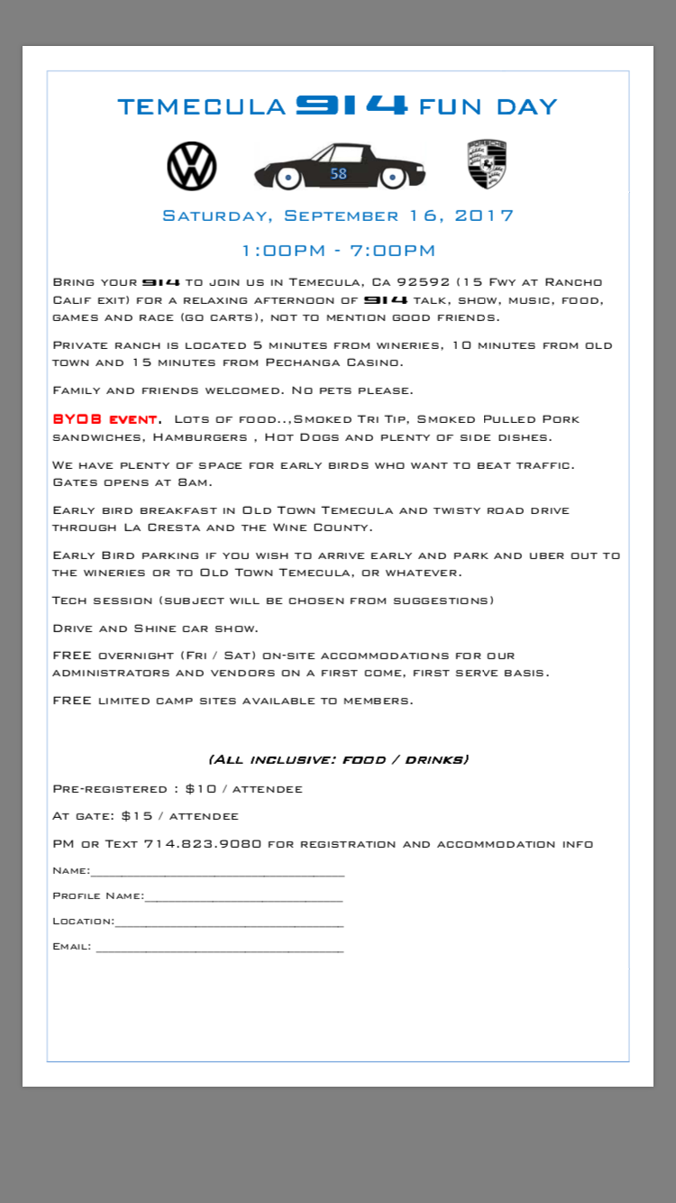Hello all , ValcoOscar, curbandgutter(Rudy) and myself sbc914, are organizing this 914 So CAL event. The attached flyer pretty much speaks for itself. We will provide regular updates to this thread as we go along.For the next several weeks,admins,and 914 world Forum vendors, have first dibs on securing on-site accommodations. Others Pm or text 714-823-9080.Video to come. Thank you and hope to see you all there! (IMG:style_emoticons/default/piratenanner.gif) (IMG:style_emoticons/default/first.gif) (IMG:style_emoticons/default/driving.gif) (IMG:style_emoticons/default/driving-girl.gif) (IMG:style_emoticons/default/sawzall-smiley.gif) (IMG:style_emoticons/default/smilie_pokal.gif) (IMG:style_emoticons/default/aktion035.gif) (IMG:style_emoticons/default/chowtime.gif) (IMG:style_emoticons/default/monkeydance.gif) (IMG:style_emoticons/default/jsharp.gif) <! :stromberg: ! width="420" height="315" src="https:// www.youtube.com/watch?v=8lSixWXukMo" frameborder="0" allowfullscreen></! :stromberg: !> |