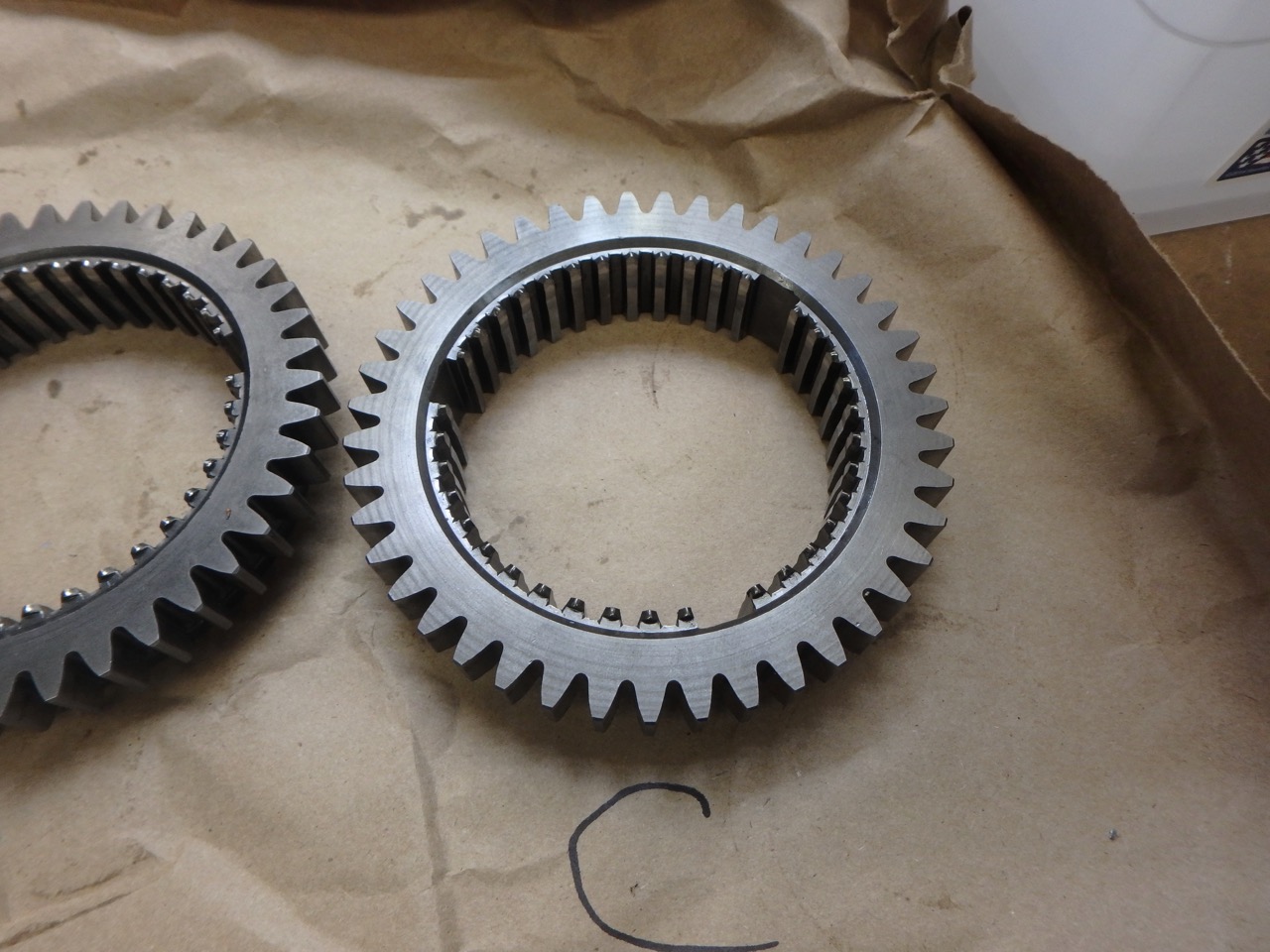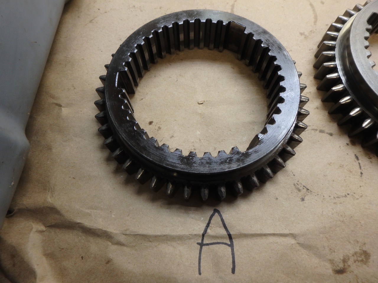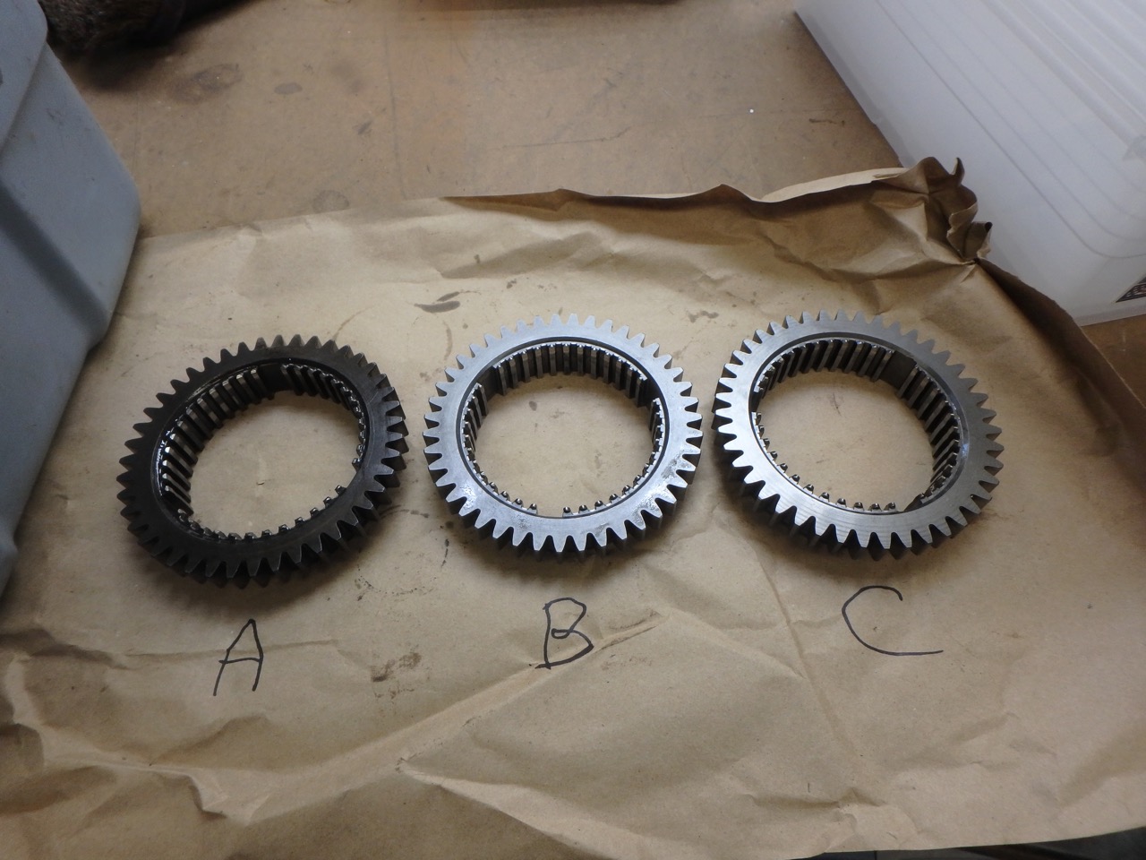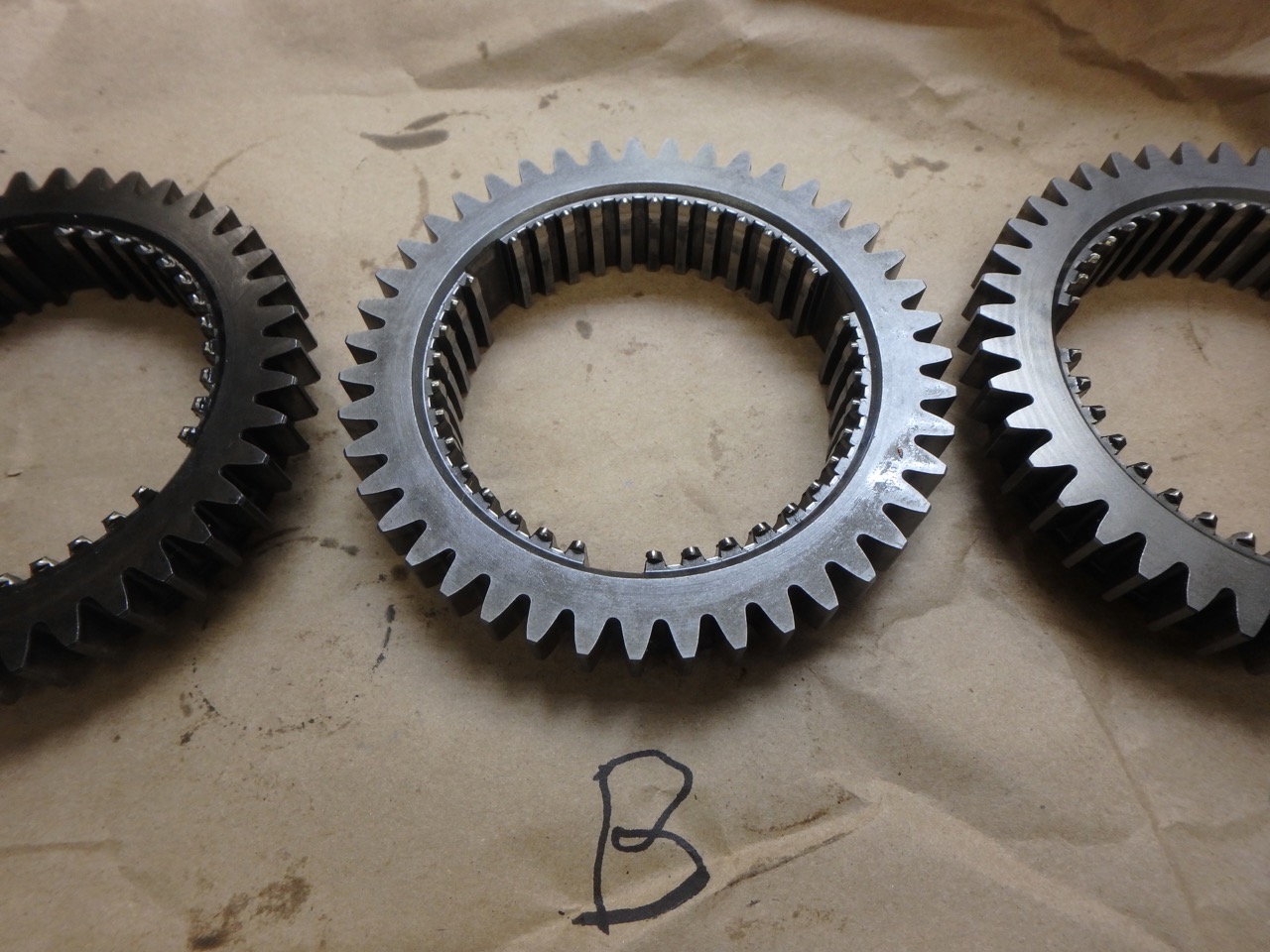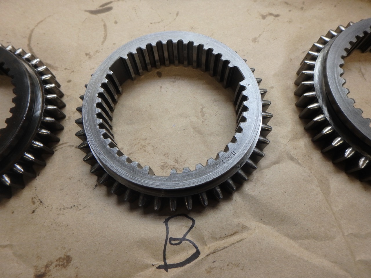 The syncro teeth should be sharp, not rounded. You also need to look at rails behind the teeth to make sure they make a smooth compression of the syncro ring as the gear engages. Sometimes they will wear and metal is smeared off to side; look for sharp edges. I once rebuilt a transmission that had so much metal displaced that 1st gear was blocked. That said, all 3 of your sleeves look pretty good even though it is hard to tell from pictures. A seems to be the best. |