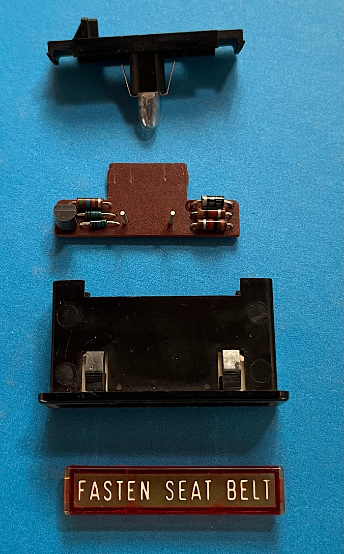 1 BC338 transistor (NPN type) – obsolete but data sheet is on Mouser, Digikey, etc. Note: Currently working to identify a suitable substitute I can swap and test. 2N3705 looks like a good substitute. The catch here is that the transistor needs to be TO-92 size to fit inside the very small Fasten Seat Belt housing. It also needs to have a rather large collector current to support the incandescent lamp current (80-100 mA) + the buzzer solenoid current (TBD). The BC 338 data sheet lists Ic as 800mA, 625 mW power capacity. 2 resistors – 1K ohms (brown, black, red) 1 resistor – 560 ohms (green, blue, brown) 3 diodes – exact type unknown marked ITT. Blue glass case with 2 cathode bands but no numerical ID numbers. Measures as 0.6v forward current drop so its a silicon diode. Suitable replacement 1N4001 silicon diode tried and tested OK. Bulb incandescent Osram 12v, 1.2W. (grain of rice style bulb - actual current draw 90mA). Future project – replace with LED. |