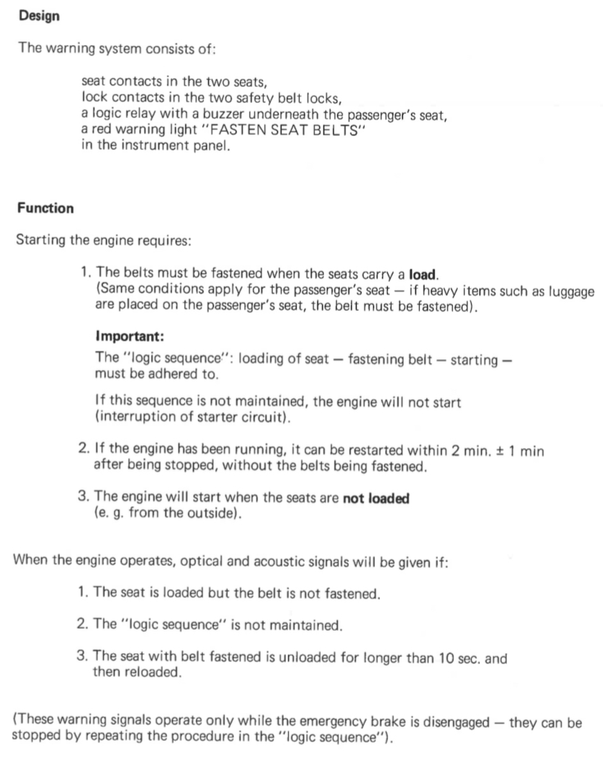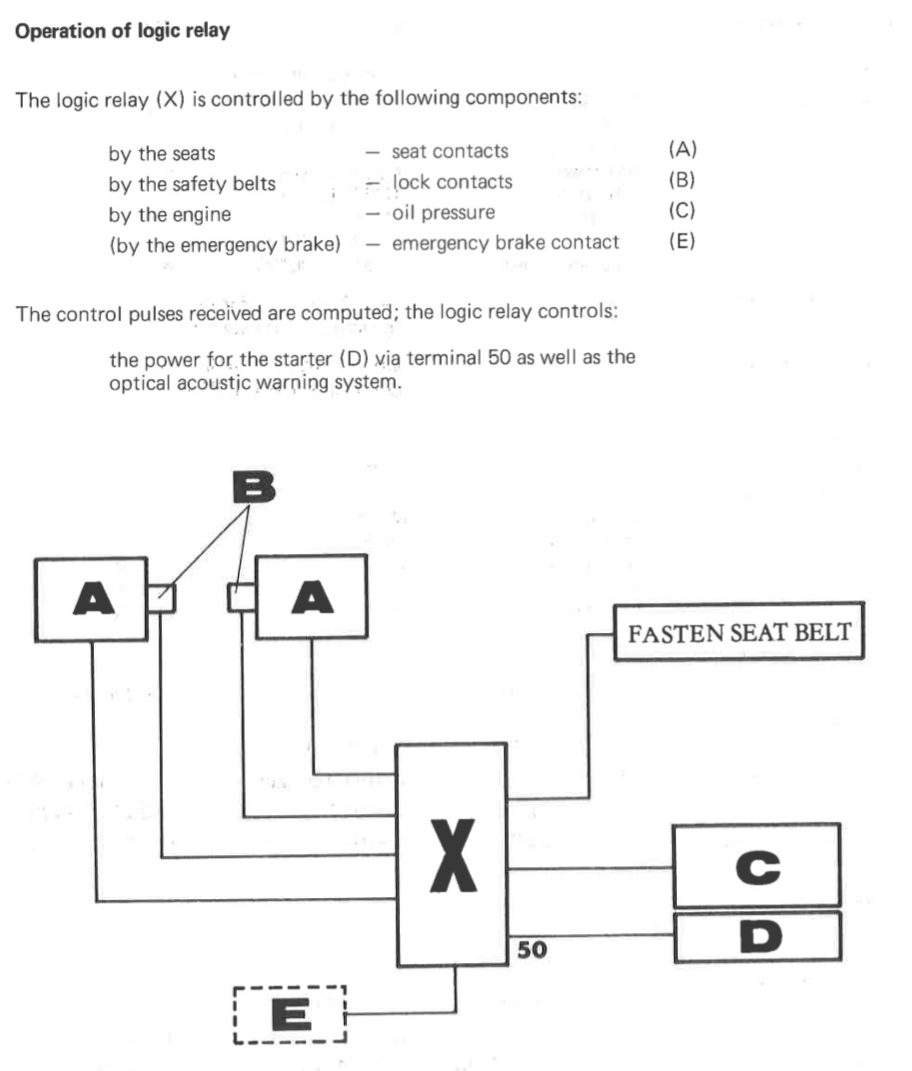 My curiosity in this part is the result of the Haynes manual which only shows the interlock relay as a “black box” and makes little mention of how it actually works. This is in contrast to the simple Fasten Seat Belt light used in 72’ & 73’ that at least has a notional schematic but just lacks the actual component details.
