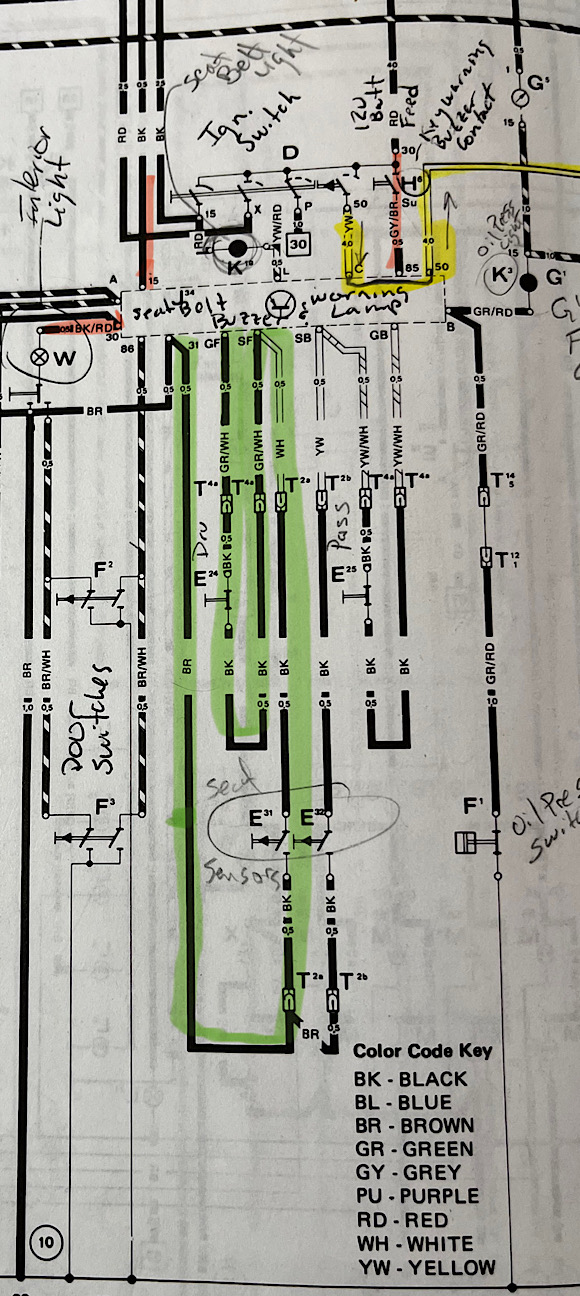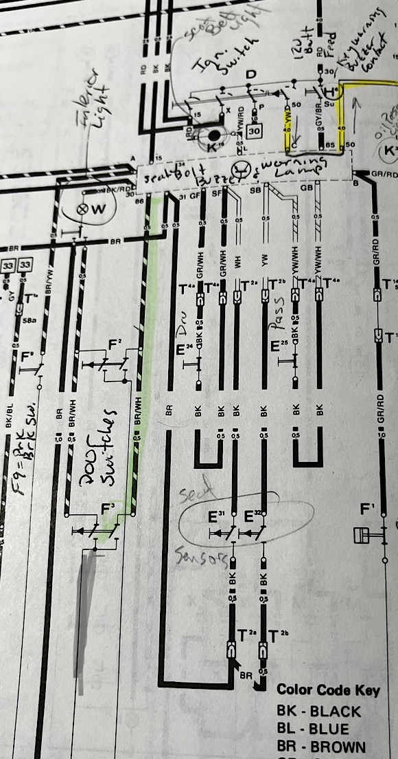 If a switched ground is addd to pin 86 representing an open door the buzzer will start screeching. This is shown in the video as the green switched ground wire contacting pin 86. When the door is closed, the switched ground is removed from pin 86 and the buzzing related to the key in ignition is silenced. The other way the buzzer can be silenced when the door is open is to remove the key from the ignition. When the key is removed, 12v power will be removed from pin 85. This is shown in the video as removal of the red 12v power from pin 85. This is the schematic: https://www.youtube.com/watch?v=XaIyrzDqc9A?si=LNyjKM6TgSI4igj Note: disregard the yellow starter circuit - I color in my books like a kid and unfortunately that is on the page and not a digital edit (IMG:style_emoticons/default/rolleyes.gif) |