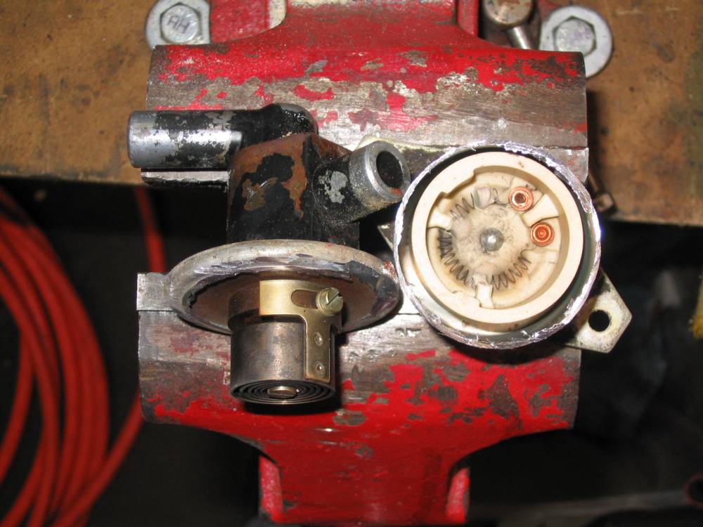 I removed the ceramic cup and bits then put the top part (the spring and holder) back onto the housing. A couple of tack welds to hold it together then filled the seam with hi-temp silicone sealer (the copper-looking stuff). The housing didn't want to weld back together very well and left a white silky residue so I think the housing is zinc'd or something. It is ferrious (magnetic). I left the holes where the rivets and pigtail are located at the bottom of the housing open. This will allow oiling if it should need it plus let heat in and moisture drain since I'm not sure how good my silicone seal will hold up.