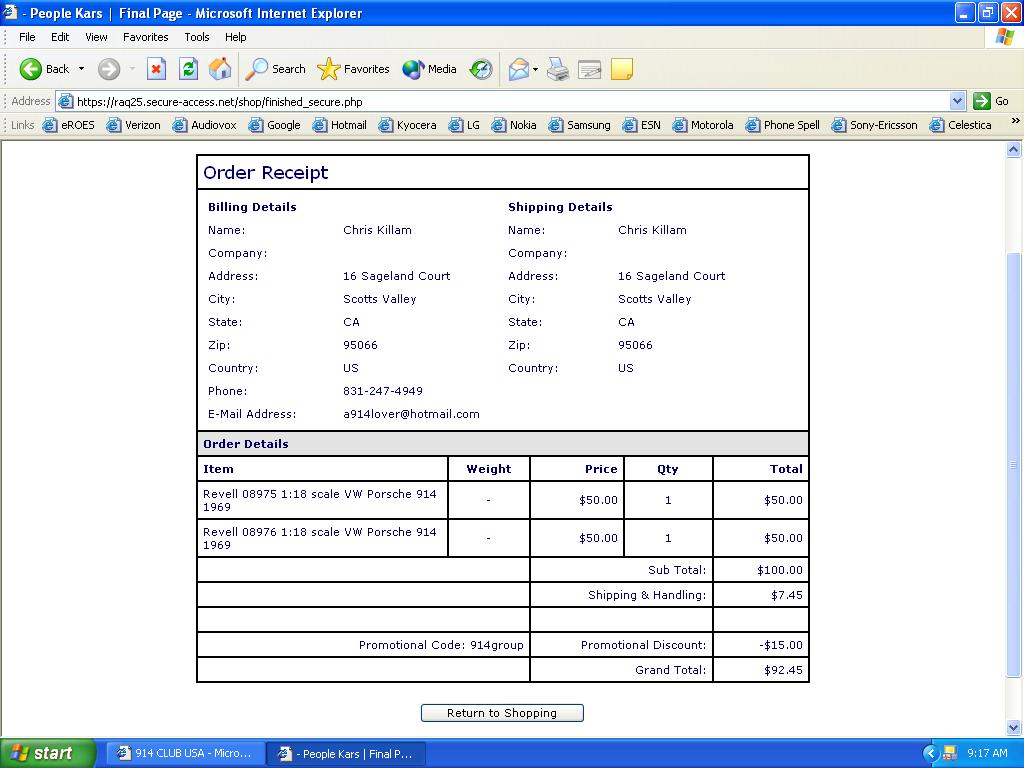 Note: when ordering you enter the promotional code "914group" after you enter your shipping and ordering info. Just look for it, it is toward the end of the process. Happy Thanksgiving!!! (IMG:style_emoticons/default/smilie_flagge6.gif) Hello Paul, I have an answer for you regarding the Revell 914 models. I should have some inventory of the 914 models by December 18th. With more arriving in late December/early January. The retail price is $50.00, which is standard for Revell Germany die-cast. The attention to detail is quite exceptional on their die-cast models. I will however offer a 15% discount to the 914 club members when they enter the promotional code: 914group. Here is the information to pass along to the 914 club members. If they have any questions they may contact me directly. Hope this helps! You can pre-order the 1:18 scale Revell Germany Porsche 914 model in either yellow or blue by visiting the People Kars website at www.peoplekars.com. Click on the Revell page or follow this link: www.peoplekars.com/Revell.htm. You can either place a $10 non-refundable deposit on the item or pay in full. Please note that if you enter the promotional code "914group" when using the $10 deposit option, the shopping cart will only show a %15 discount of the $10.00. The discount WILL apply to the entire order of $50.00, not the $10.00. Also, please note that the %15 discount is only applicable to the Revell 914 model, although you are welcome to add other items to your order. The first shipment of Revell 914 models is expected on December 18th and we will begin shipping the models in the order that orders were placed. If you have any questions please contact us. Frank Konisky People Kars www.peoplekars.com |