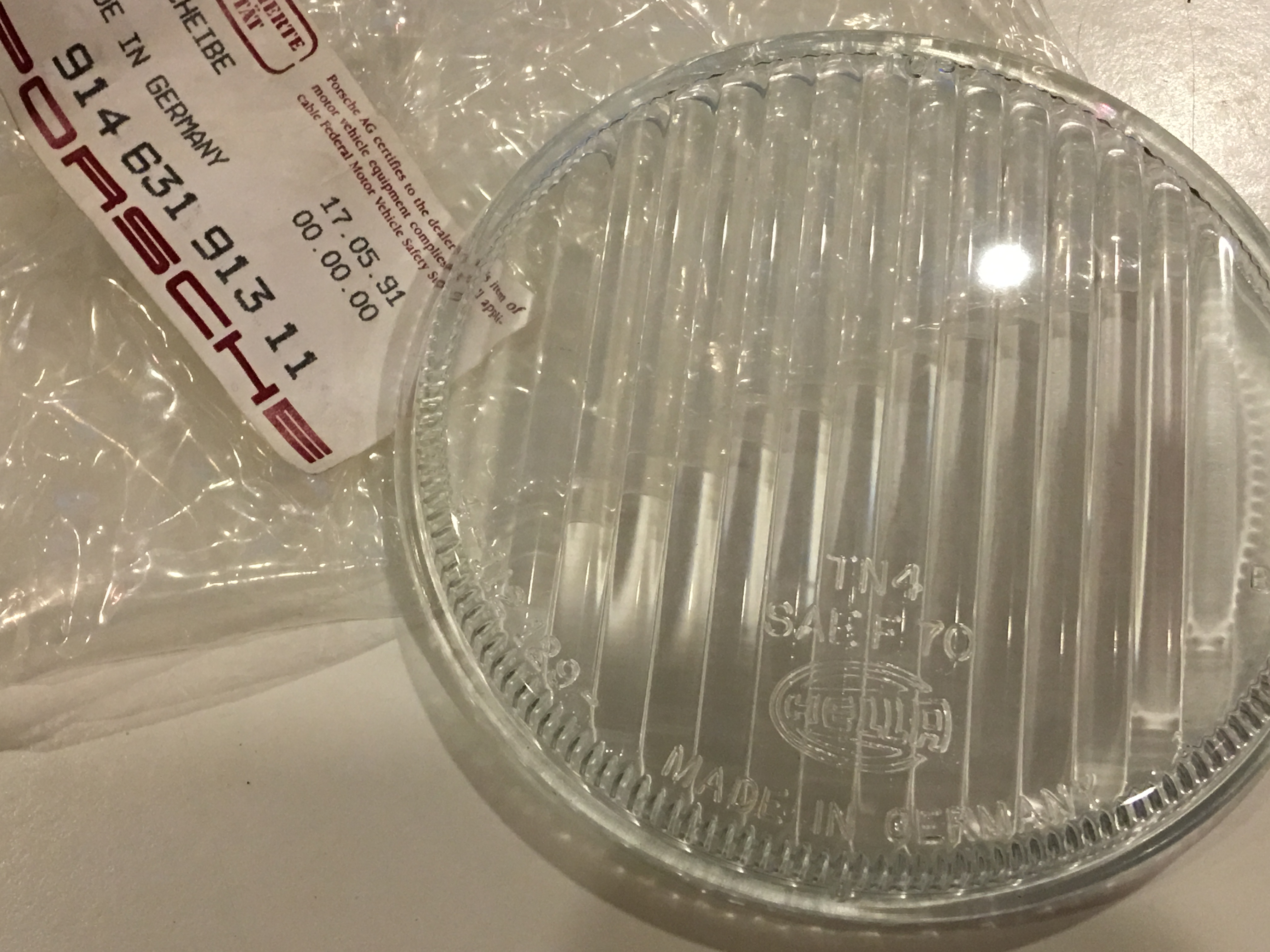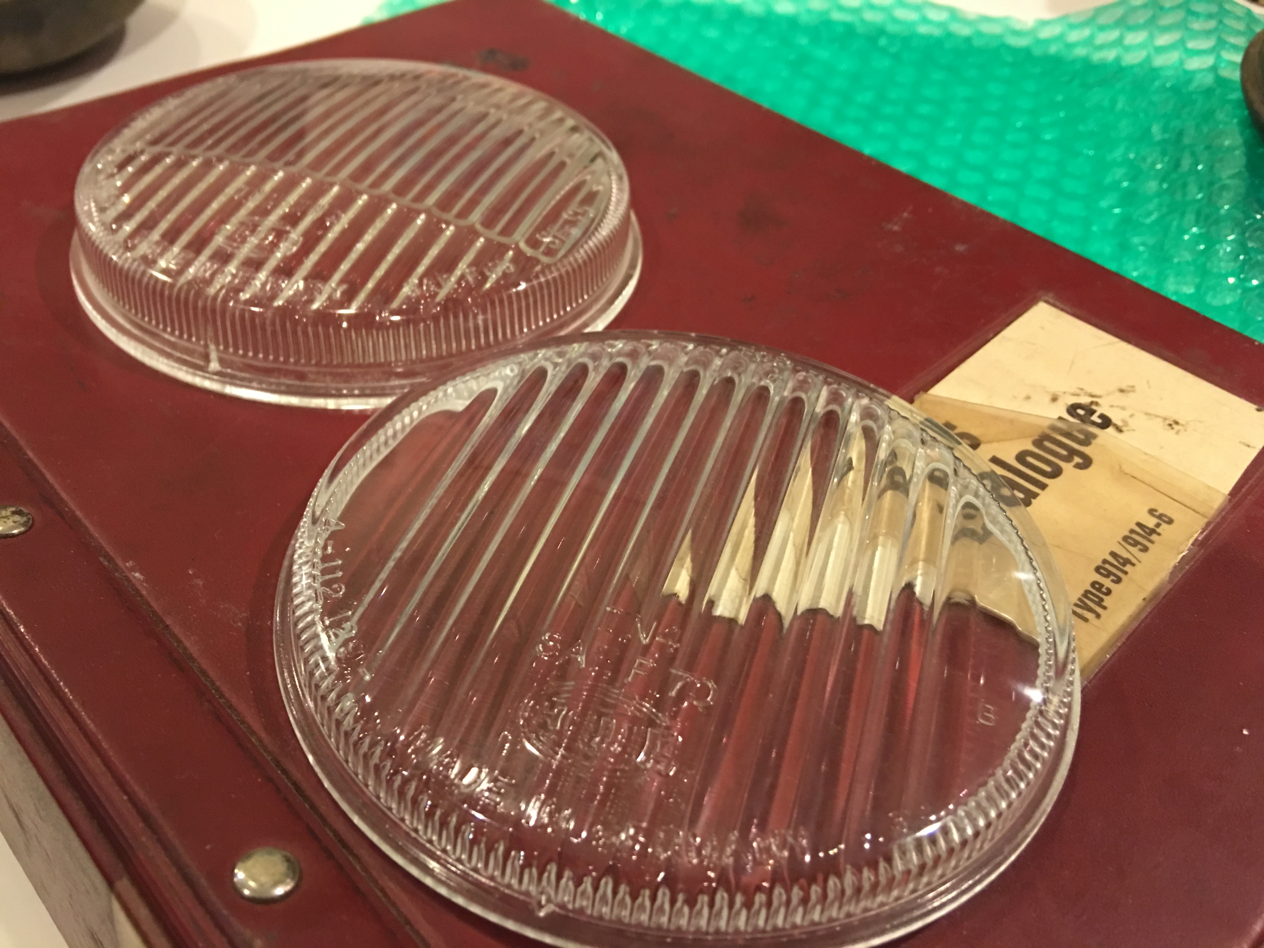 The earlier is thicker and has a horizontal marking below the equator. The later lens has vertical striations only. Early lens is on the right, later on the left: (IMG:http://www.914world.com/bbs2/uploads_offsite/farm4.staticflickr.com-7438-1396226791.1.jpg) The newer lens has Hella numbers (not pictured) 6-112129 (IMG:http://www.914world.com/bbs2/uploads_offsite/farm8.staticflickr.com-7438-1396226792.2.jpg) The older lens has Hella numbers (not pictured) 2-51764 with a prefix K8201 Note the horizontal feature in this closeup: (IMG:http://www.914world.com/bbs2/uploads_offsite/farm8.staticflickr.com-7438-1396226793.3.jpg) In this dramatic photo, the older lens is on the bottom and is noticeably thicker than the later lens. (IMG:http://www.914world.com/bbs2/uploads_offsite/farm4.staticflickr.com-7438-1396226793.4.jpg) The parts manual lists the main part number in the topic title as "light-diffusing lens, white, for additional headlamp." The accompanying diagram is confusing, however. Other numbers for the fog light specifically list a part number of 914.631.952.10, "light diffusing lens, white, for H3 + H1 fog headlamp, not for 914 1.8" and 914.631.930.10 has exactly the same description except is a yellow lens. Paul |