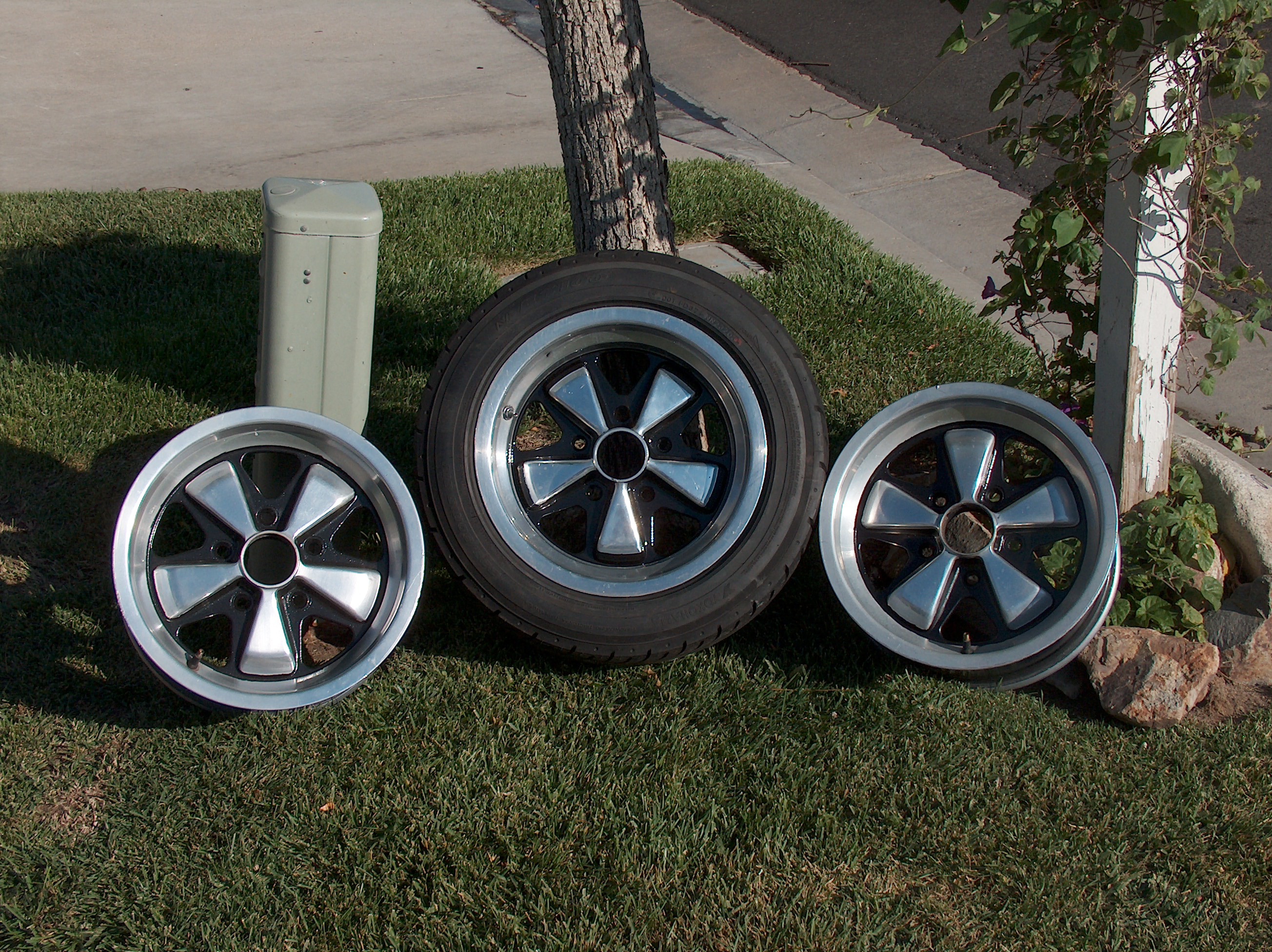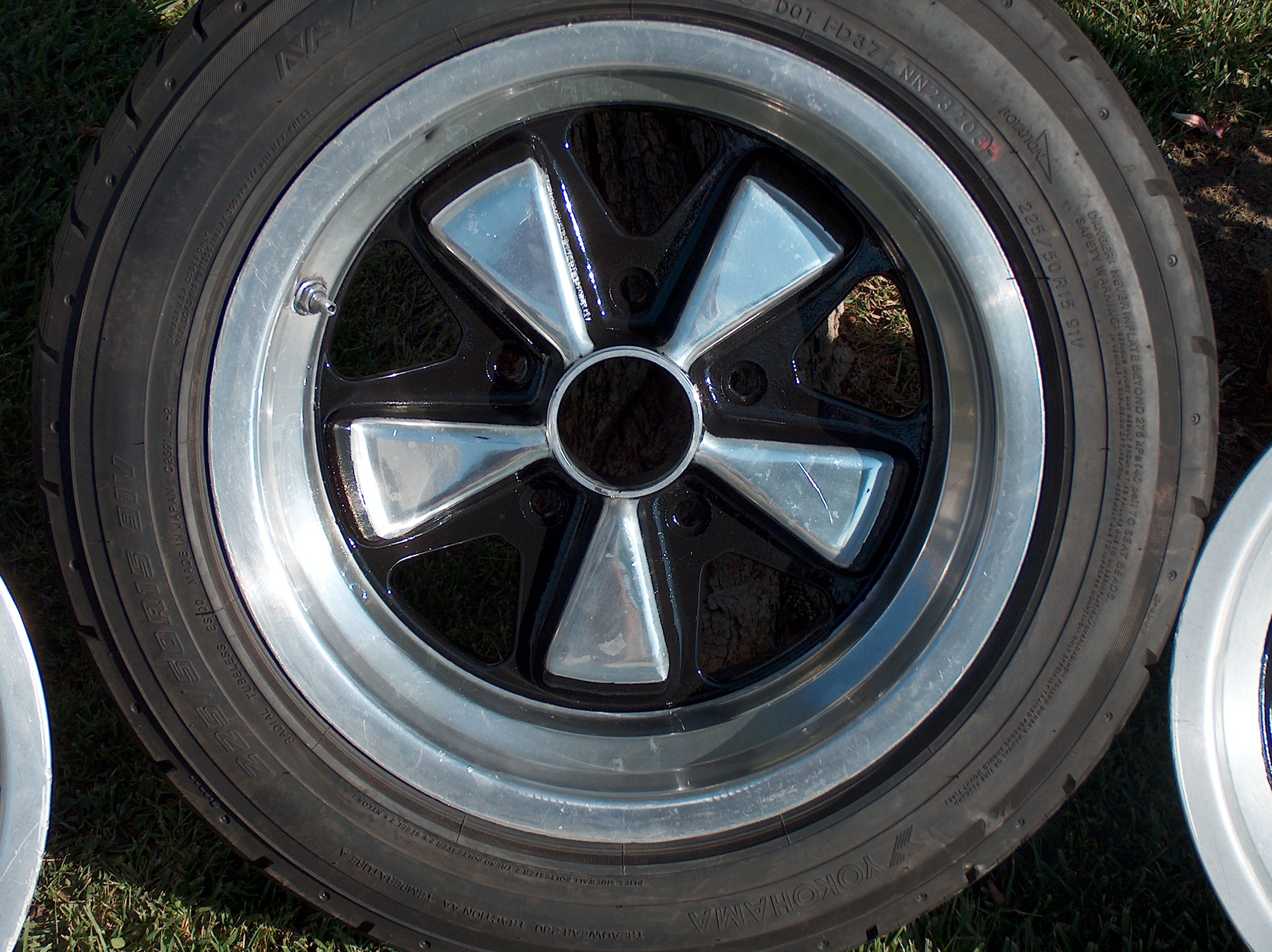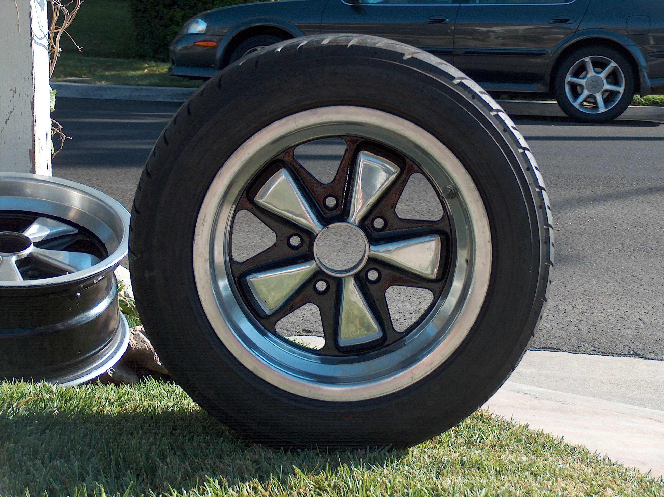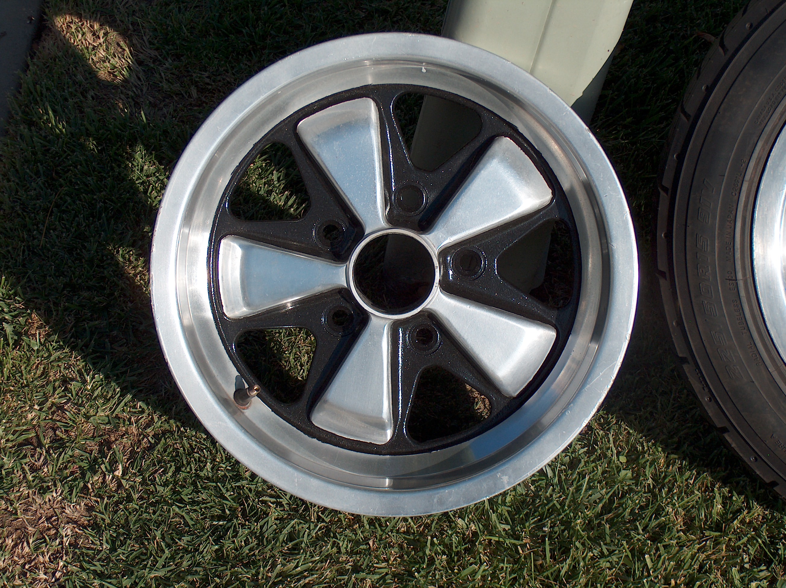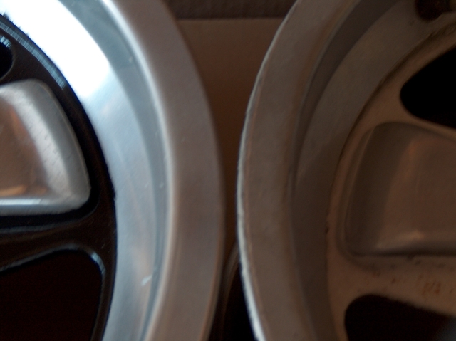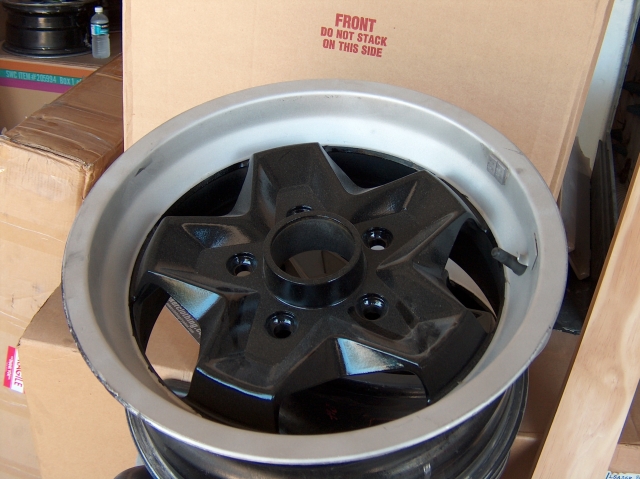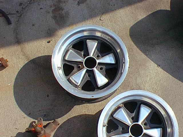 spent a day or two futzing with this pair of 15x7's. one down one to go..... (third pic shows before and after) also - one of my 4 15x7 cookie track wheels next shown...my 15x8 fuchs 15x7/8 with 225's front and rear.... all wheels have 112mm backspacing, this they shoud ALL clear the inner fender just fine..... Attached thumbnail(s)