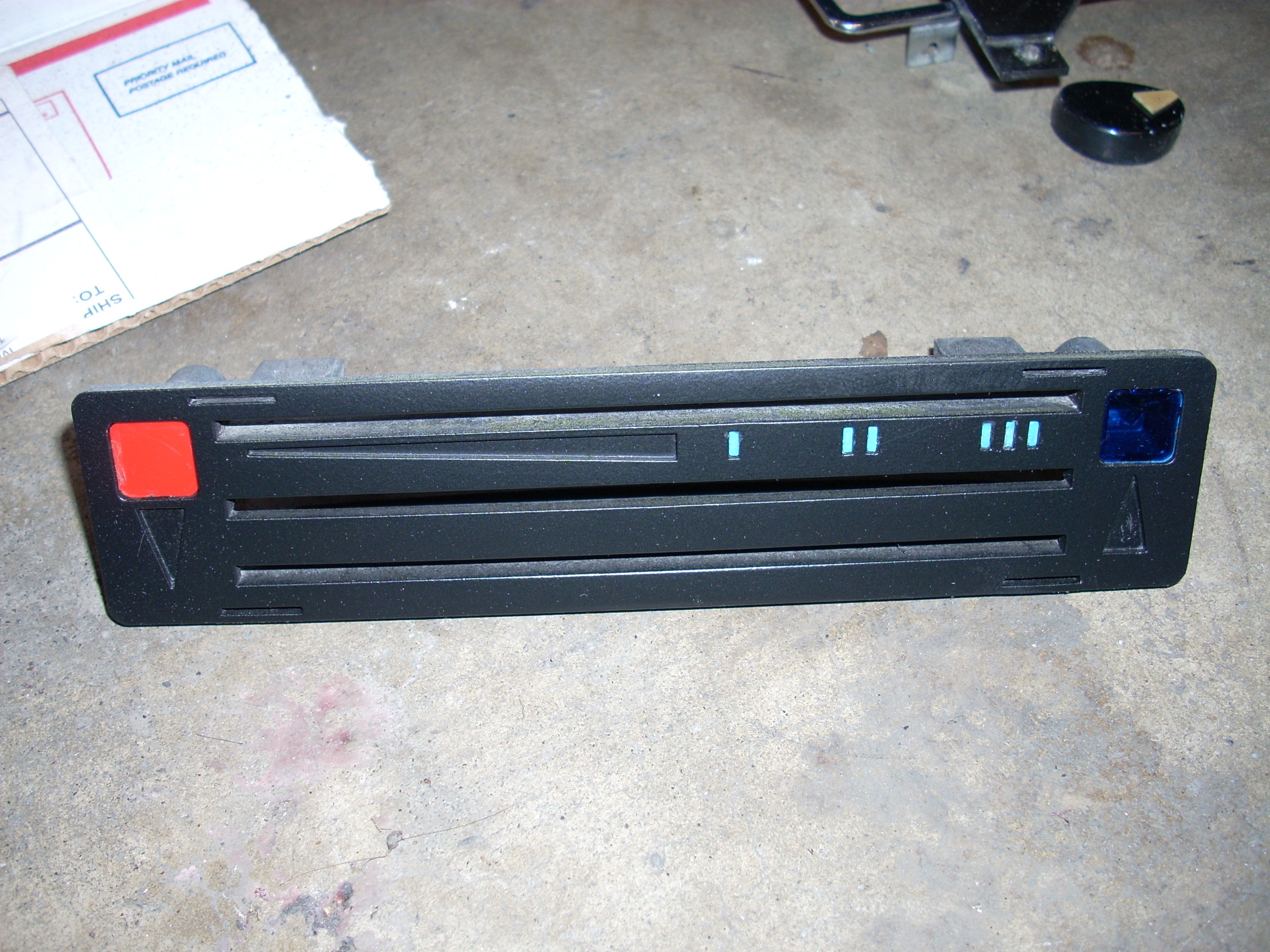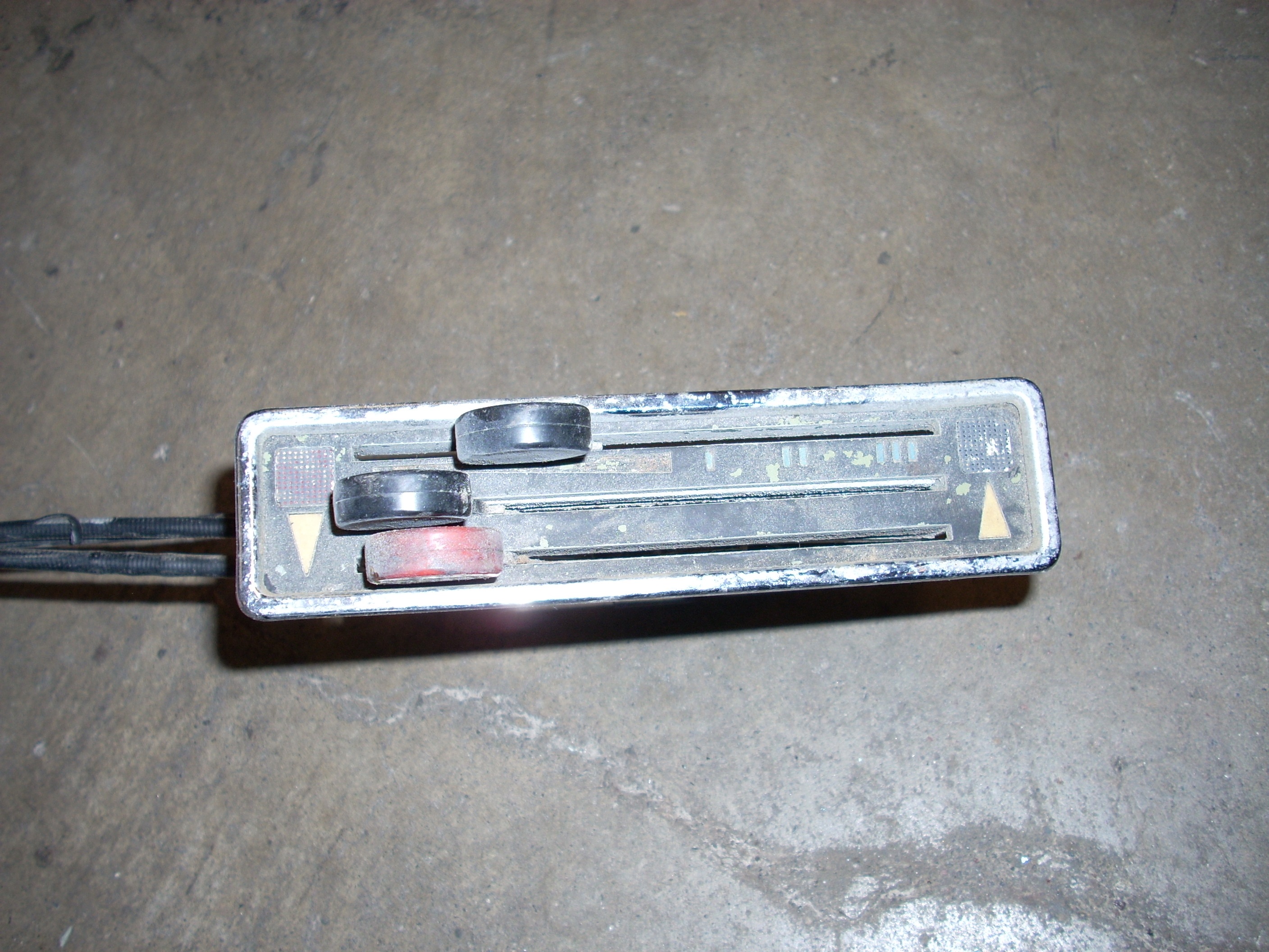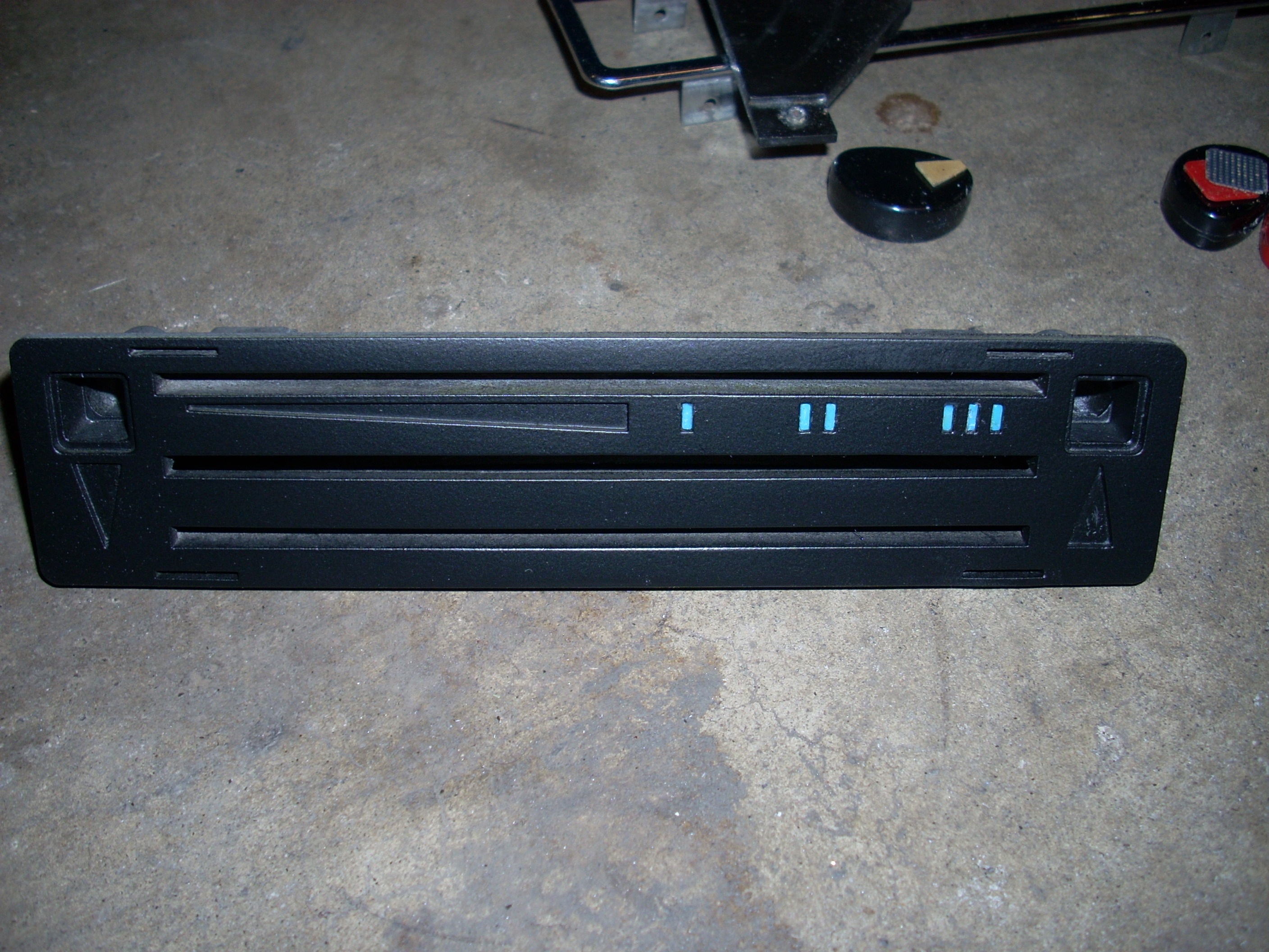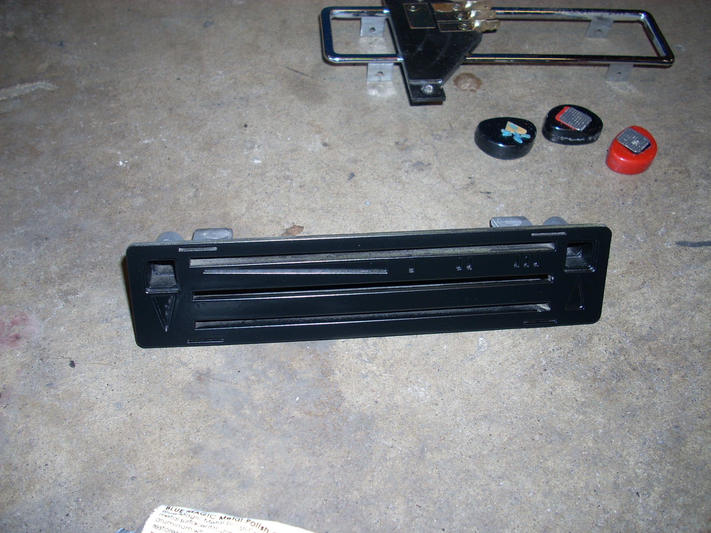 The official first part has begun... These heater controls are the early/european type without words. I like that. Here's what we had to start with: Pulled off the trim ring and hit it with some fine steel wool. Unfortunately the chrome is pitted, so it'll have to be replated. Nasty knobs pop right off. After a thorough cleaning with alcohol and a little polish, they look like new. I cut the rivets holding everything together. Two are holding the cast front section to the rear plate. And two are holding the 'circuit board' to the plate. I also removed the control arms by undoing the circlip and pushing out the pivot pin. The 'circuit board' cleaned up really nicely with a Dremel using a wire wheel tip for the cleaning and a felt pad tip with Blue Magic metal polish for the shine. The red and blue colored lenses and the aluminum 'grills' pop out with a little push from the back (through the light bulb hole). The white and blue accent pieces pop out using the corner and edge of a razor blade. You can see all the blue 'tick marks' and one of the arrows (with a broken tip). Now that the face was relieved of all the 'extra' pieces, I removed all the old paint and sprayed it with flat black enamel. I cleaned each individual blue piece by rubbing it on some 1500 grit sandpaper taped to glass, then rubbing it in some Blue Magic polish. I then glued each one back in with gel type SuperGlue. Keeping track of and working with those little suckers is a major PITA! Then I glued in the lenses, and finally I sanded, painted and glued on the aluminum 'grills'. All of the arrows were either broken or missing, so I'll have to search for replacements. I wouldn't mind finding some reflective material to use instead of plain white arrows. The arms and plate will be sent out in a batch of yellow zinc plating. So until those come back from the platers, this episode is over. Time spent this episode: 2.5 hours Total time overall: 2.5 hours Total cost of this episode: $0 Total cost overall: $0