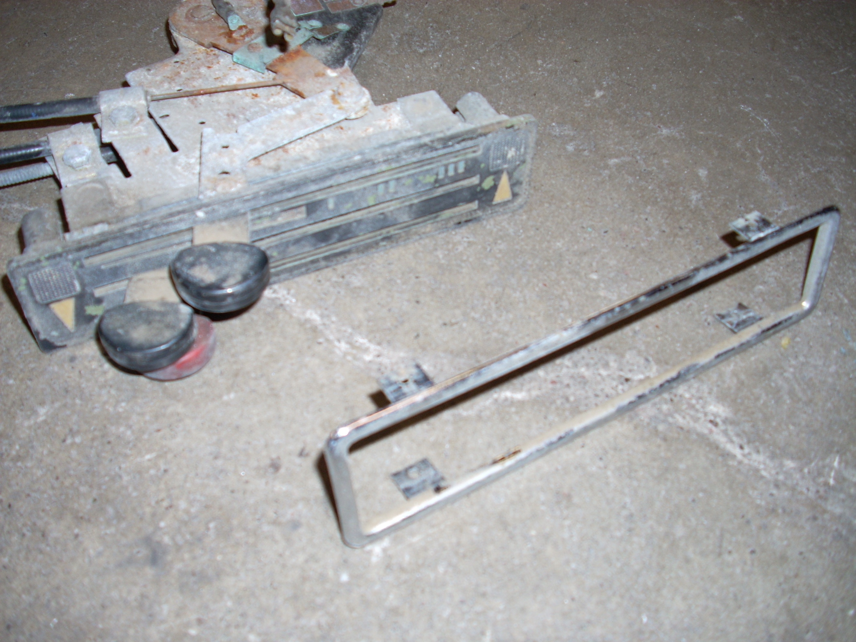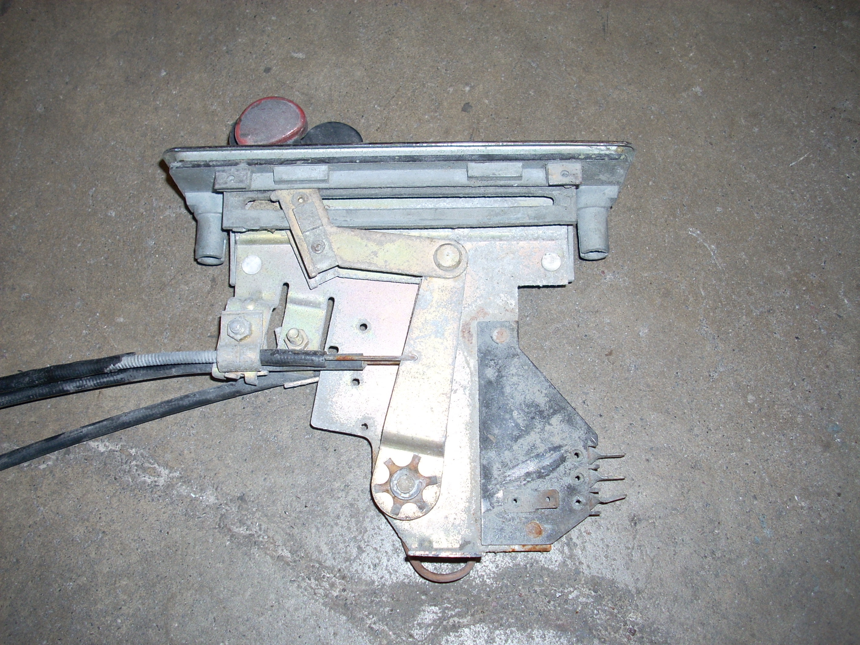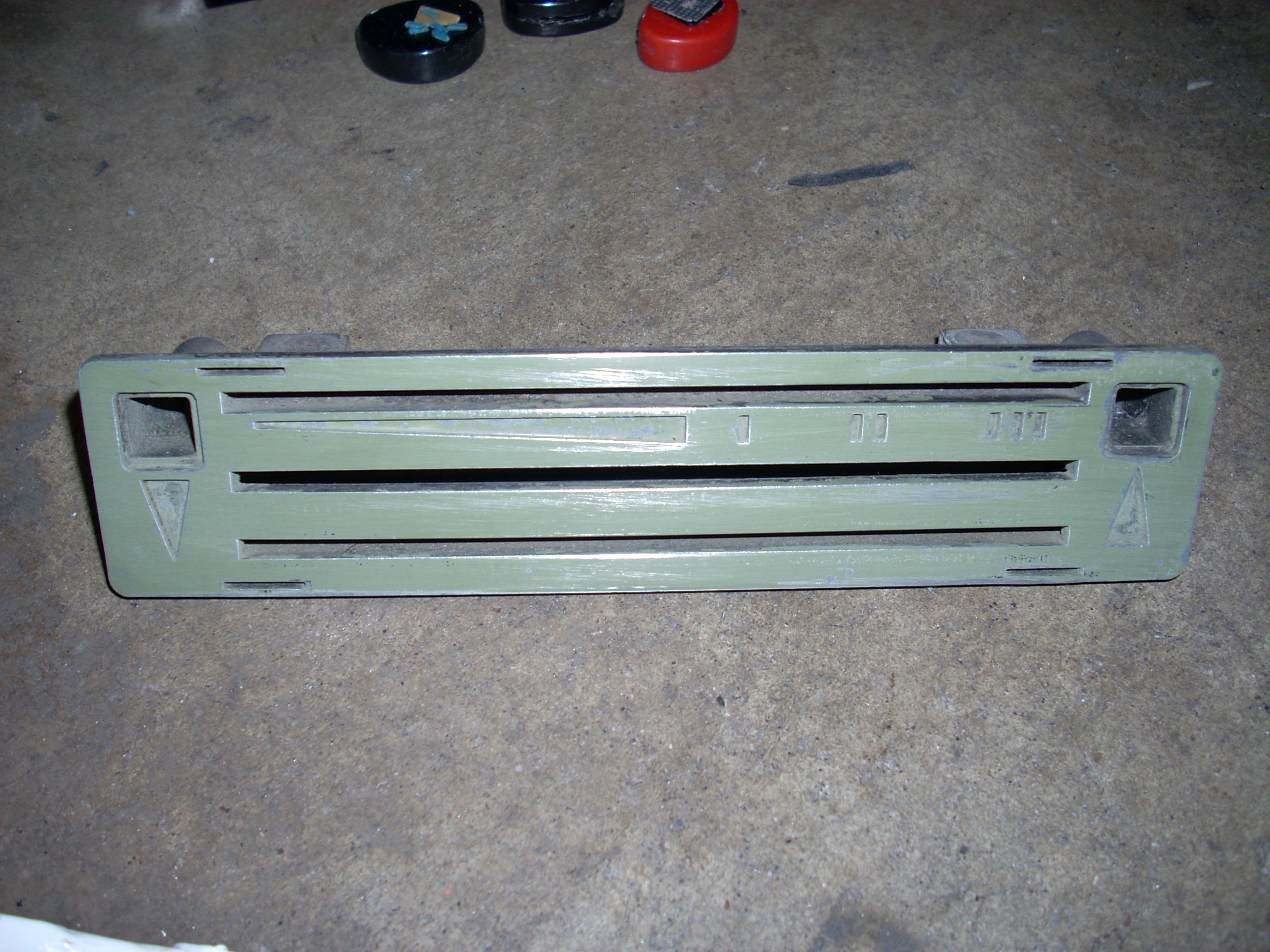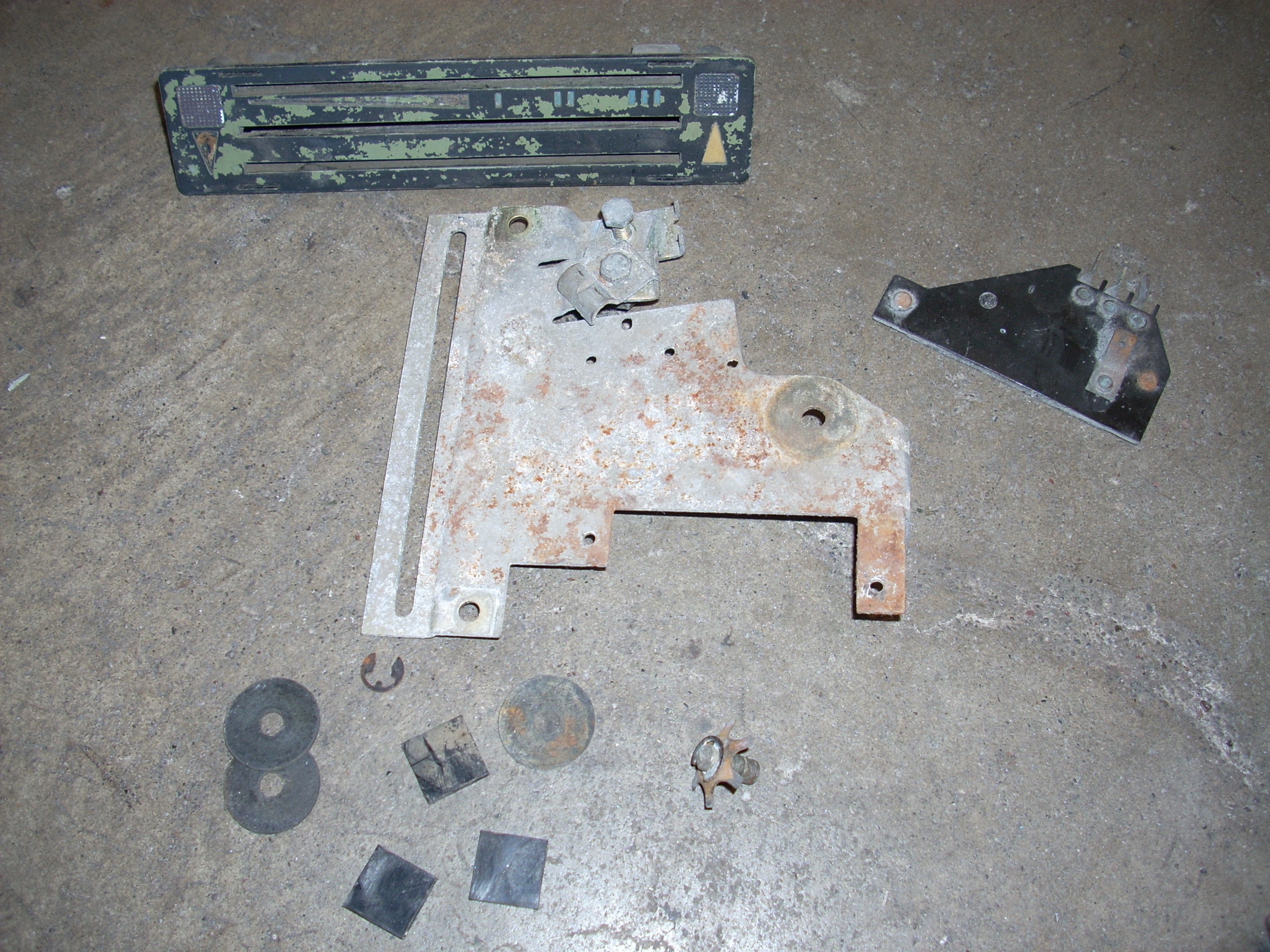 The official first part has begun... These heater controls are the early/european type without words. I like that. Here's what we had to start with: Pulled off the trim ring and hit it with some fine steel wool. Unfortunately the chrome is pitted, so it'll have to be replated. Nasty knobs pop right off. After a thorough cleaning with alcohol and a little polish, they look like new. I cut the rivets holding everything together. Two are holding the cast front section to the rear plate. And two are holding the 'circuit board' to the plate. I also removed the control arms by undoing the circlip and pushing out the pivot pin. The 'circuit board' cleaned up really nicely with a Dremel using a wire wheel tip for the cleaning and a felt pad tip with Blue Magic metal polish for the shine. The red and blue colored lenses and the aluminum 'grills' pop out with a little push from the back (through the light bulb hole). The white and blue accent pieces pop out using the corner and edge of a razor blade. You can see all the blue 'tick marks' and one of the arrows (with a broken tip). Now that the face was relieved of all the 'extra' pieces, I removed all the old paint and sprayed it with flat black enamel. I cleaned each individual blue piece by rubbing it on some 1500 grit sandpaper taped to glass, then rubbing it in some Blue Magic polish. I then glued each one back in with gel type SuperGlue. Keeping track of and working with those little suckers is a major PITA! Then I glued in the lenses, and finally I sanded, painted and glued on the aluminum 'grills'. All of the arrows were either broken or missing, so I'll have to search for replacements. I wouldn't mind finding some reflective material to use instead of plain white arrows. The arms and plate will be sent out in a batch of yellow zinc plating. So until those come back from the platers, this episode is over. Time spent this episode: 2.5 hours Total time overall: 2.5 hours Total cost of this episode: $0 Total cost overall: $0