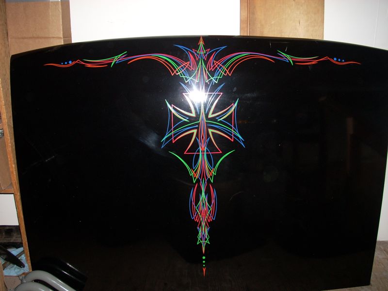 My neighbor has been playing around with pinstriping and so I offered my decklid for practice. Here are the results. Really beautiful. Of course this will go away once I paint the exterior, but it's fun for now. I kind of love having a 'beater' that I can do this kind of stuff to. Attached thumbnail(s)