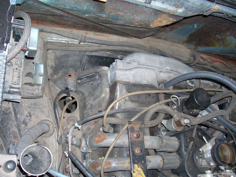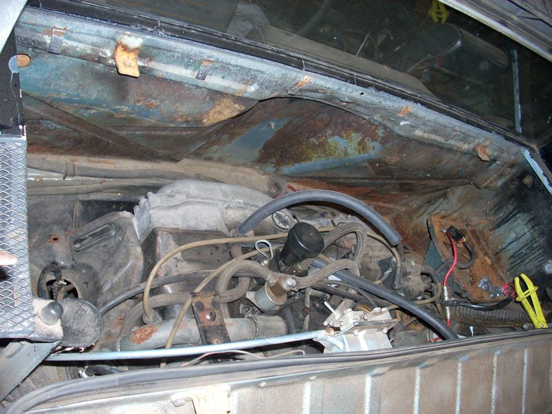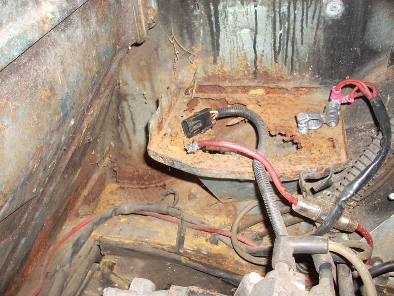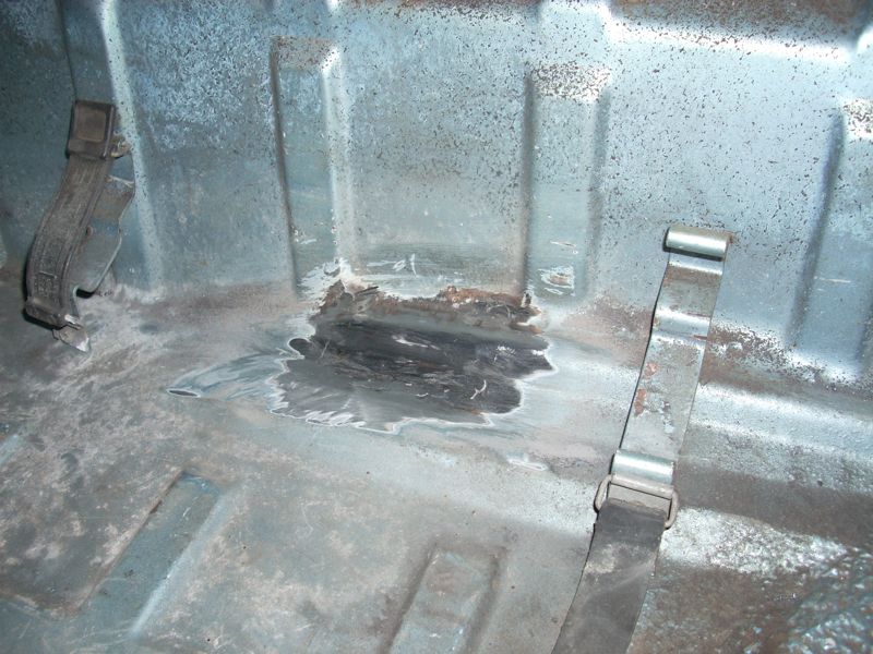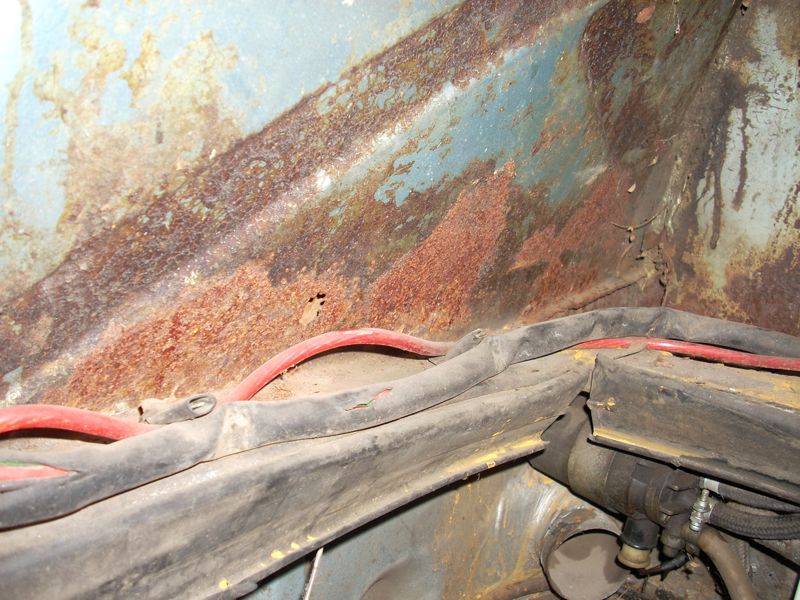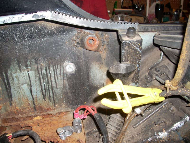 I think it was the Tied House meet that gave me the kick in the pants, but I finally decided to jump in and get started on my car. It's been begging for work for a long time. I'm starting with the rear end sections. Can't wait for it to actually DRIVE! 1. Pull the motor and fix oil leaks, pull the ceramic lifters, clean everything, install carbs (for now). 2. Fix the hell hole and firewall rust, plus weld all the little holes in the firewall. New battery tray and new rear trunk pivots. 3. Fix the 'access hole' some DAPO cut in the rear trunk. The top starter bolt is not THAT hard to get to. 4. Clean and paint the engine bay and rear trunk. 5. Clean and reseal the transmission and replace the speedo angle drive. Here are the pictures from day one. Attached thumbnail(s)