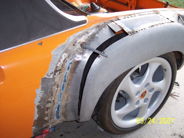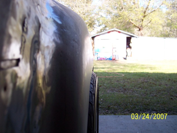This weekend was a good one for the old flare switch. Got the repo flares cut and started the 2" widening process. The amount needed to widen is shown in the photo with tire on sticking out past the stock flare. Tire is a 265, on a 18X10 rim w/a 40MM offset setting on a 2" spacer. I've now got everything about 60%done on the rear. Hopefully I'll be completely done in about 2 weeks. Ron Attached thumbnail(s) |