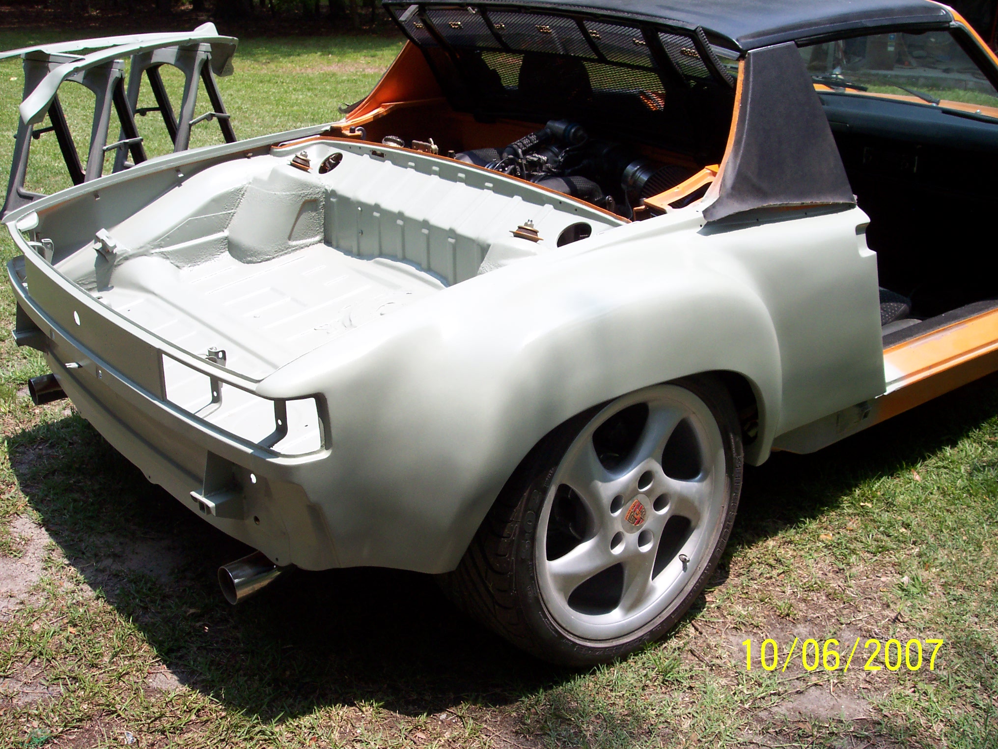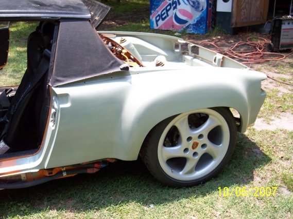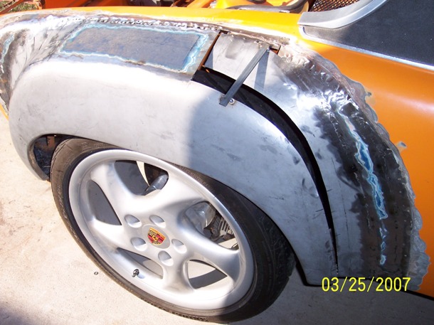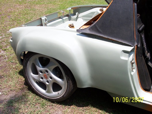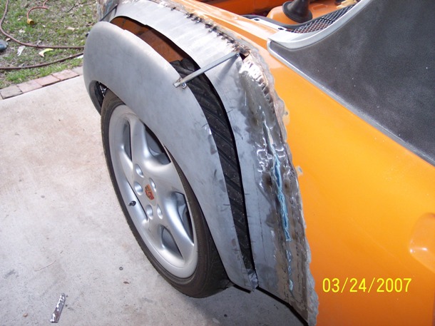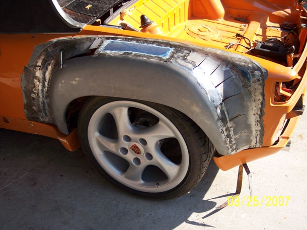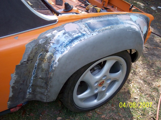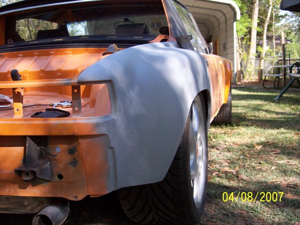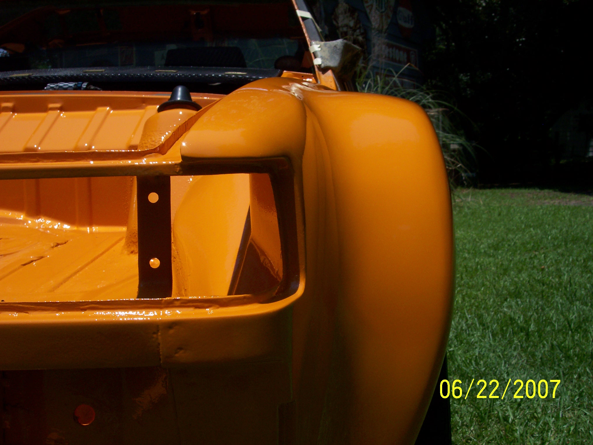 I haven't posted an update in a while,but I have been working on the rear flares steadily. Everything is pretty much done.The rockers,and rear valance all line up to their respective edges. The epoxy primer is laid for the final time.I'll soon be wet sanding it to fully level it out,then everything is ready for the final top coat. Top coat is RM's Diamont basecoat clearcoat in Signal Orange. At $450.00 a kit for the paint,that is why I'm taking so long to get it as best as I can before the final topcoat. It's almost done,but not soon enough for me. Ron Attached thumbnail(s) Entries on Monday 9th April 2007