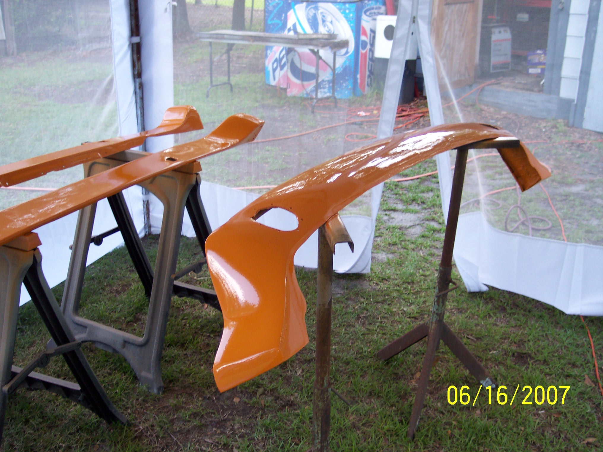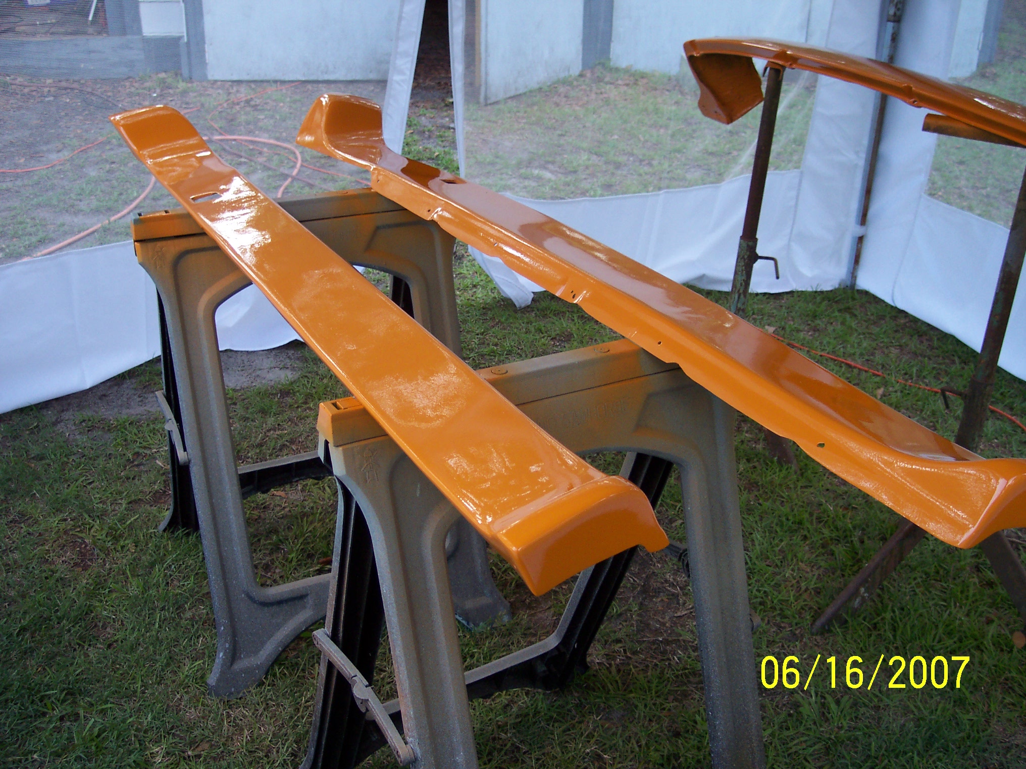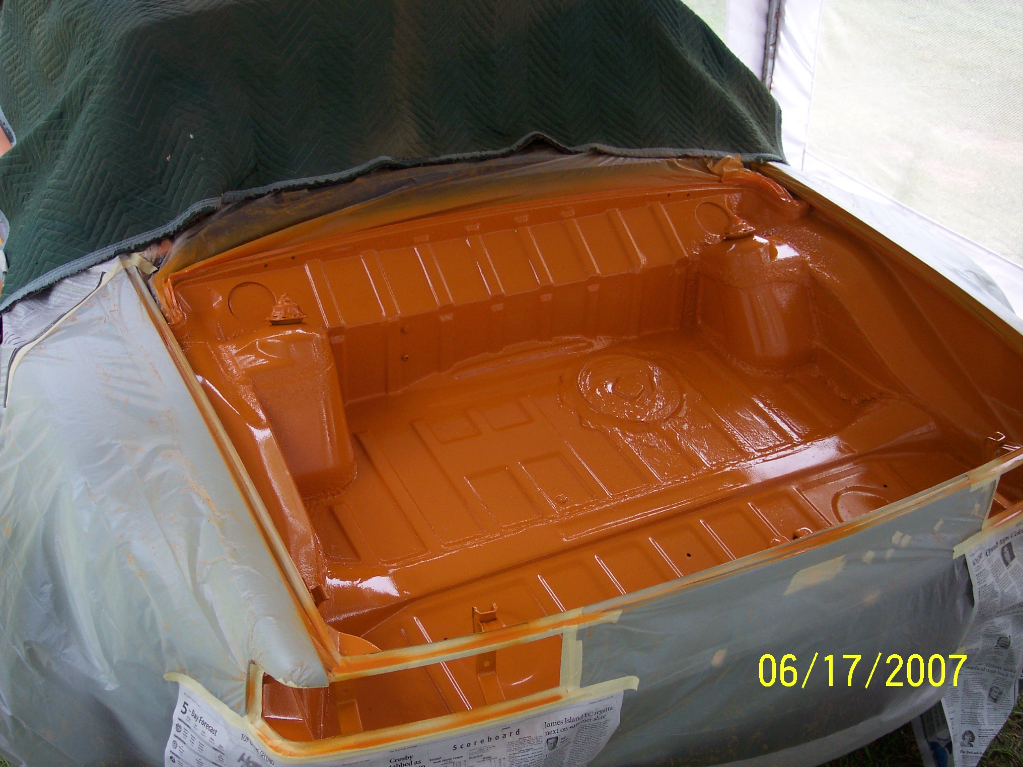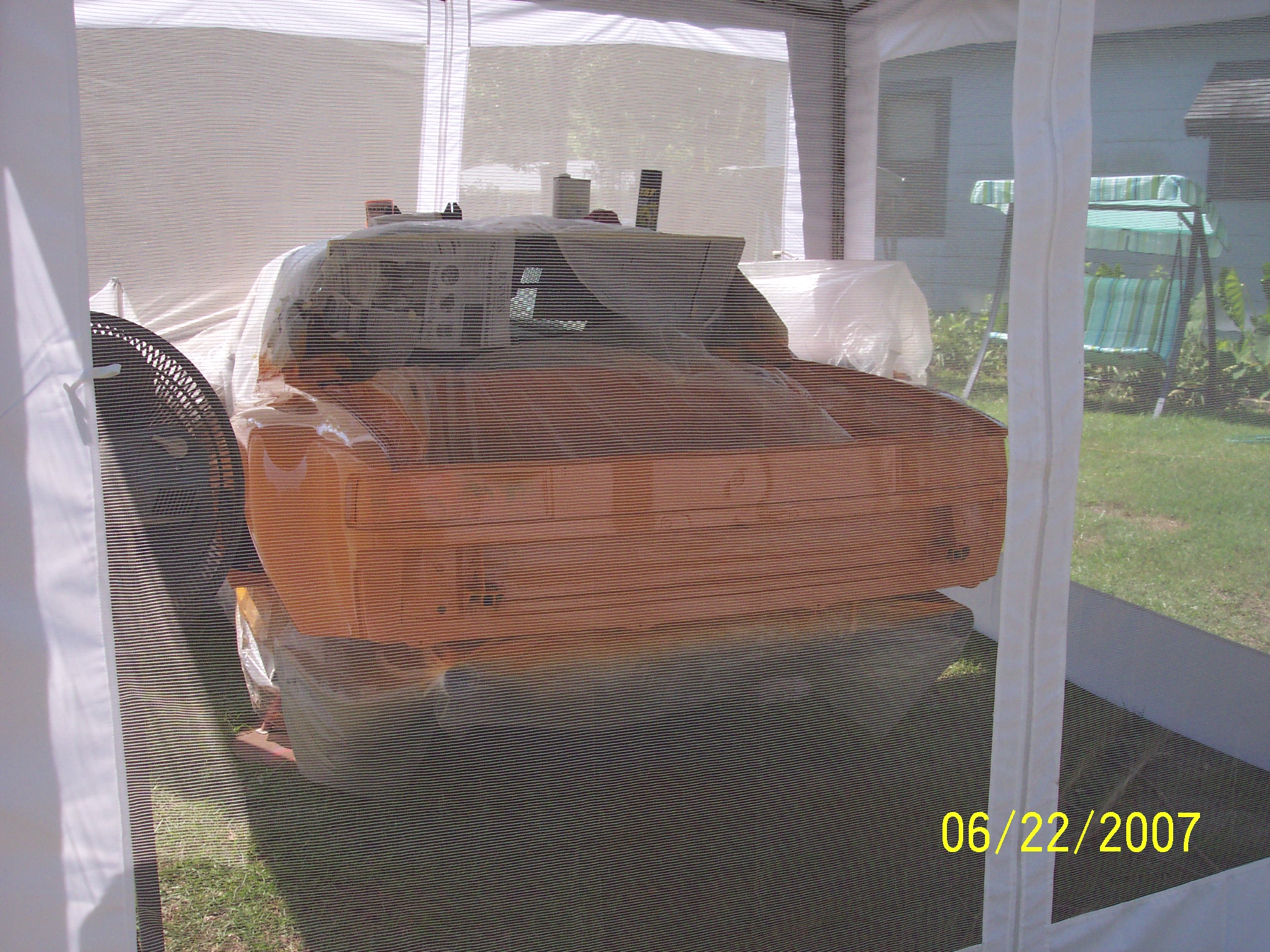 I'm into the final stretch now. I put up my $100.00 outdoor paint booth,and painted the rockers,rear valance,and the inside trunk floor. No bugs or trash in the paint.Color sanding and buffing are gonna be a breeze. That high end Diamont paint can make anyone look like a hero. One more nice weekend of rain free sunshine and the quarters will be painted and this chapter will close. Ron Attached thumbnail(s) Entries on Wednesday 13th June 2007