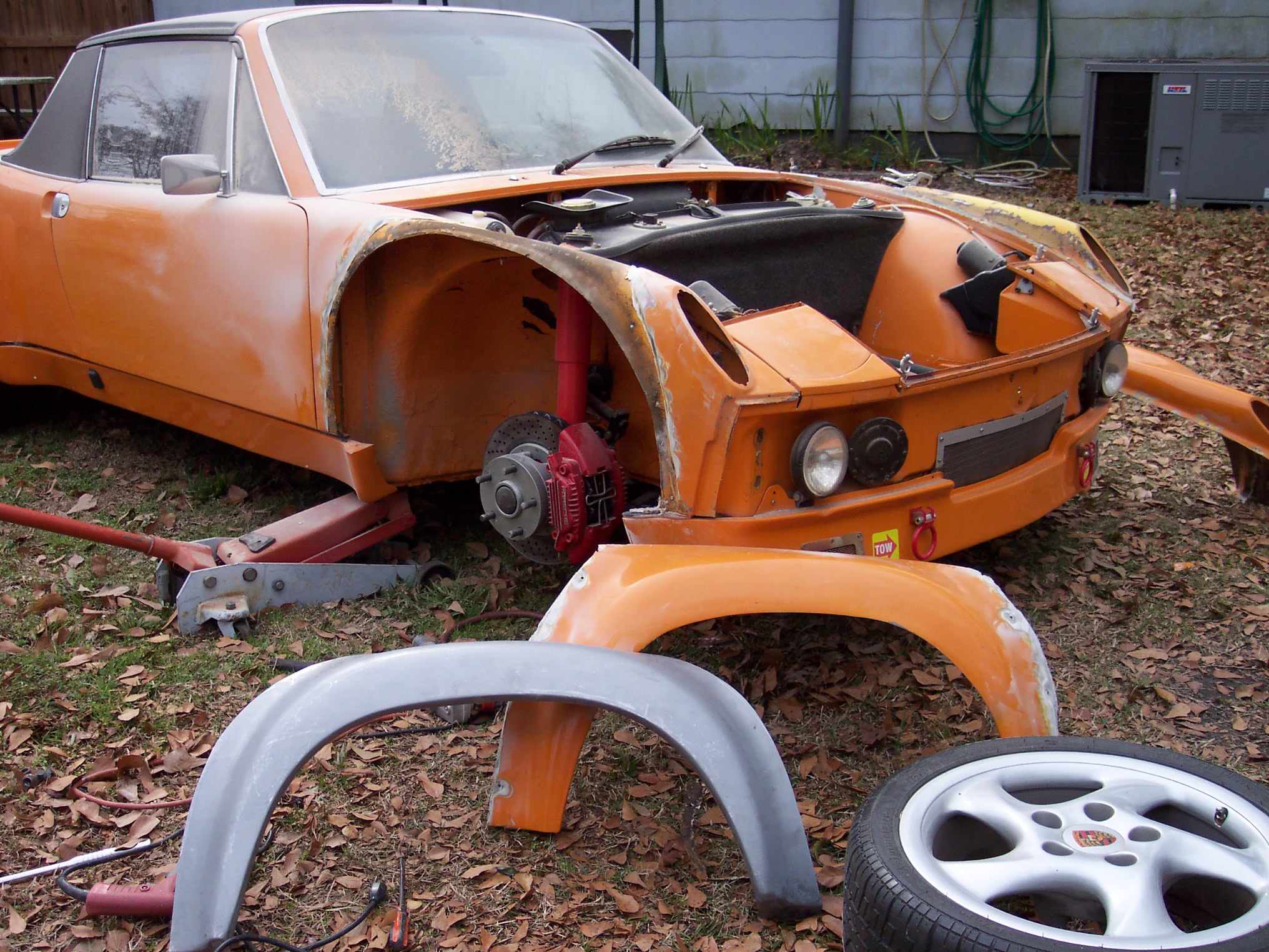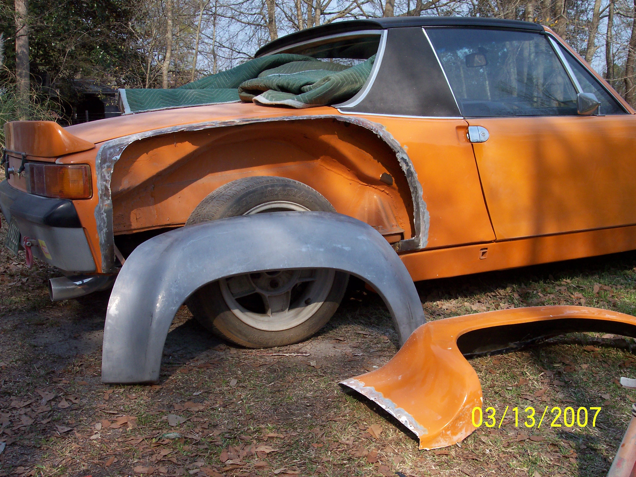 I recently got a set of AA flares,and now is the time to remove & replaced the fiberglass flares that the previous owner installed. The car had some front accident damage sometime in it's past,and the front fenders were covered with a full-fendered flares. It took me a couple of hours to remove them so that they could be reused by someone. Once they were removed,I had a lot of empty space to fill with sheetmetal,but no problem. I have noted however,that with my 930 front brakes,and 18X8 wheels with the 1" spacers that were original to the 78-80 930's,that I will have to roll the fender lip cause they do now rub. Ron Attached thumbnail(s) Entries on Thursday 6th July 2006