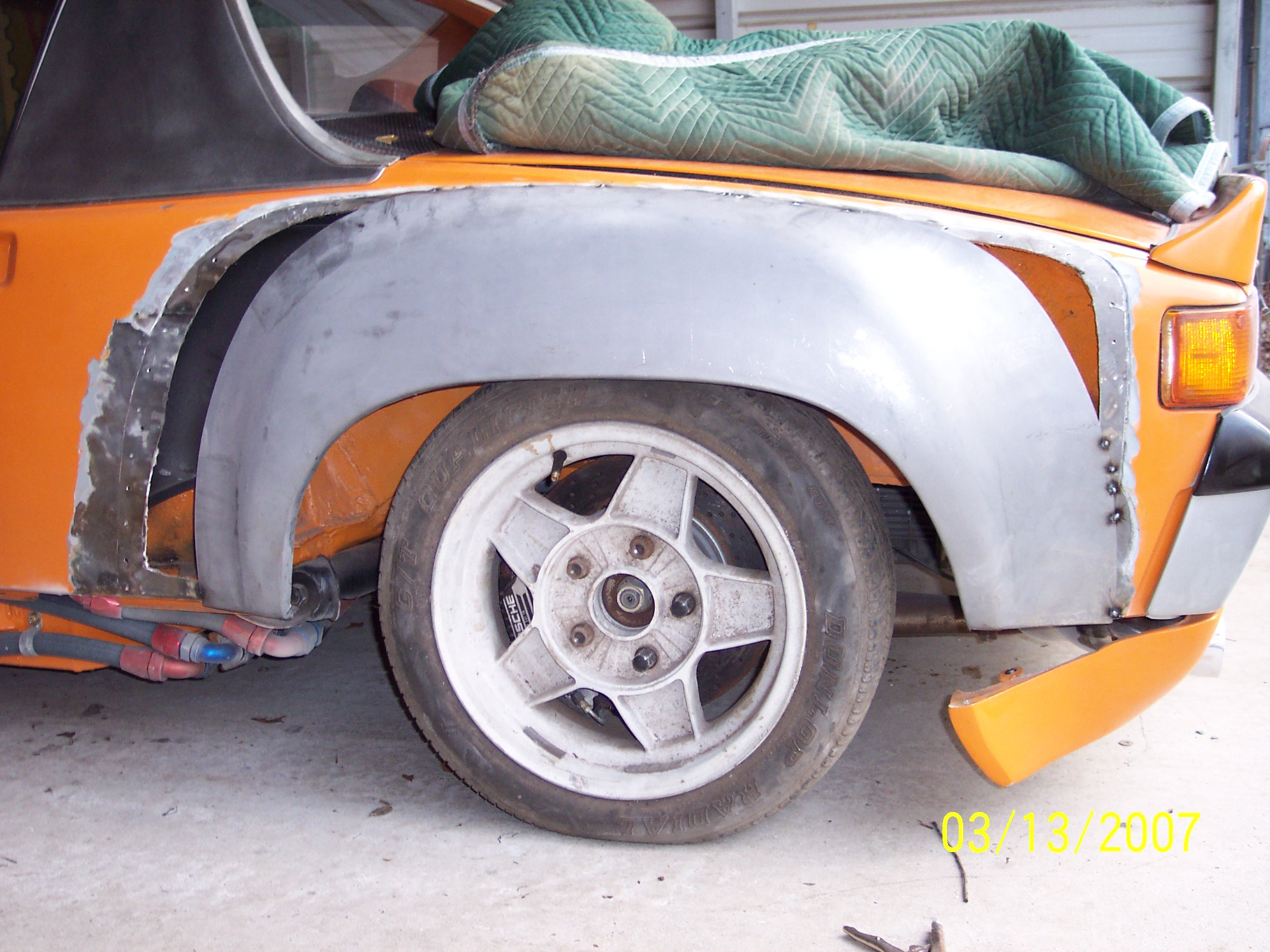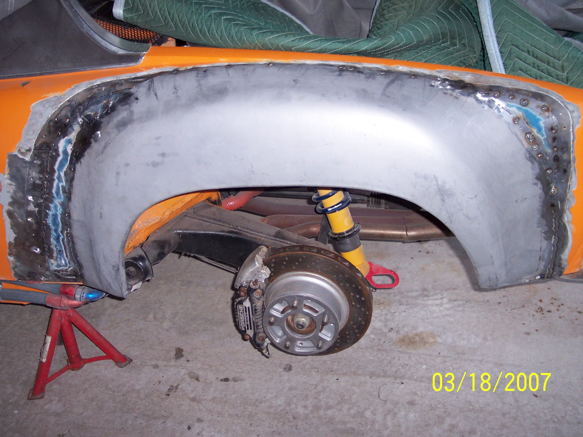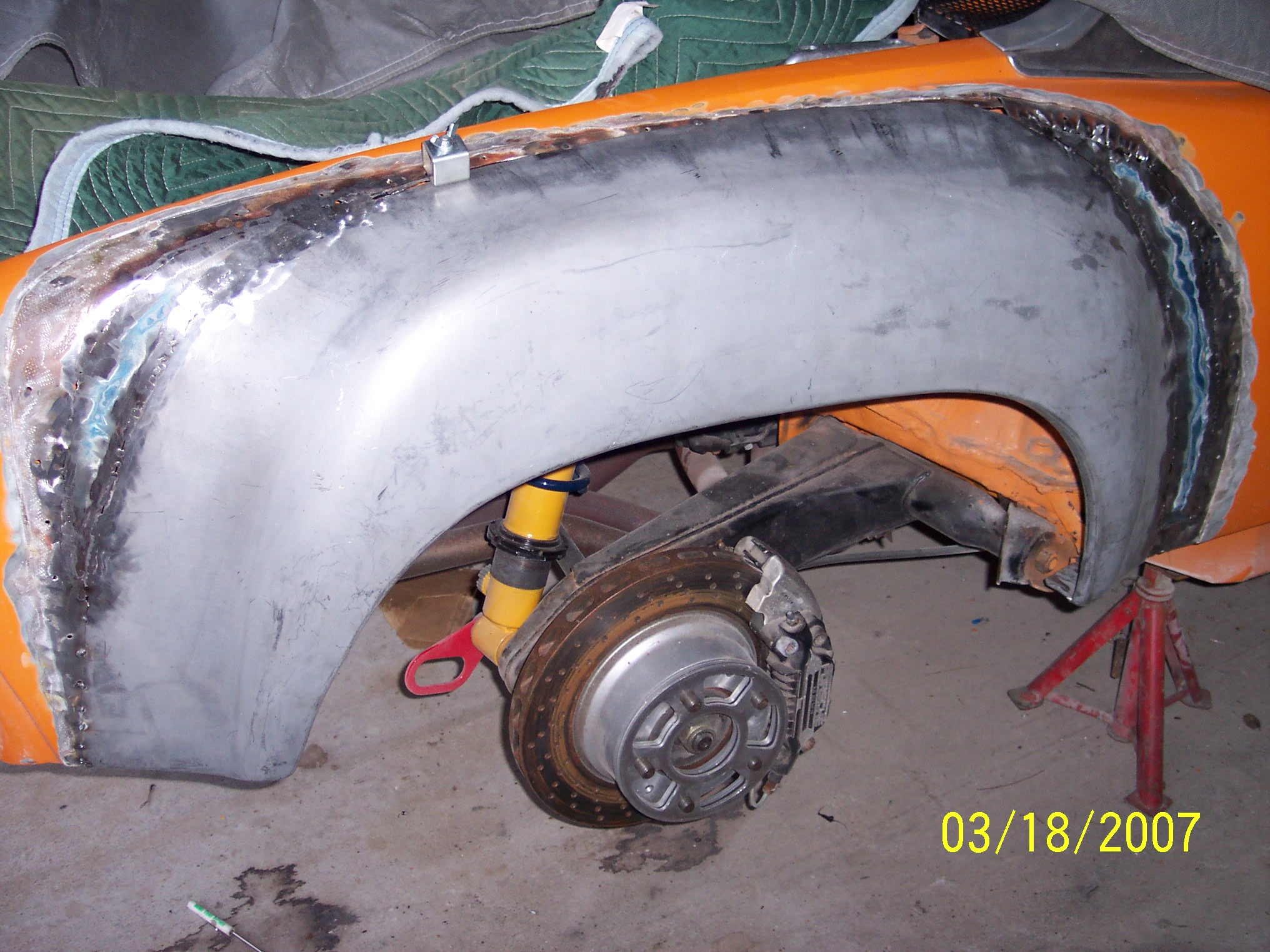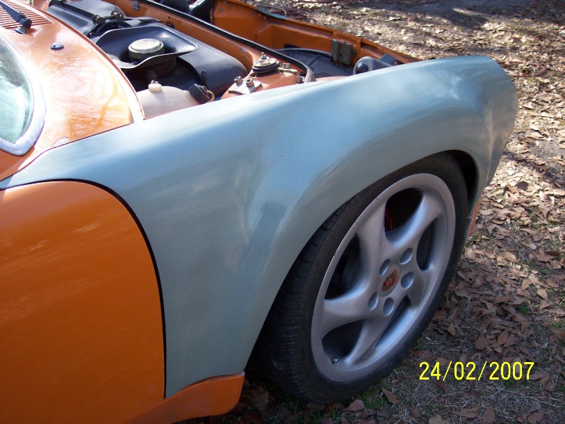 Front flares are now completely fitted,and primed. I've rolled the fender lips,cause the front tires rubbed when turned. For anyone wondering,my front setup is 930 brakes,930 hubs,78 930 front wheel spacers,and the 18X8 front wheels. the front and rear flare ends need a serious amount of fab-work to get them to match the rockers and spoiler.I would suggest that anyone putting on flares have the spoiler and rockers in place to make everything line up before any paint is laid. Ron Attached thumbnail(s) Entries on Tuesday 6th February 2007